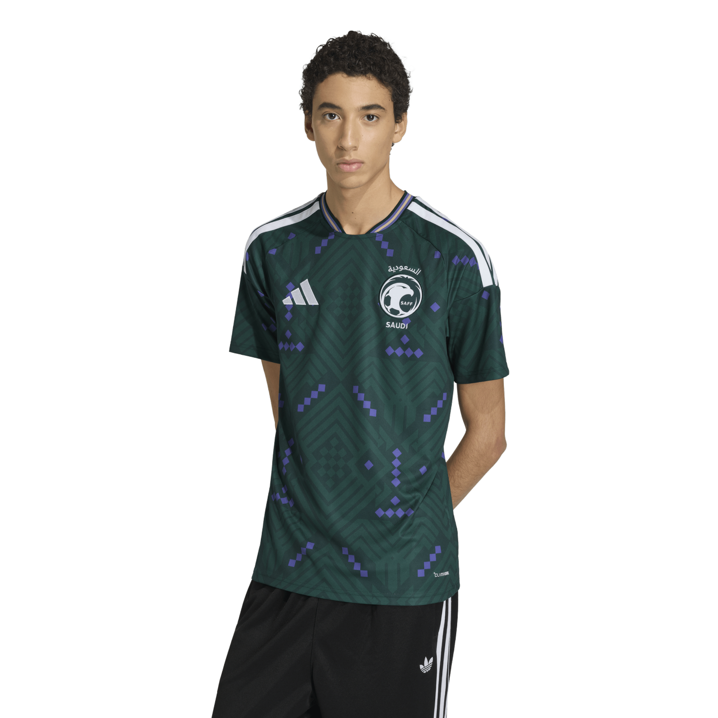Inspired by the country's rich cultural heritage, the Saudi Arabia 26 Home Shirt combines traditional art with a modern twist. The dark-green base is accentuated with hits of purple, creating a striking look. This shirt is crafted with Climacool breathable materials that aid cooling for match-day comfort. The interlock fabric further provides a comfortable fit, while the slim design offers a sleek silhouette. The embroidered adidas logo and club crest are displayed proudly with more than a touch of class. Whether you're cheering from the stands or playing a match, show your support for Saudi Arabia in style with this authentic shirt.