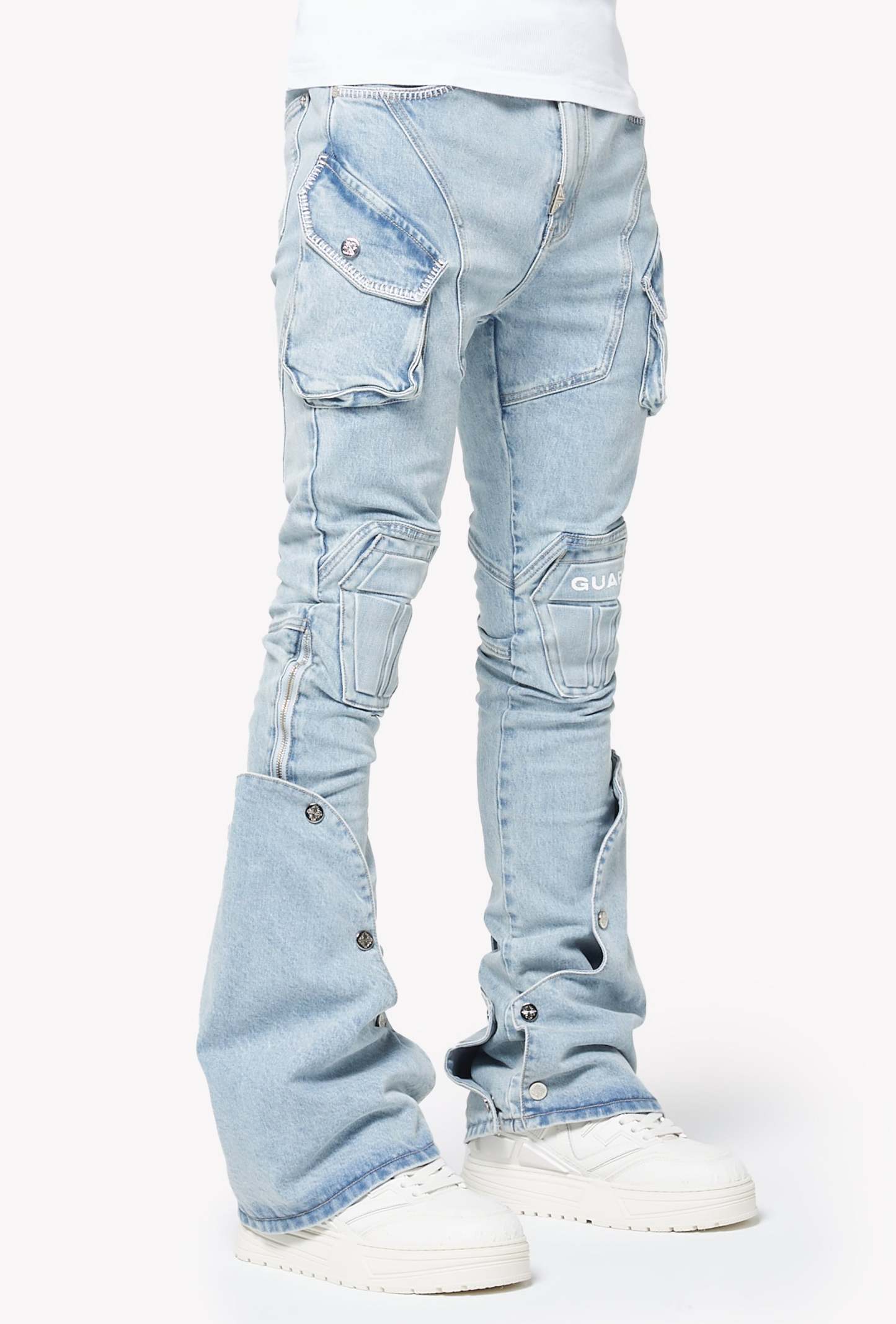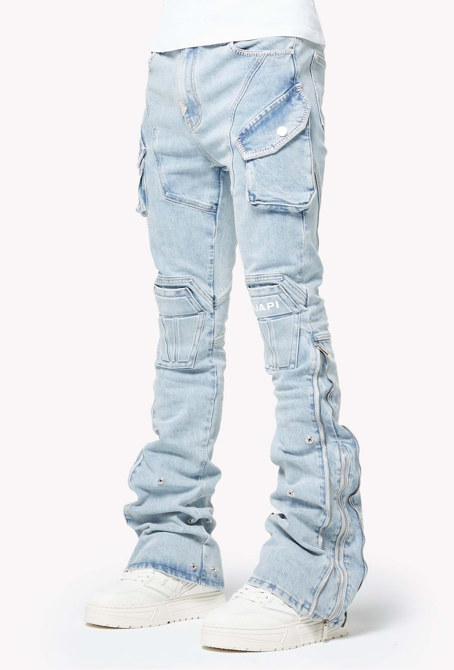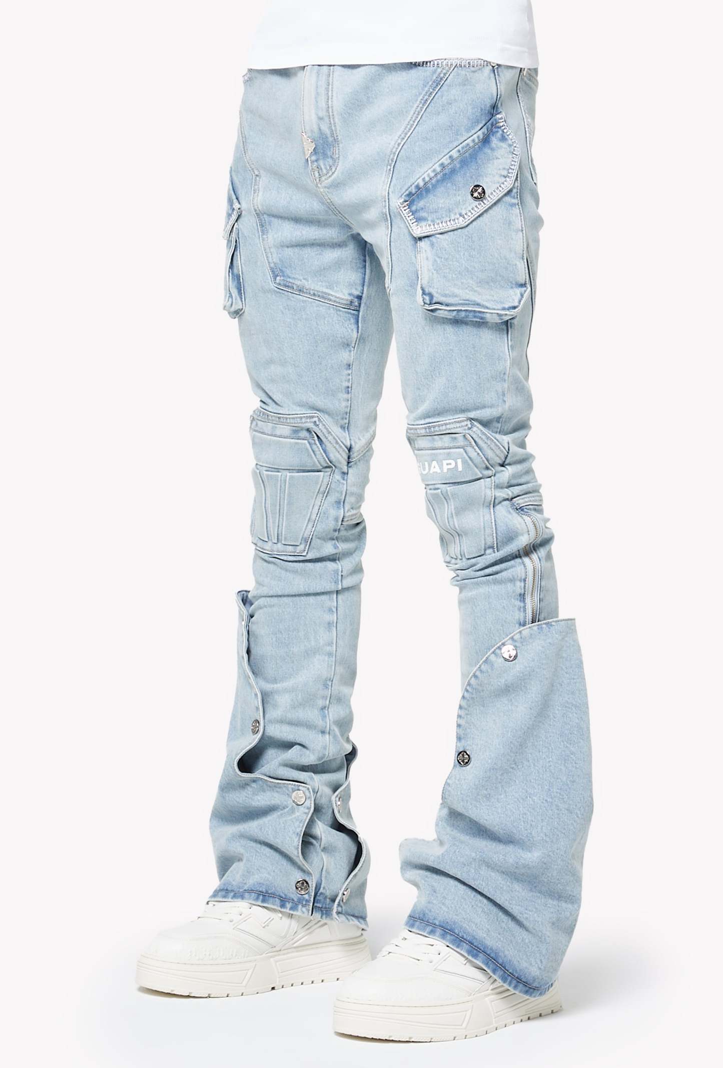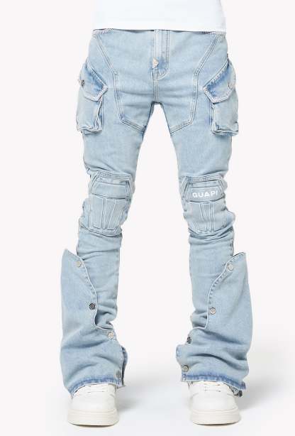 A standout piece designed with GUAPI’s signature futuristic tailoring, the Aqua Blue Coffin Arc Denim blends structural panel work with a washed-out sky-blue tone for a bold streetwear silhouette. The denim features sculpted coffin-shaped knee panels, layered cargo pocket detailing, and extended flare panels along the lower leg that open outward with snap buttons. The entire construction follows GUAPI’s engineered arc patterning, creating a sharp, contoured shape from hip to hem.