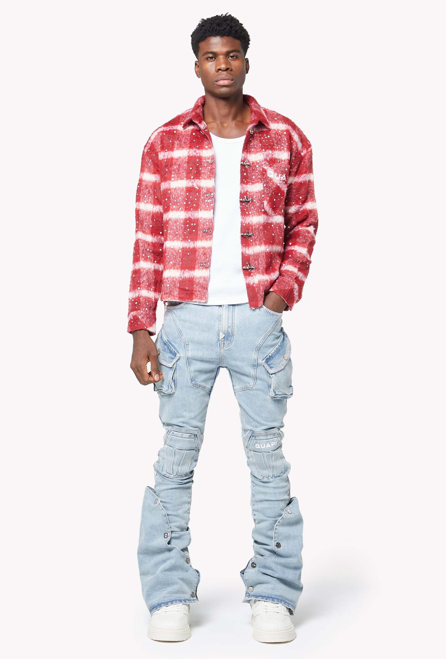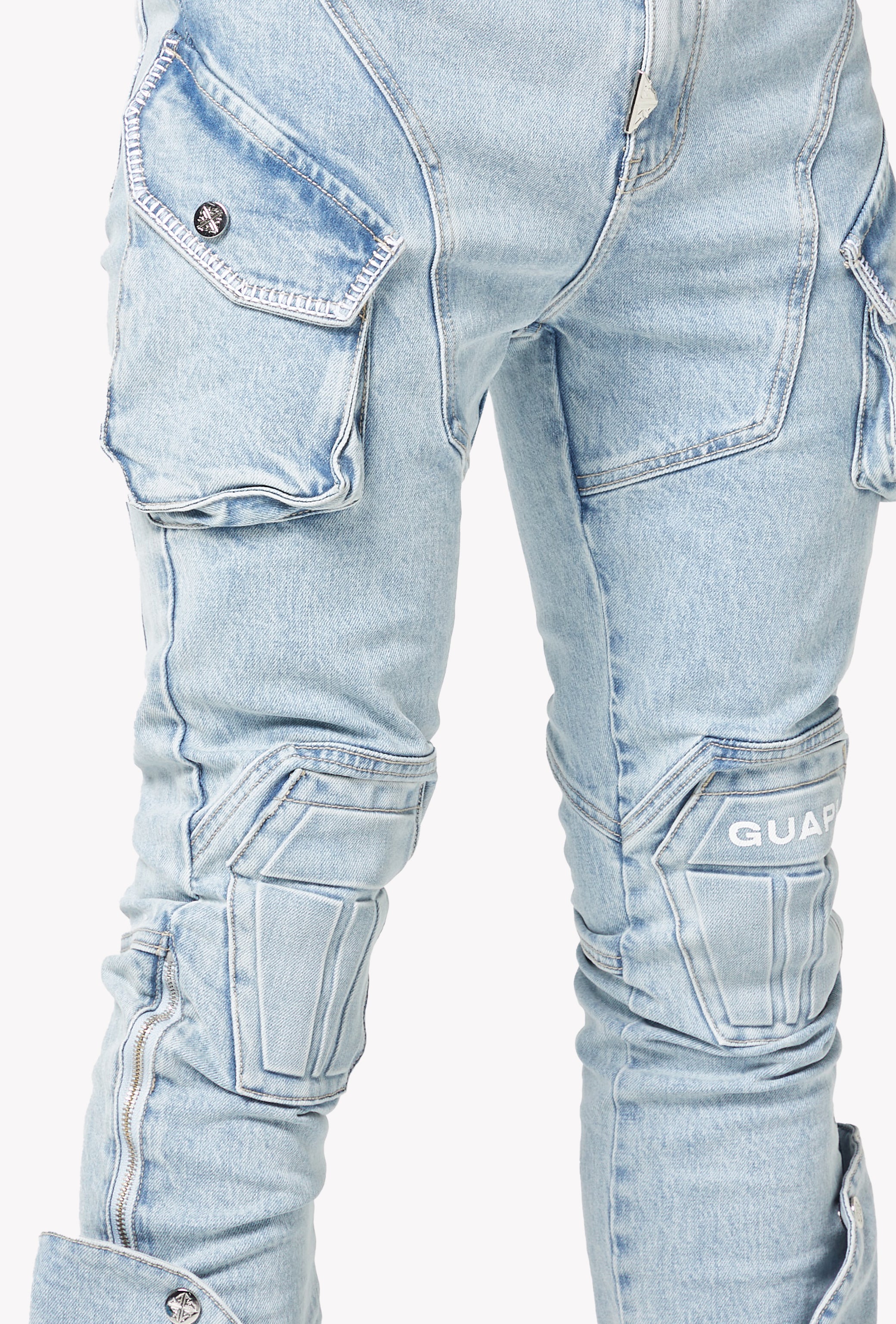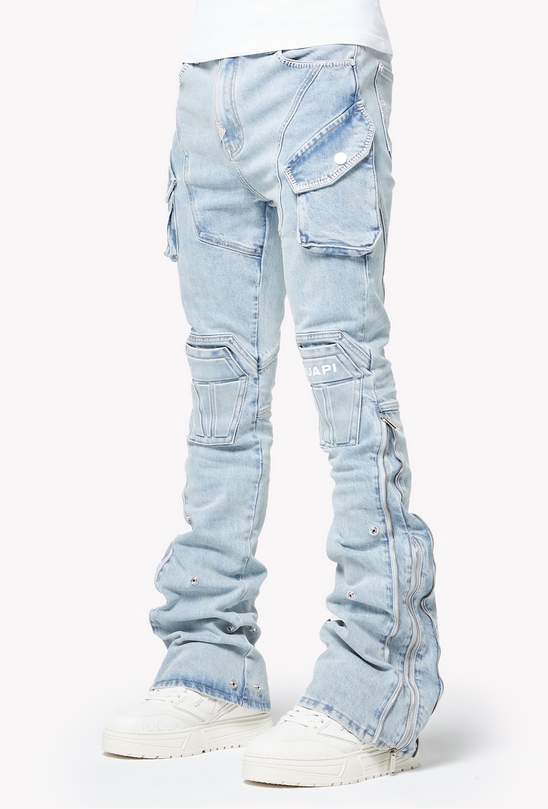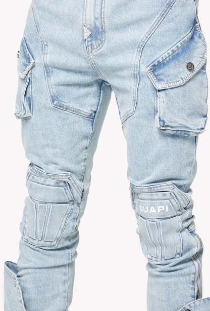 A standout piece designed with GUAPI’s signature futuristic tailoring, the Aqua Blue Coffin Arc Denim blends structural panel work with a washed-out sky-blue tone for a bold streetwear silhouette. The denim features sculpted coffin-shaped knee panels, layered cargo pocket detailing, and extended flare panels along the lower leg that open outward with snap buttons. The entire construction follows GUAPI’s engineered arc patterning, creating a sharp, contoured shape from hip to hem.