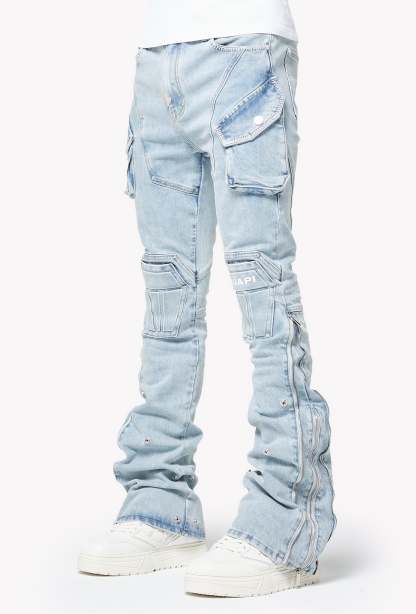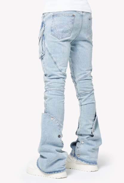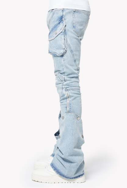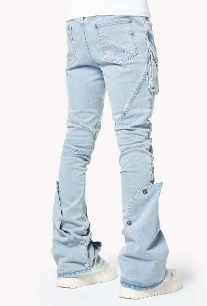 The wash is a soft ice-blue with natural fading, giving a vintage sun-bleached look while highlighting every seam, panel, and fold. Multi-texture detailing across the knees and pockets adds dimension, while the logo embroidery sits cleanly on the right knee panel. Dual zippers run along the inner and outer legs, enhancing the stacked drape and allowing multiple styling options. The extended flare cuffs can be opened fully for a dramatic split-leg silhouette or snapped down for a more structured shape.