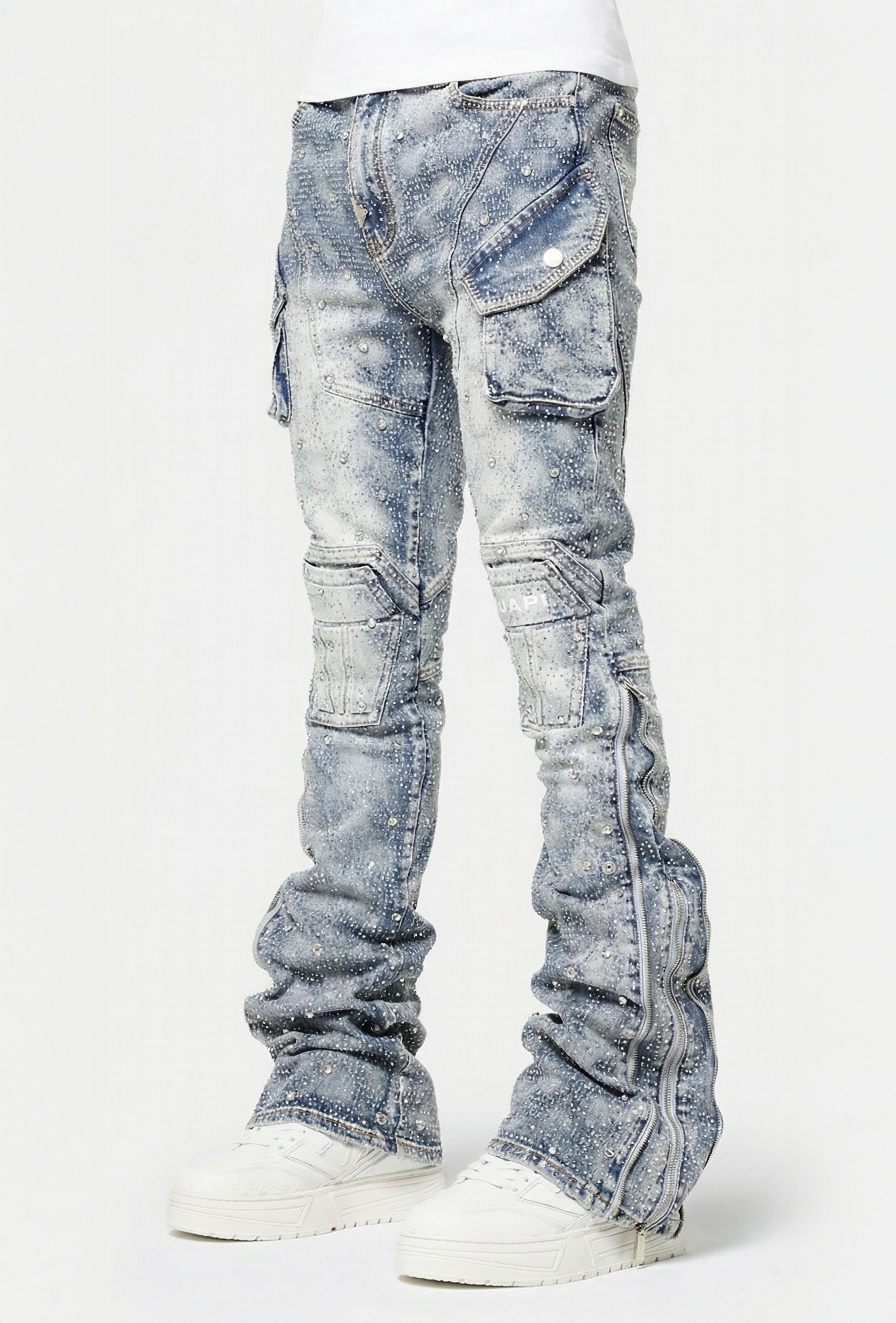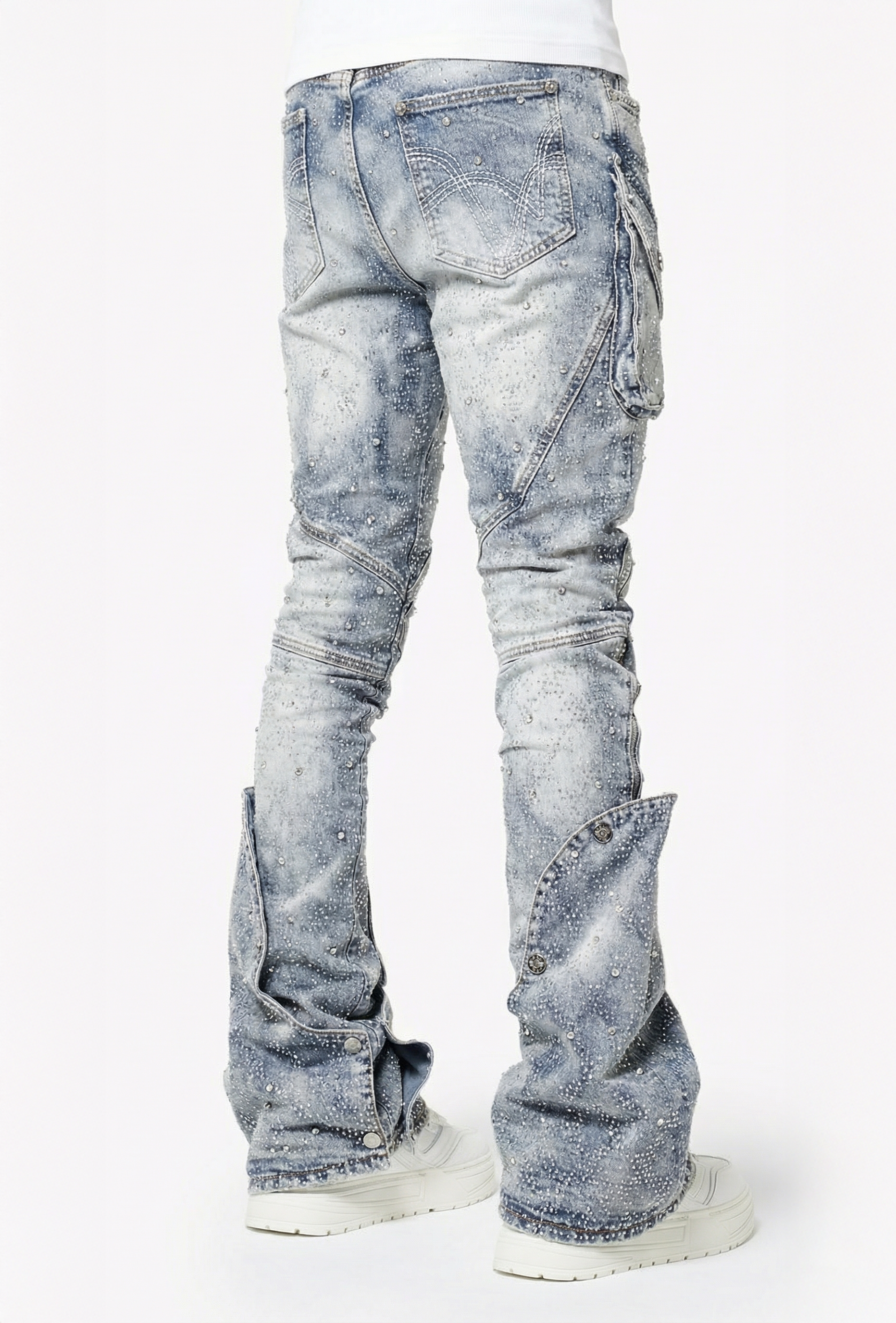 The wash is a soft ice-blue with natural fading, giving a vintage sun-bleached look while highlighting every seam, panel, and fold. Multi-texture detailing across the knees and pockets adds dimension, while the logo embroidery sits cleanly on the right knee panel. Dual zippers run along the inner and outer legs, enhancing the stacked drape and allowing multiple styling options. The extended flare cuffs can be opened fully for a dramatic split-leg silhouette or snapped down for a more structured shape.