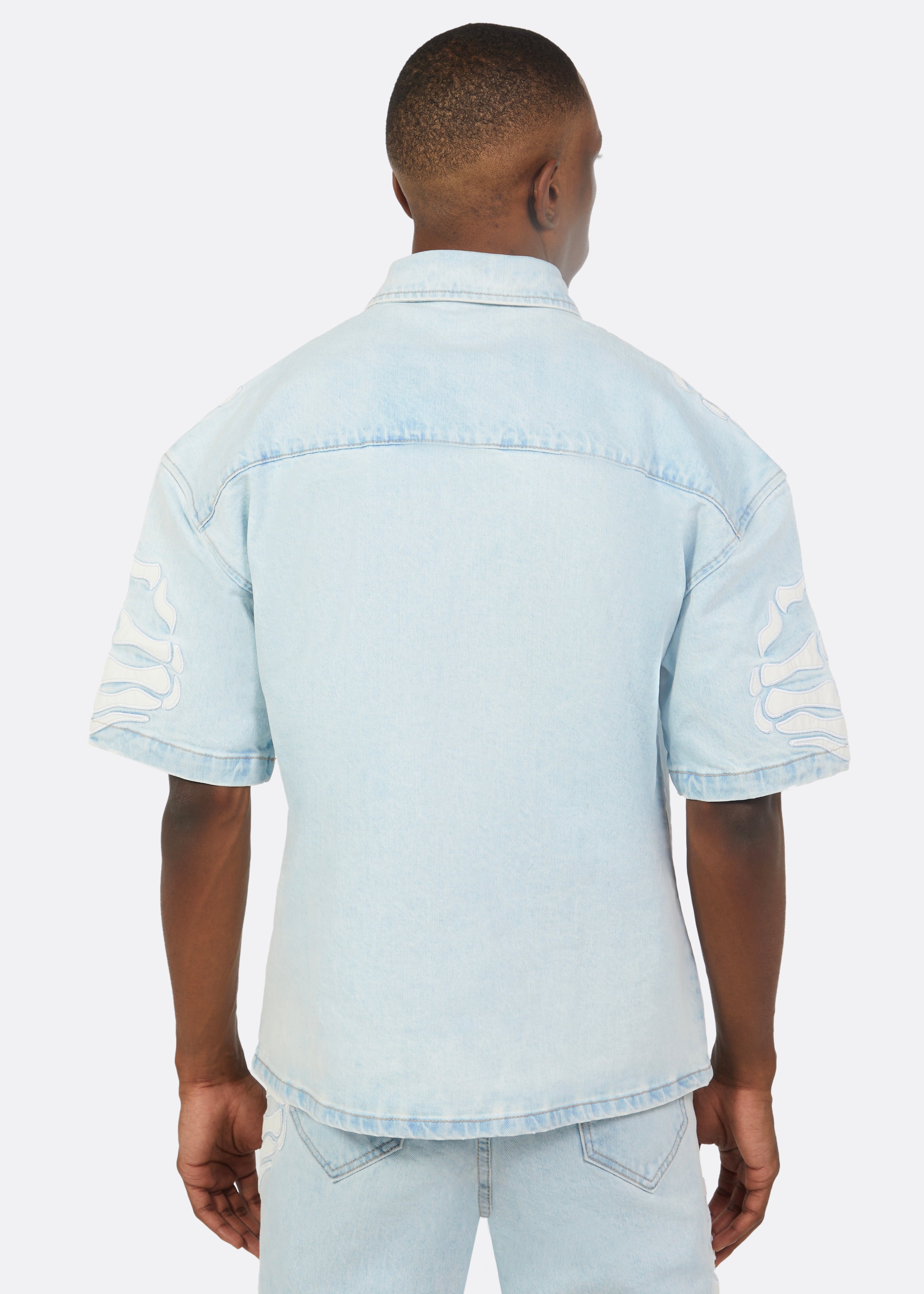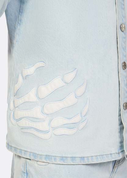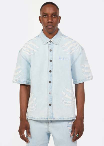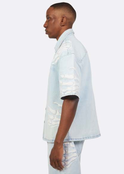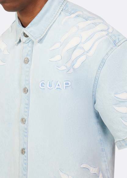 Make a bold statement with the GUAPI Aqua Blue Hell Dragger Denim Shirt. Crafted from 100% premium cotton denim, this shirt features an eye-catching embroidered skeleton pattern across the sleeves and chest, adding a unique, edgy twist to classic denim. The GUAPI logo is subtly embroidered on the chest, enhancing its exclusive look without overpowering the design. With a relaxed fit and short sleeves, this shirt is perfect for layering or wearing solo to elevate any streetwear outfit.