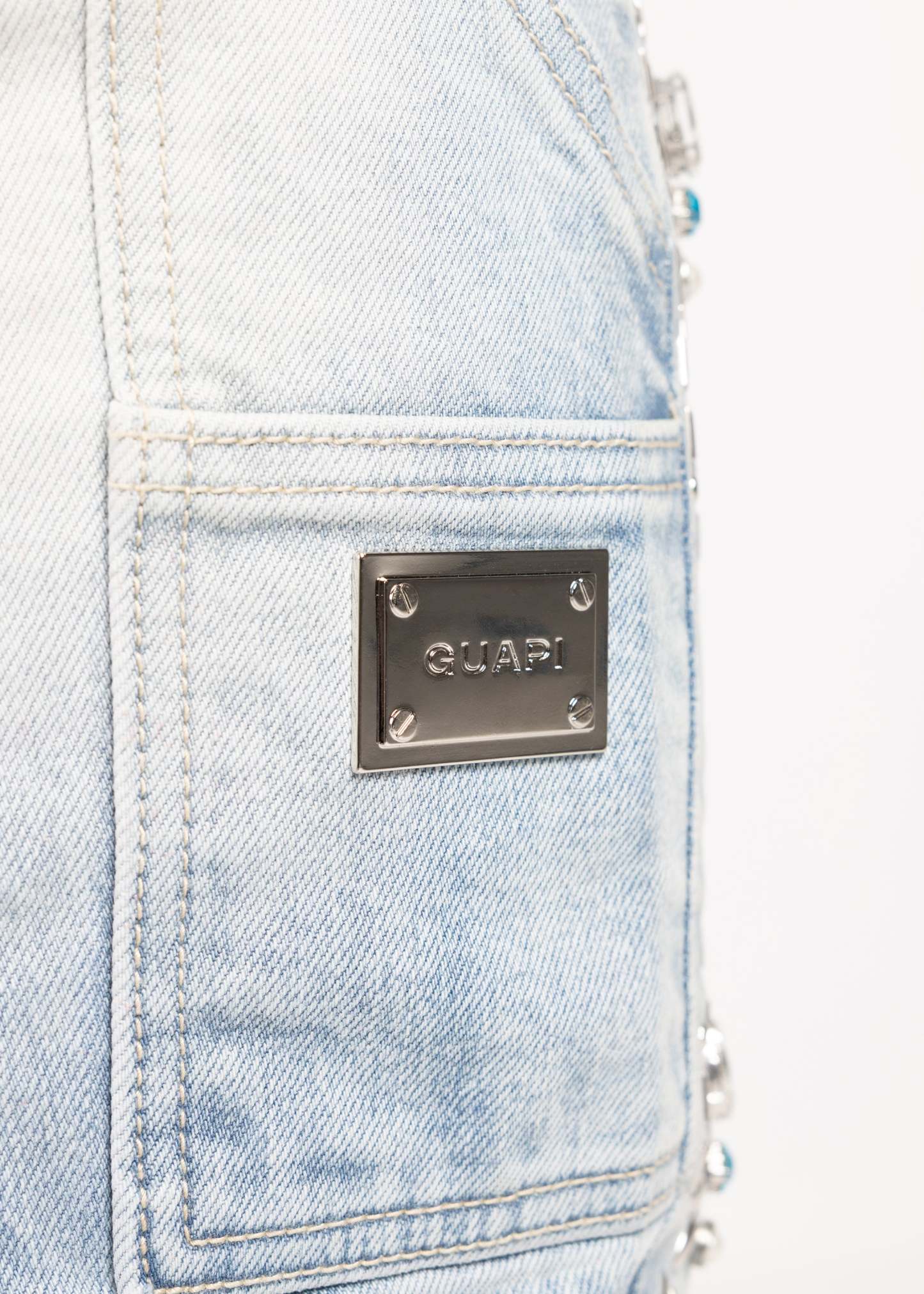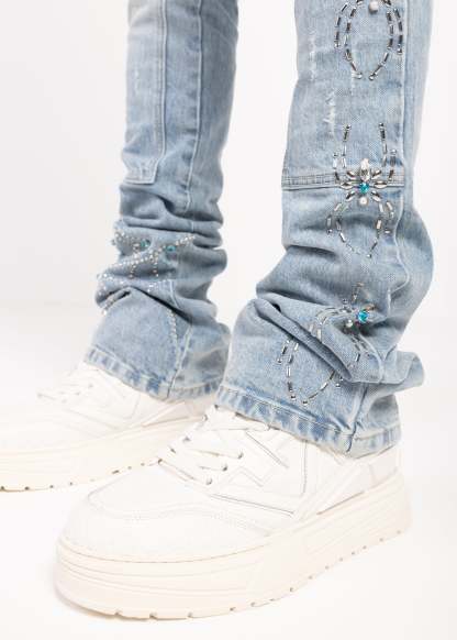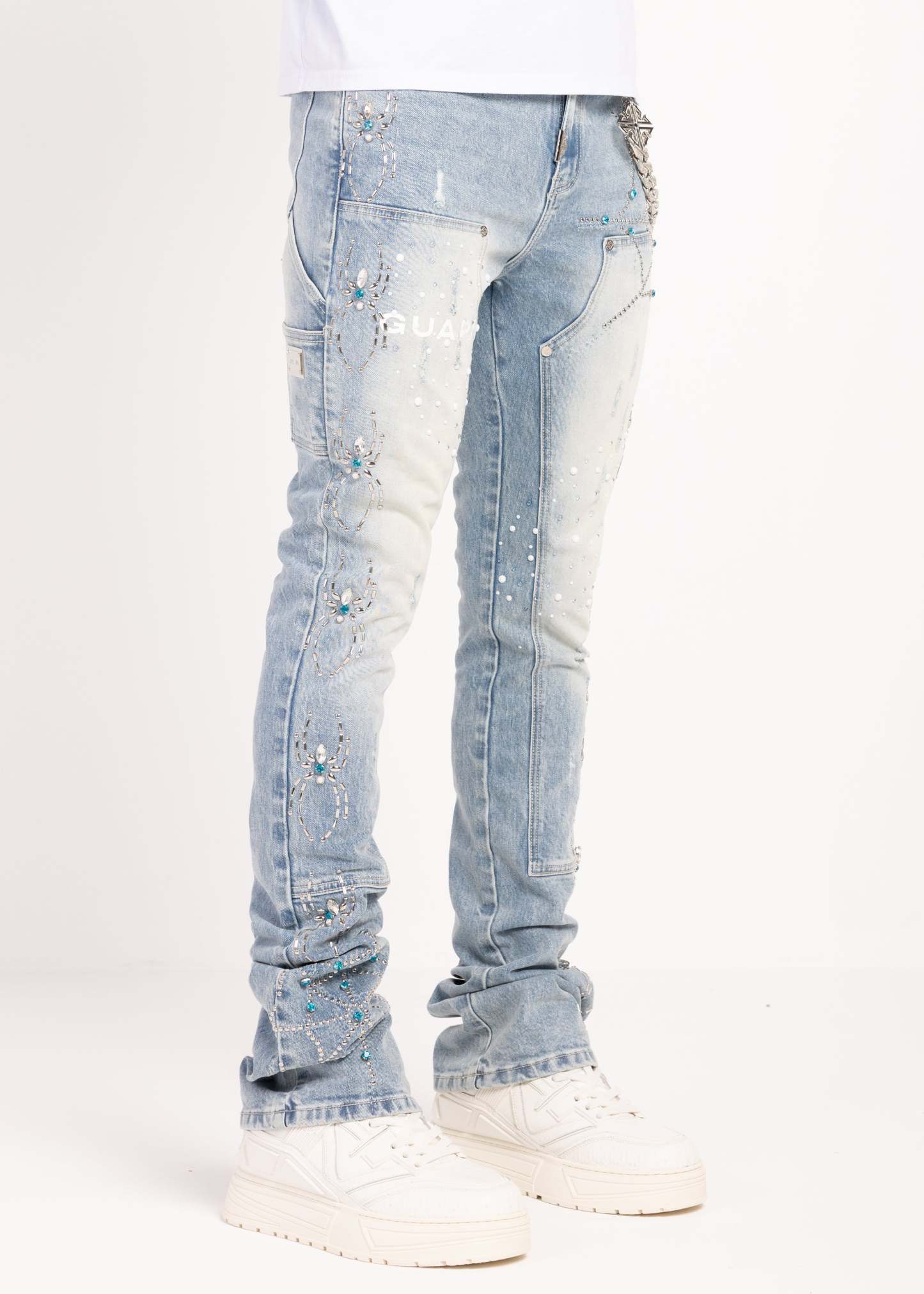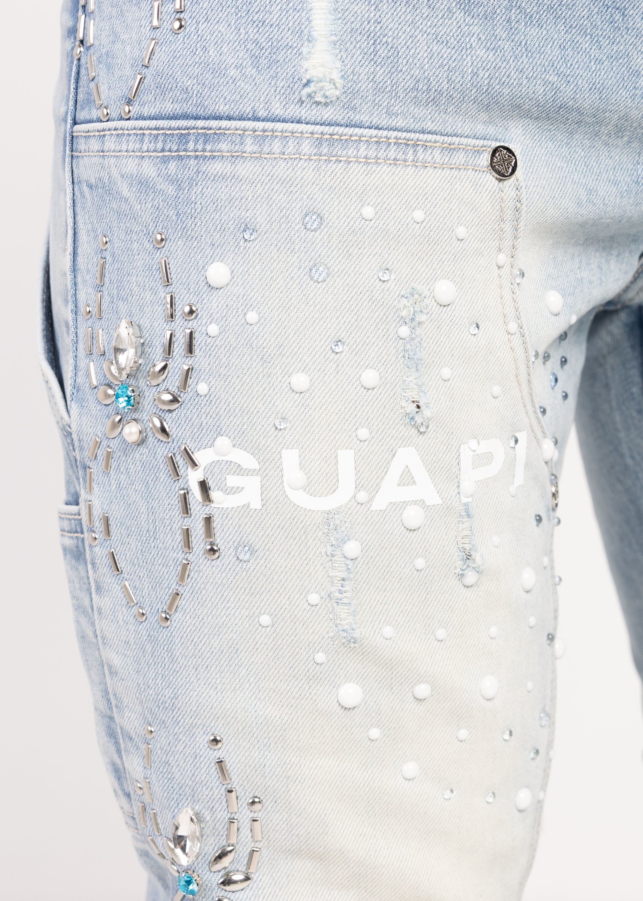 Across the legs, stitched spider motifs march in a structured repeat, each one finished with turquoise-toned stones that catch light without overdoing it. Web-inspired panel work adds a graphic edge, with dotted stud placements that feel intentional and architectural. On the left thigh, a bold GUAPI hit is set into a washed panel, giving the front a signature focal point.
