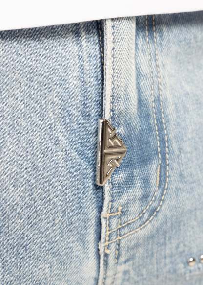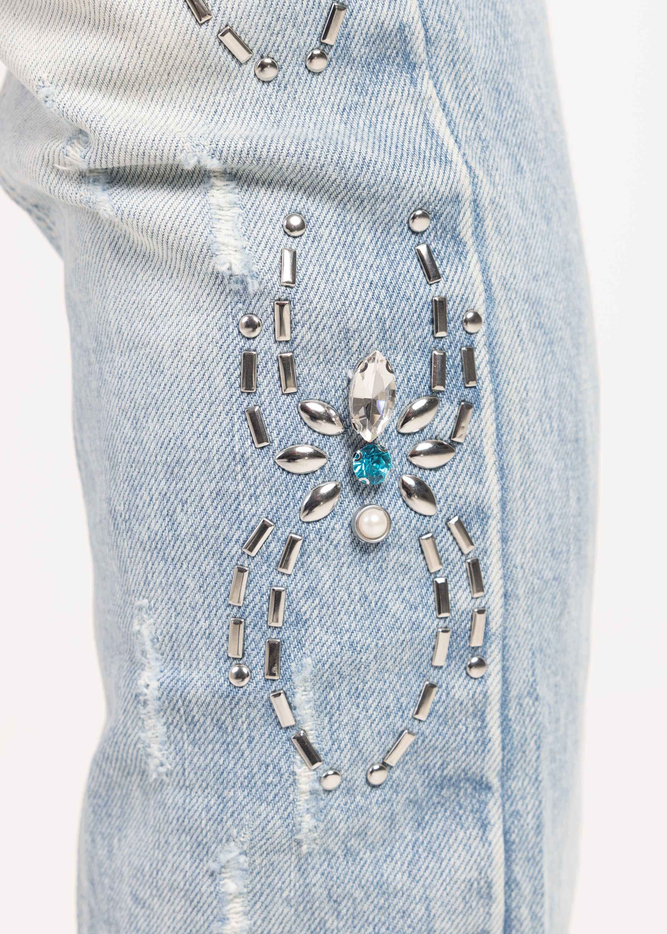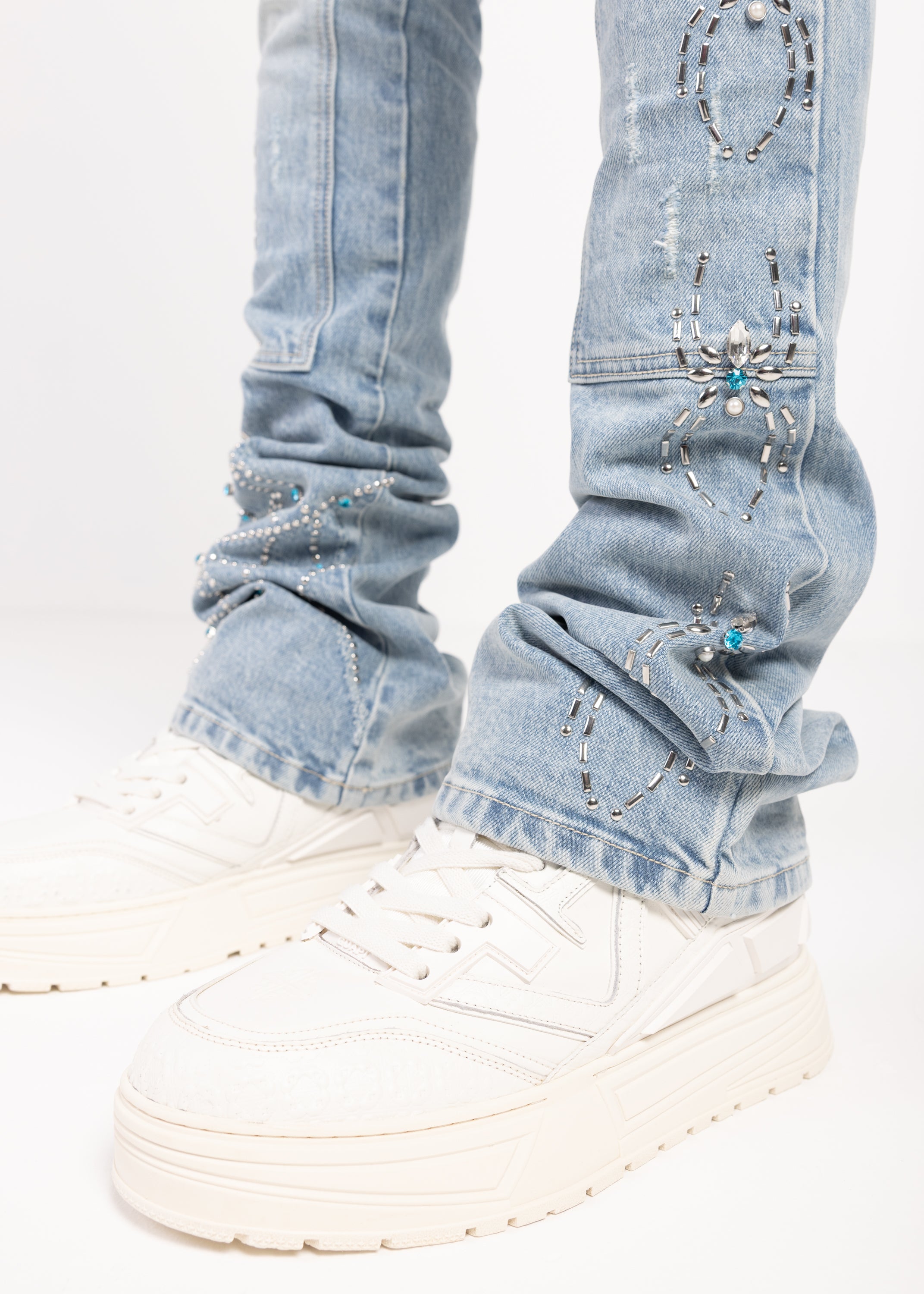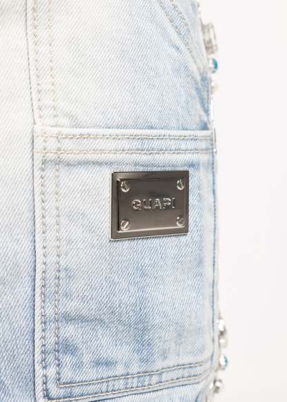 Across the legs, stitched spider motifs march in a structured repeat, each one finished with turquoise-toned stones that catch light without overdoing it. Web-inspired panel work adds a graphic edge, with dotted stud placements that feel intentional and architectural. On the left thigh, a bold GUAPI hit is set into a washed panel, giving the front a signature focal point.