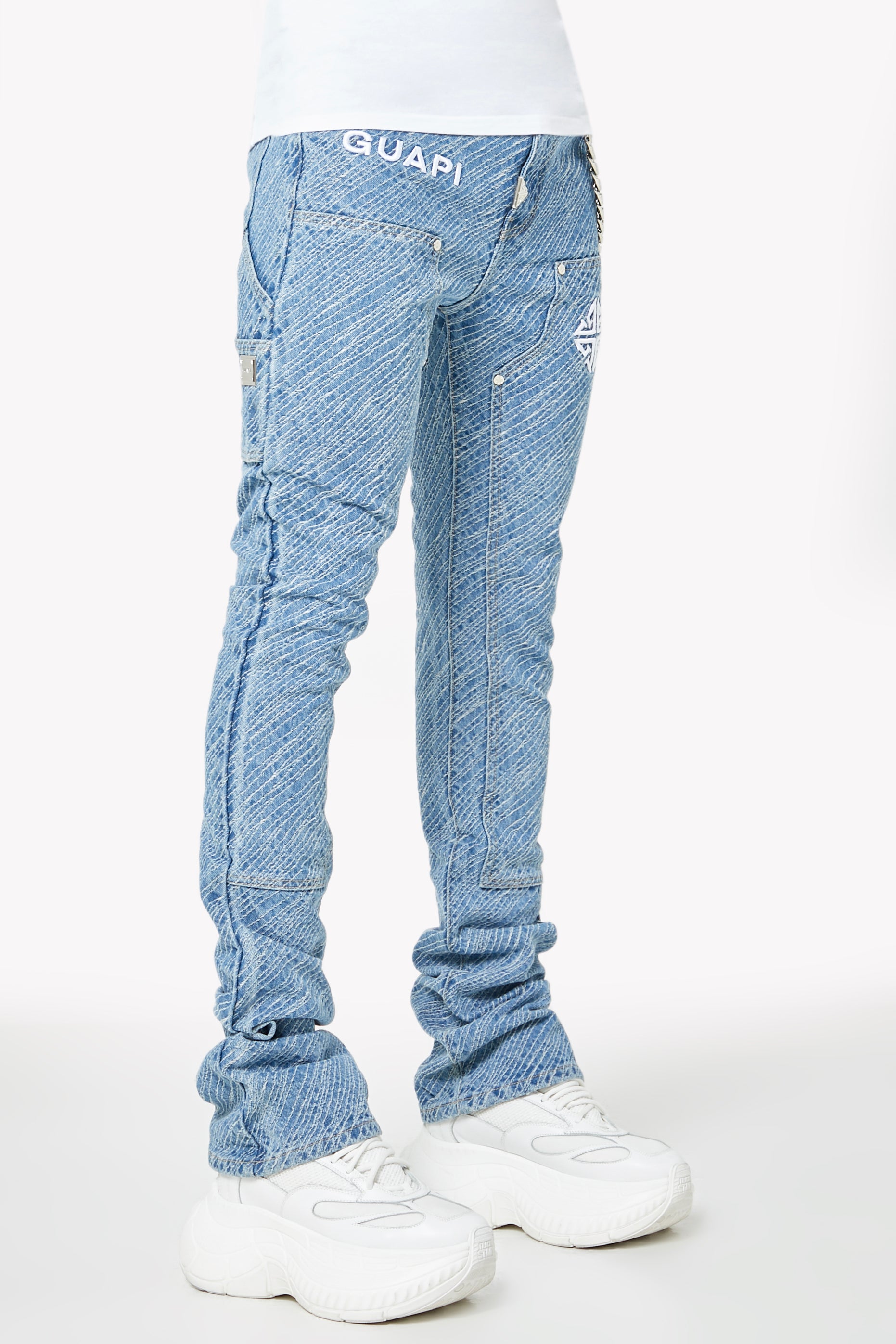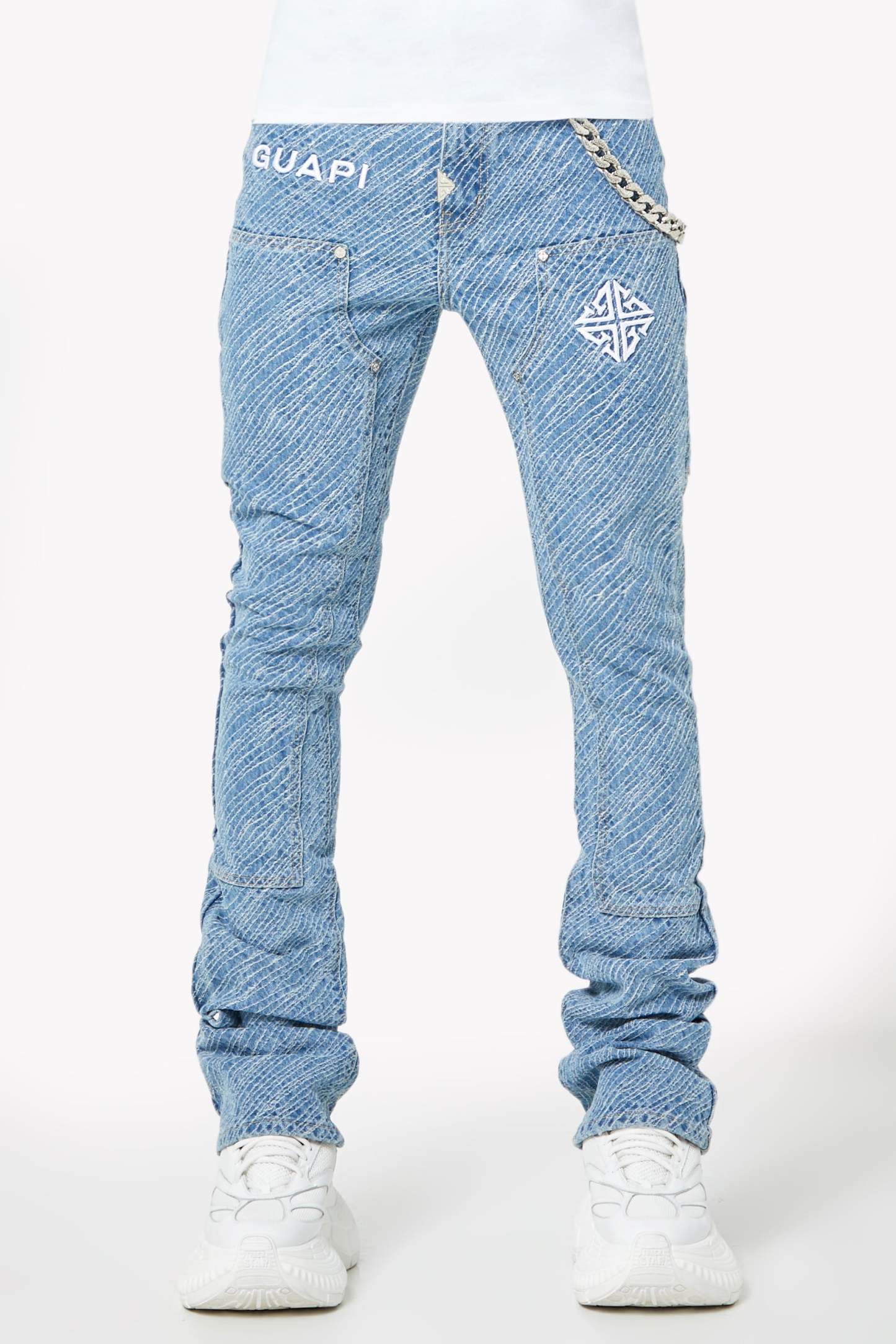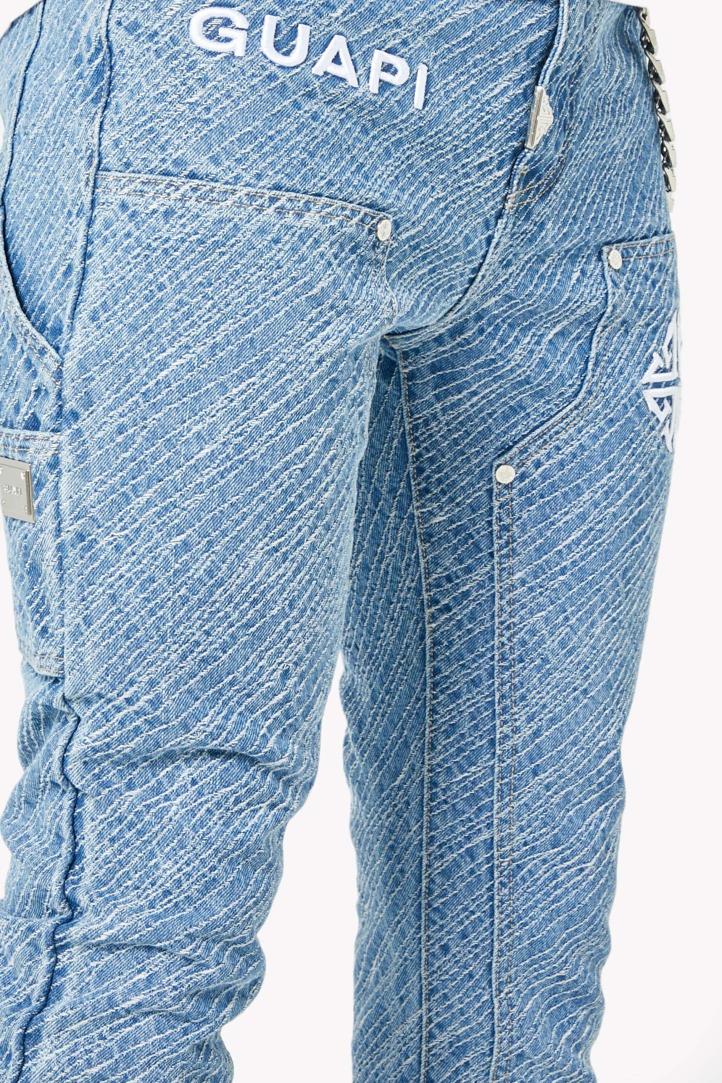 Unleash bold energy with the Aqua Blue Striker Denim, engineered for those who move with purpose and style. These jeans make a visual impact through an electric all-over textured stripe wash, adding depth and attitude to every step. Featuring embroidered GUAPI branding and an assertive silhouette, this piece is crafted to energize your fit with a striking streetwear edge.