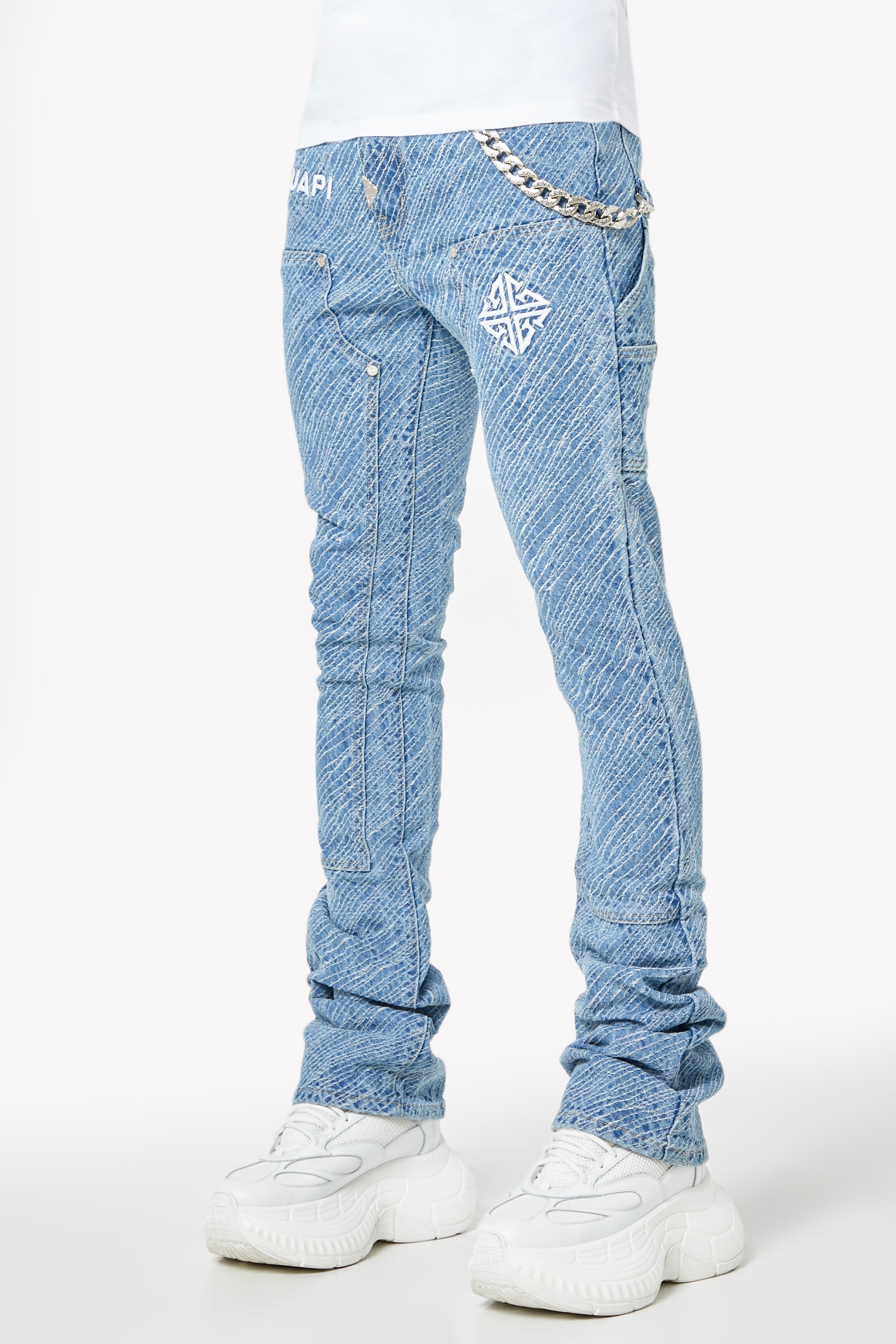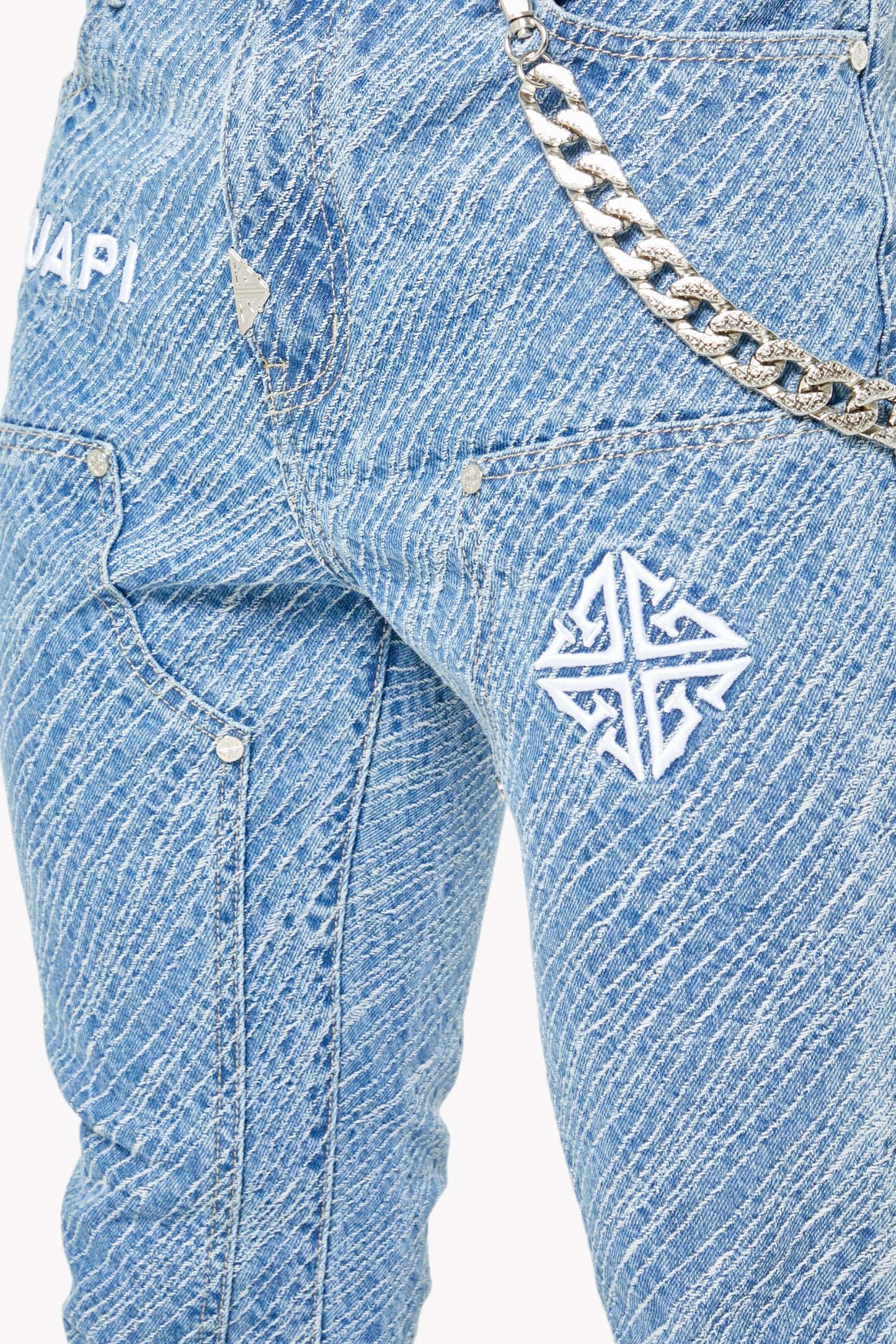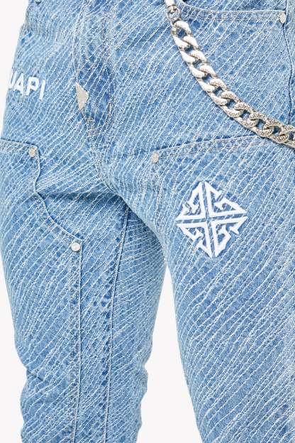 Unleash bold energy with the Aqua Blue Striker Denim, engineered for those who move with purpose and style. These jeans make a visual impact through an electric all-over textured stripe wash, adding depth and attitude to every step. Featuring embroidered GUAPI branding and an assertive silhouette, this piece is crafted to energize your fit with a striking streetwear edge.