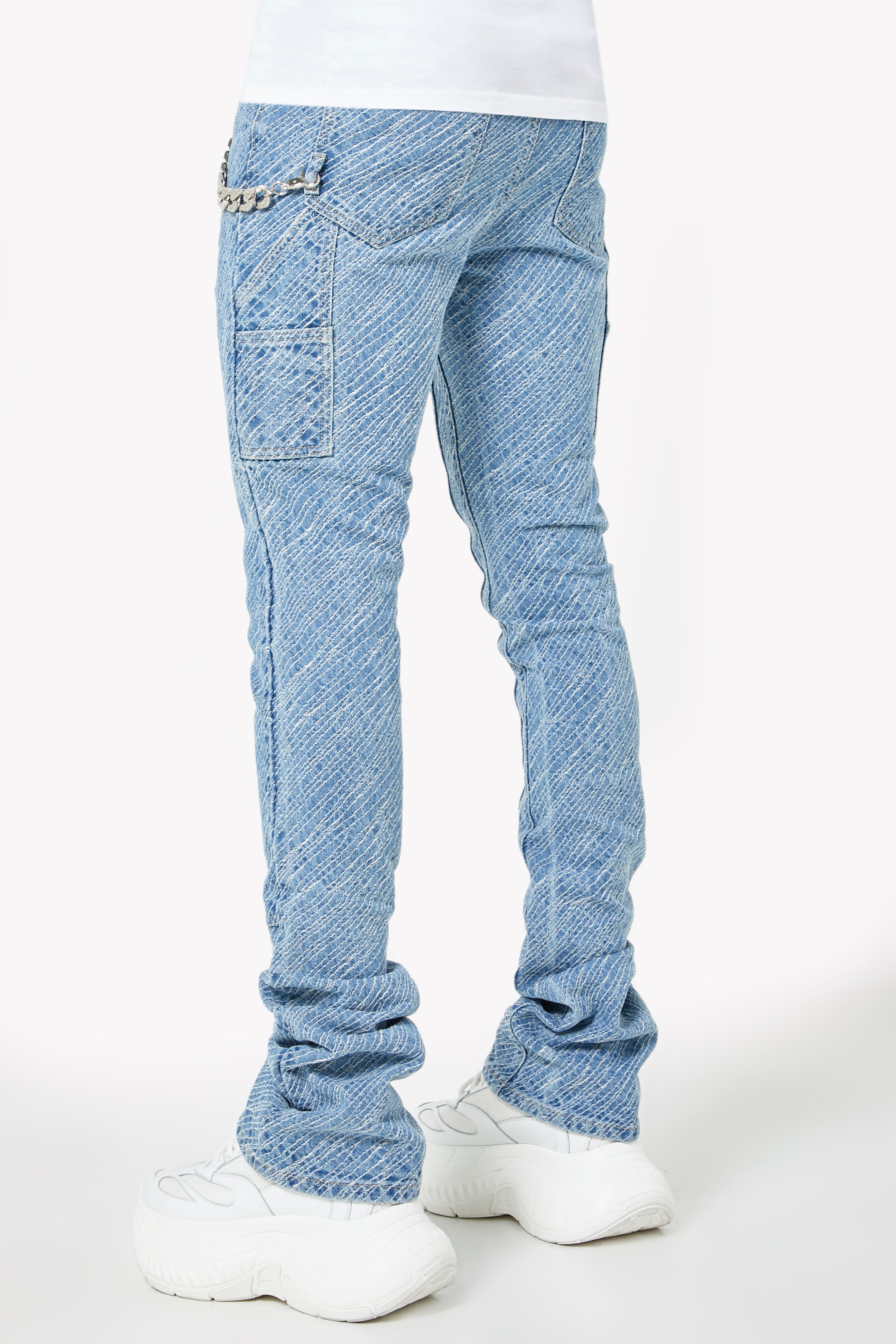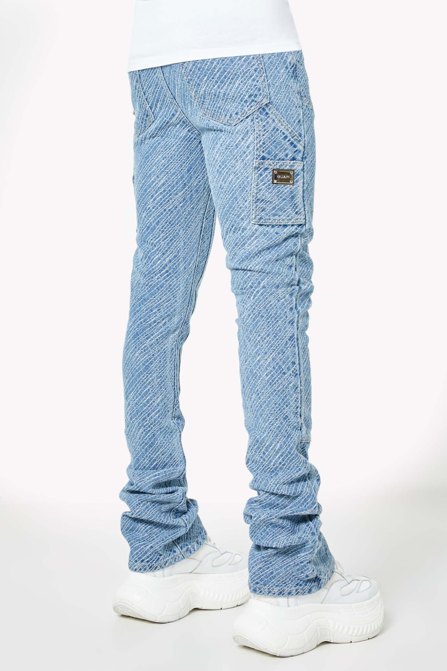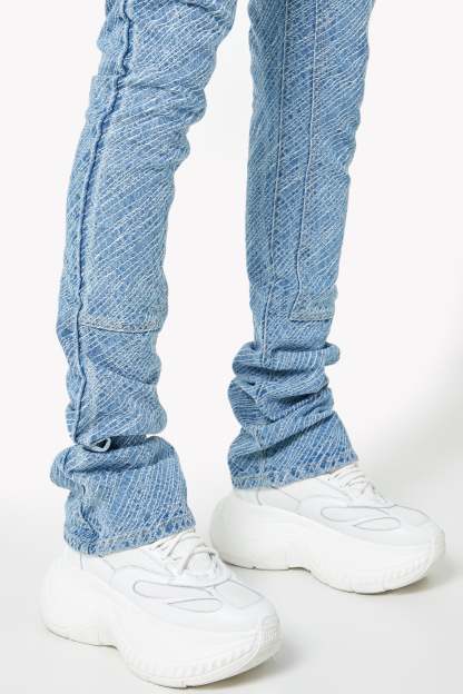 Premium aqua blue denim construction with stacked finish