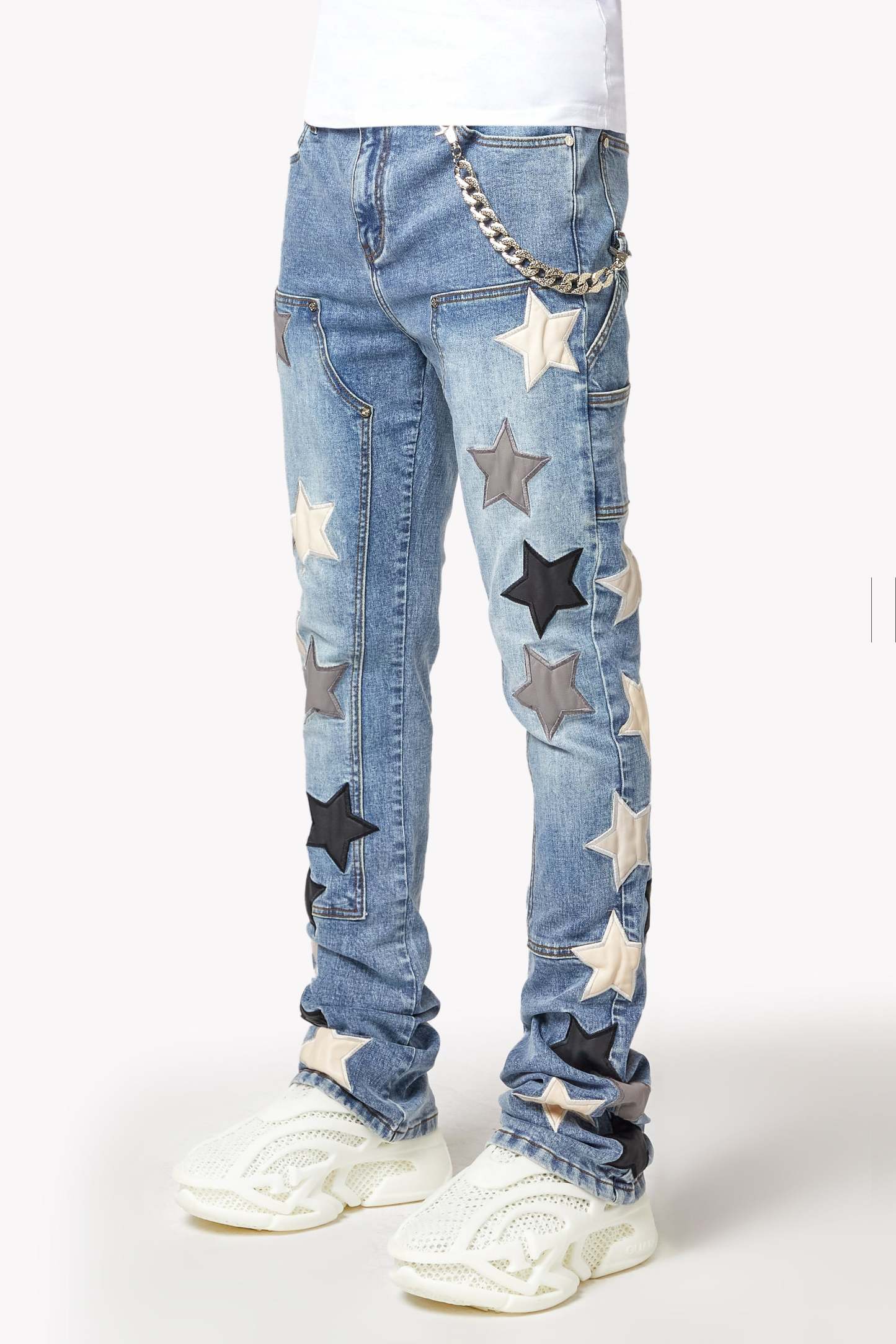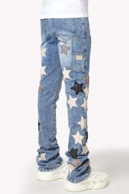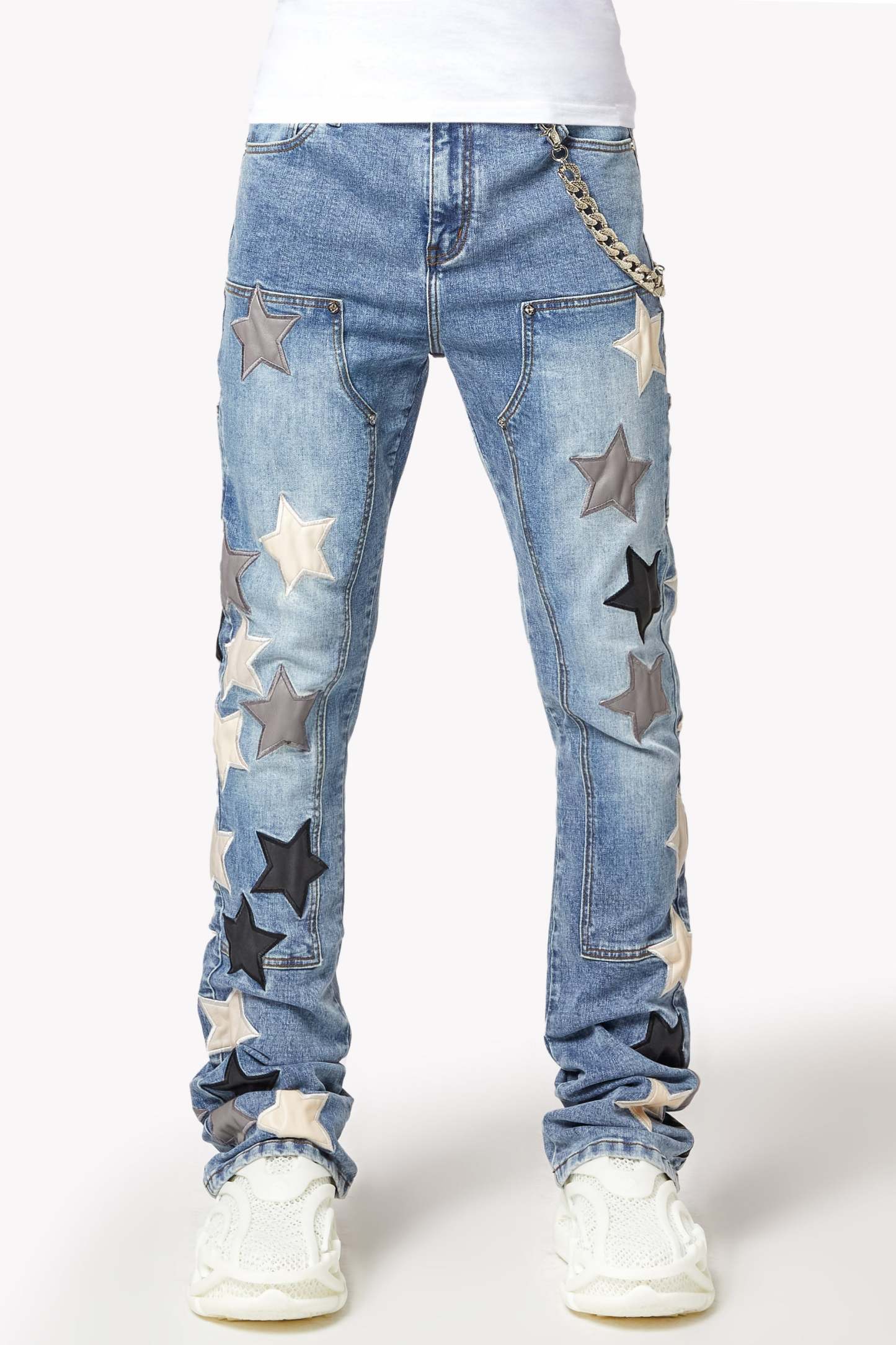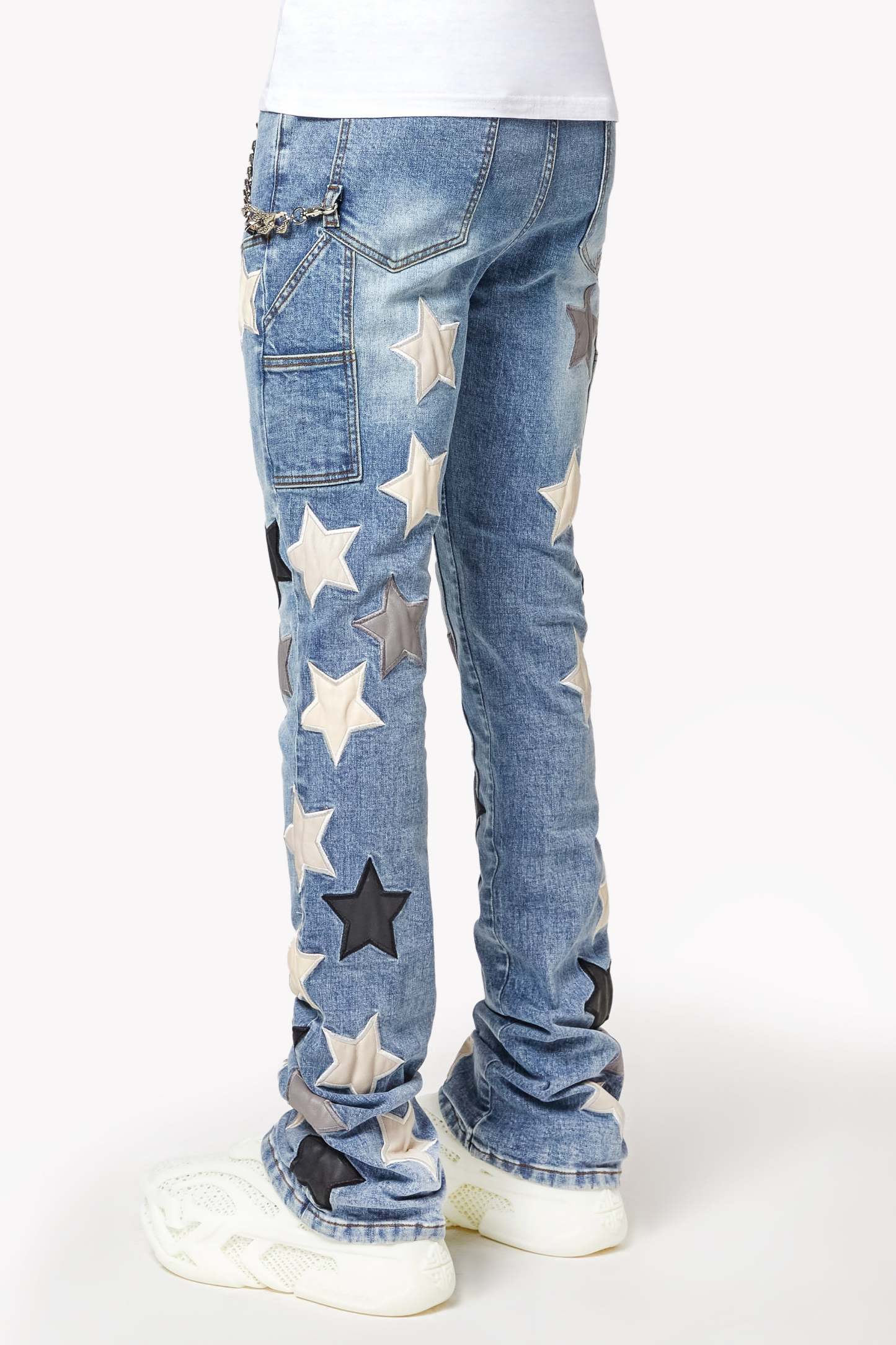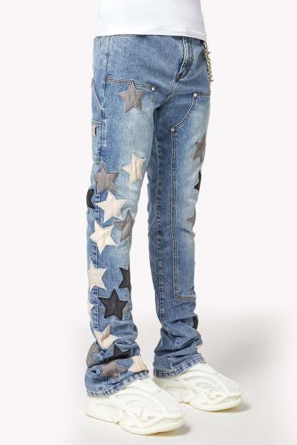 Designed in a stacked fit, these jeans create a sleek, elongated silhouette that pairs effortlessly with sneakers or boots. The subtle fading and distressed details add depth and texture, while the leather stars provide a tactile, luxurious feel. A silver chain detail adds an extra edge, making these jeans a standout piece for those who embrace individuality.