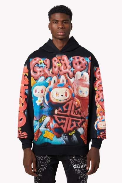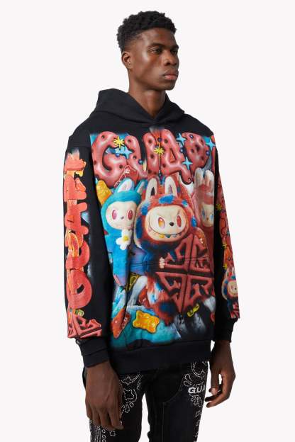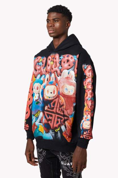 Playful chaos meets hyper-saturated fantasy in the Black Candy Riot Hoodie V2. This GUAPI-exclusive hoodie brings a candy-coated rebellion to life with an explosive print of surreal gummy creatures, vibrant chains, and electrified textures. The front features fluffy animated characters with sharp grins and rainbow eyes, flanked by a bold red GUAPI logo built from glossy, jelly-like letters.