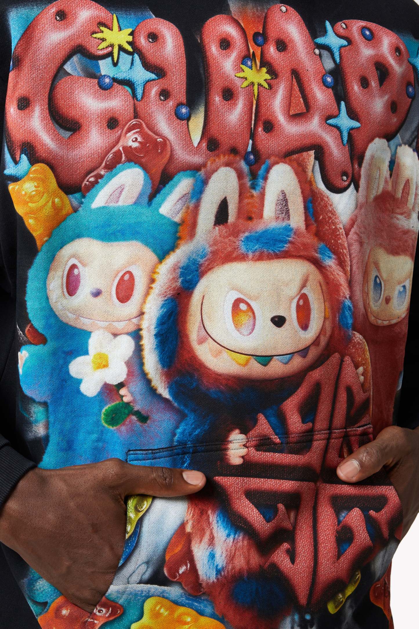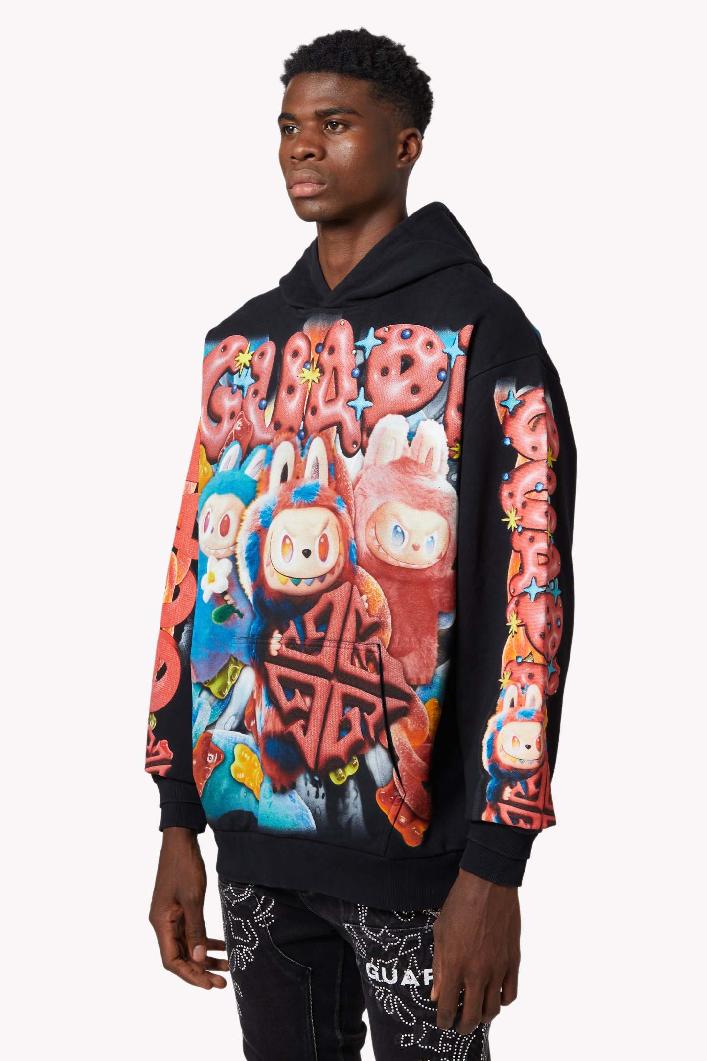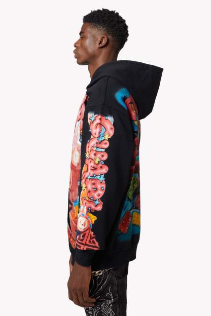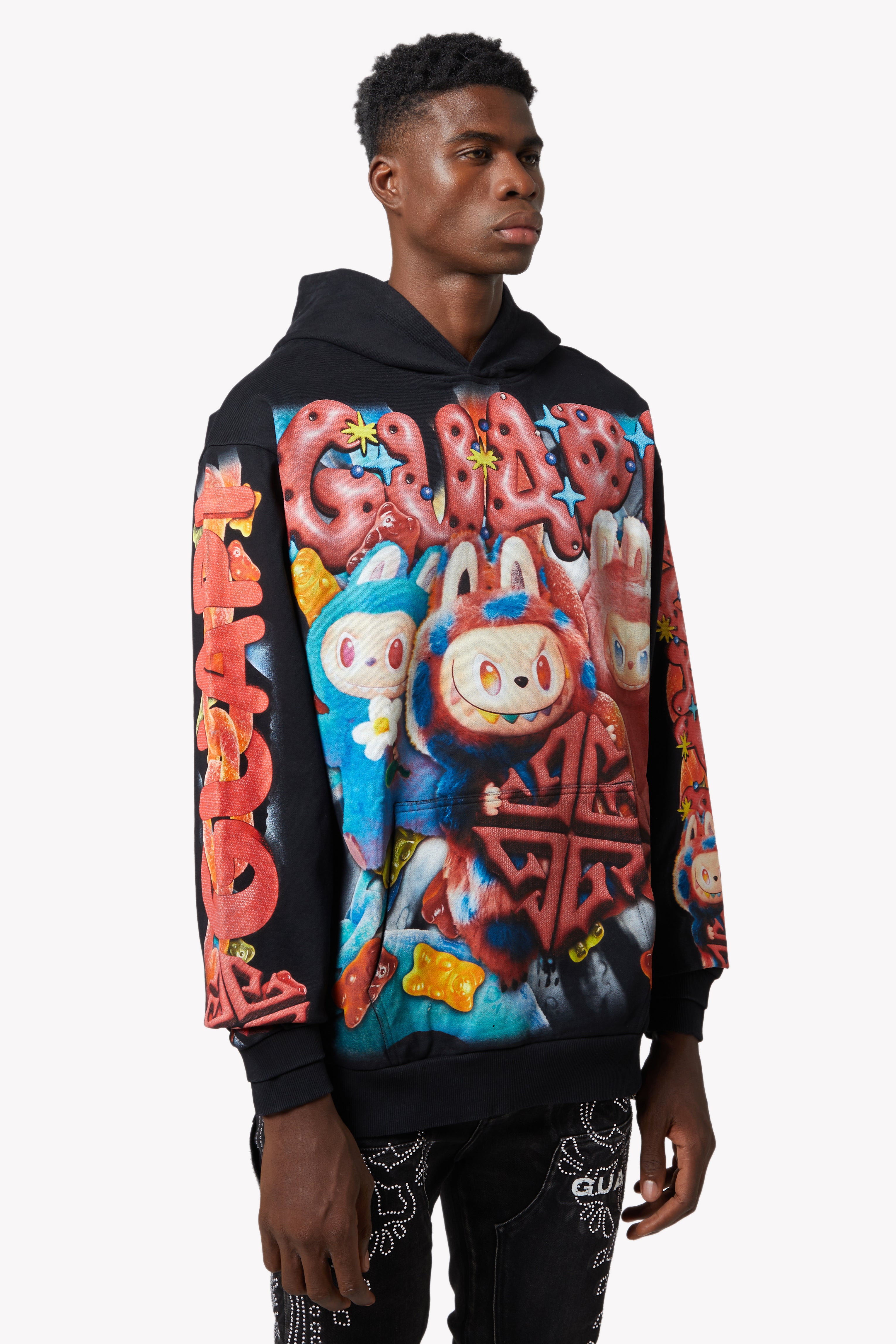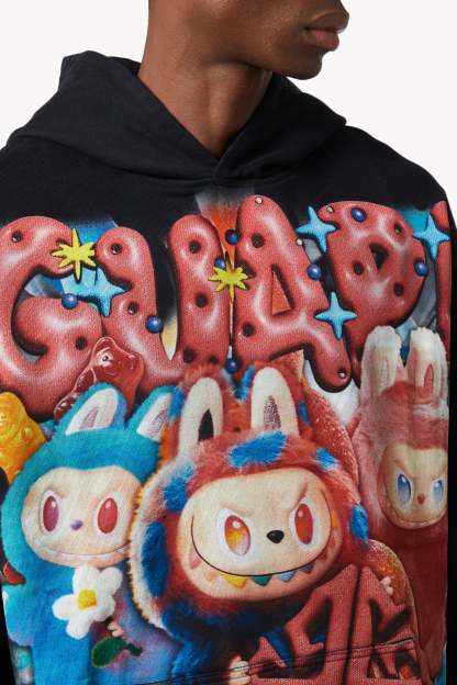 From twisted licorice chains to bouncing gummy bears and sugar-dusted spirals, the hoodie is drenched in sweet riot energy. The back expands the visual overload with oversized GUAPI motifs wrapped in tangy sour ropes and candy explosions, while each sleeve carries its own overload of playful detail.