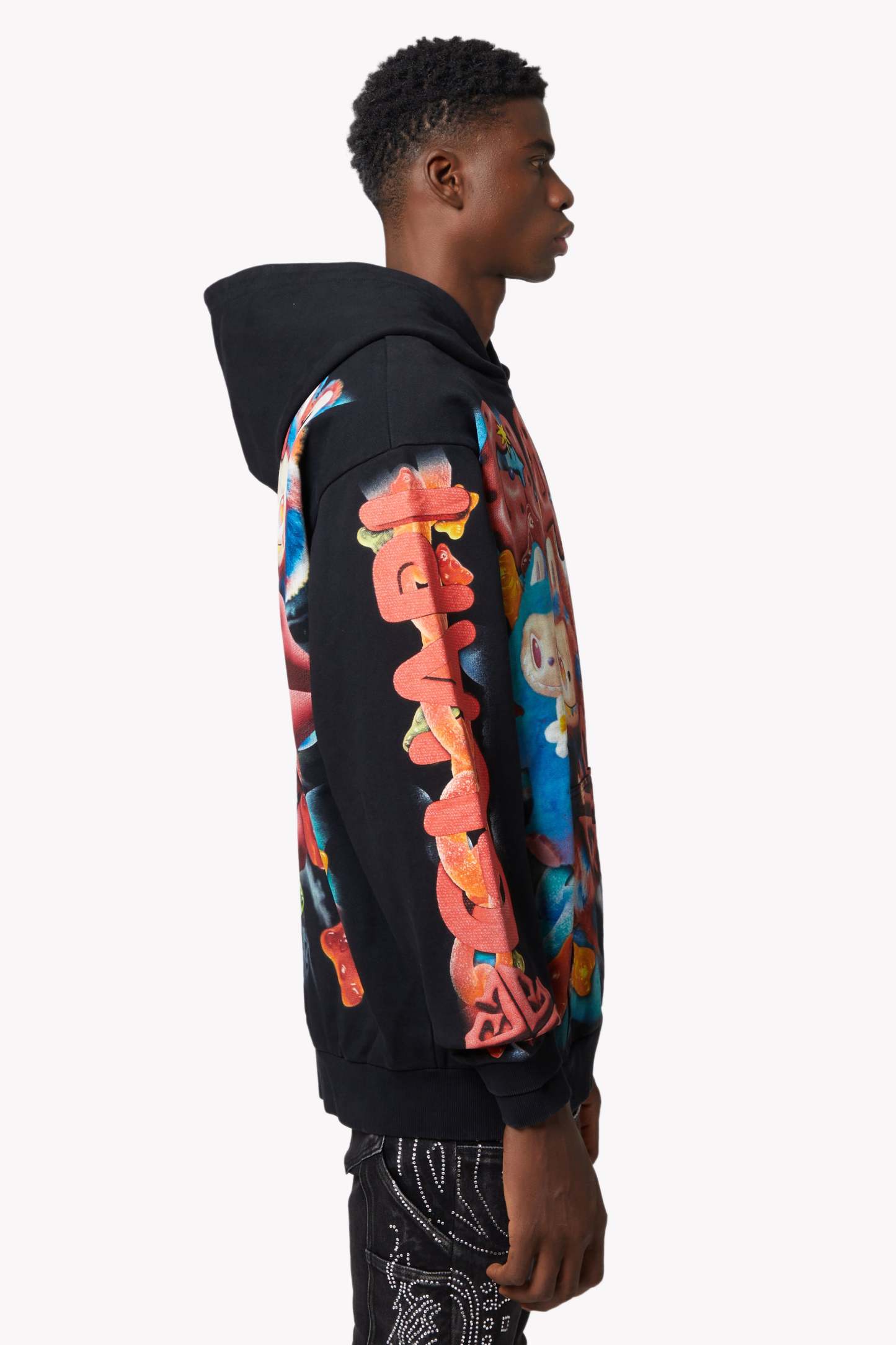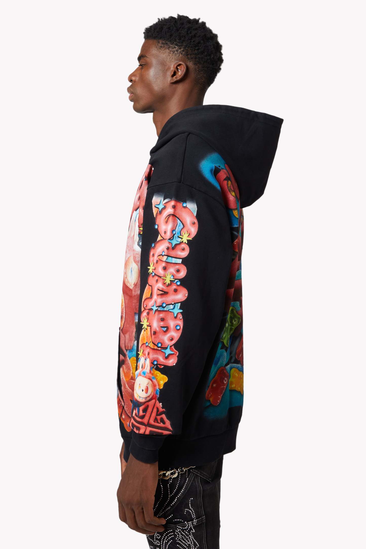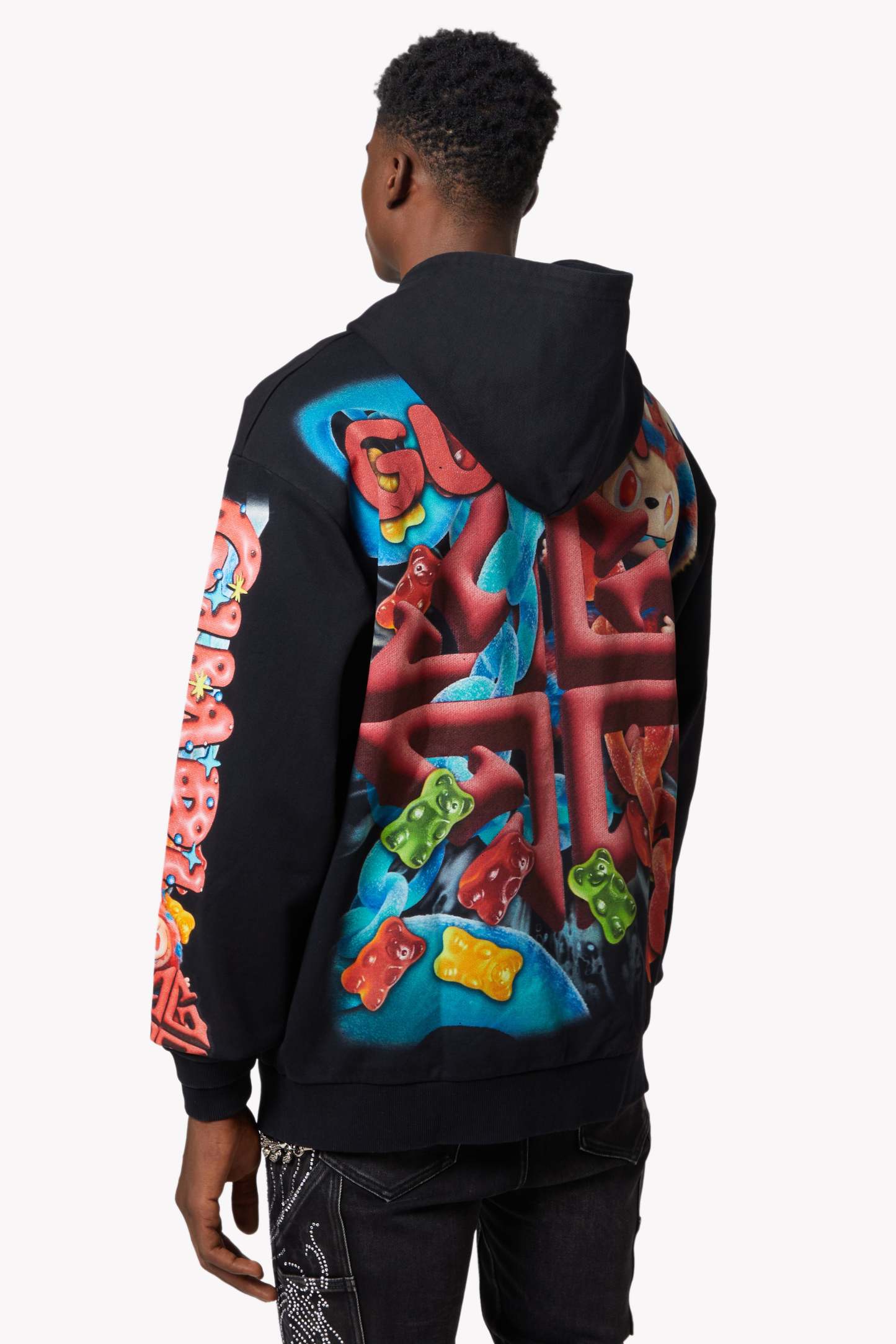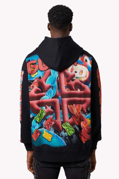 Gummy Bear Motif: Scattered across the hoodie with hyperreal textures