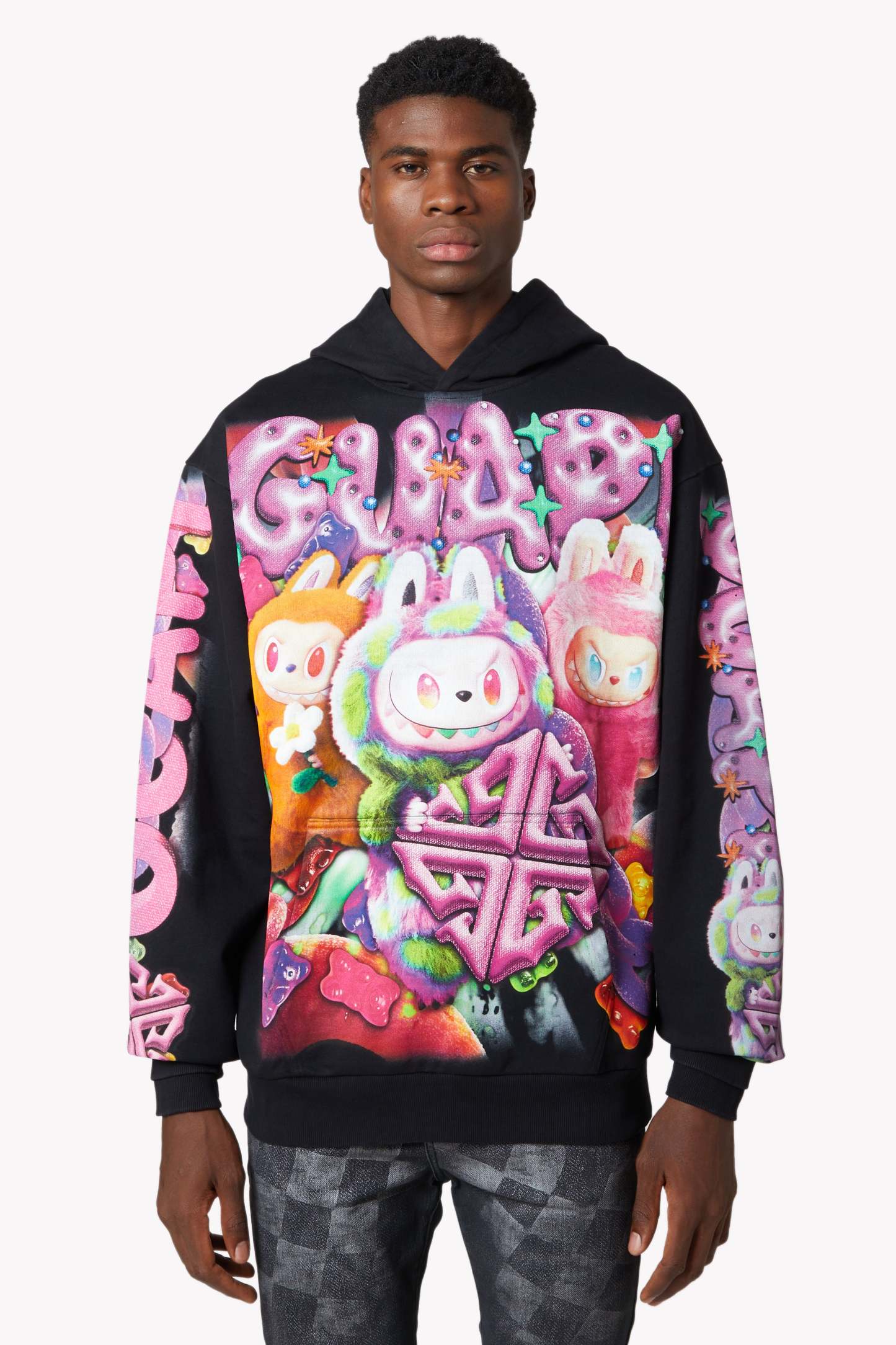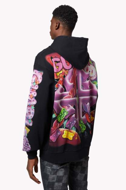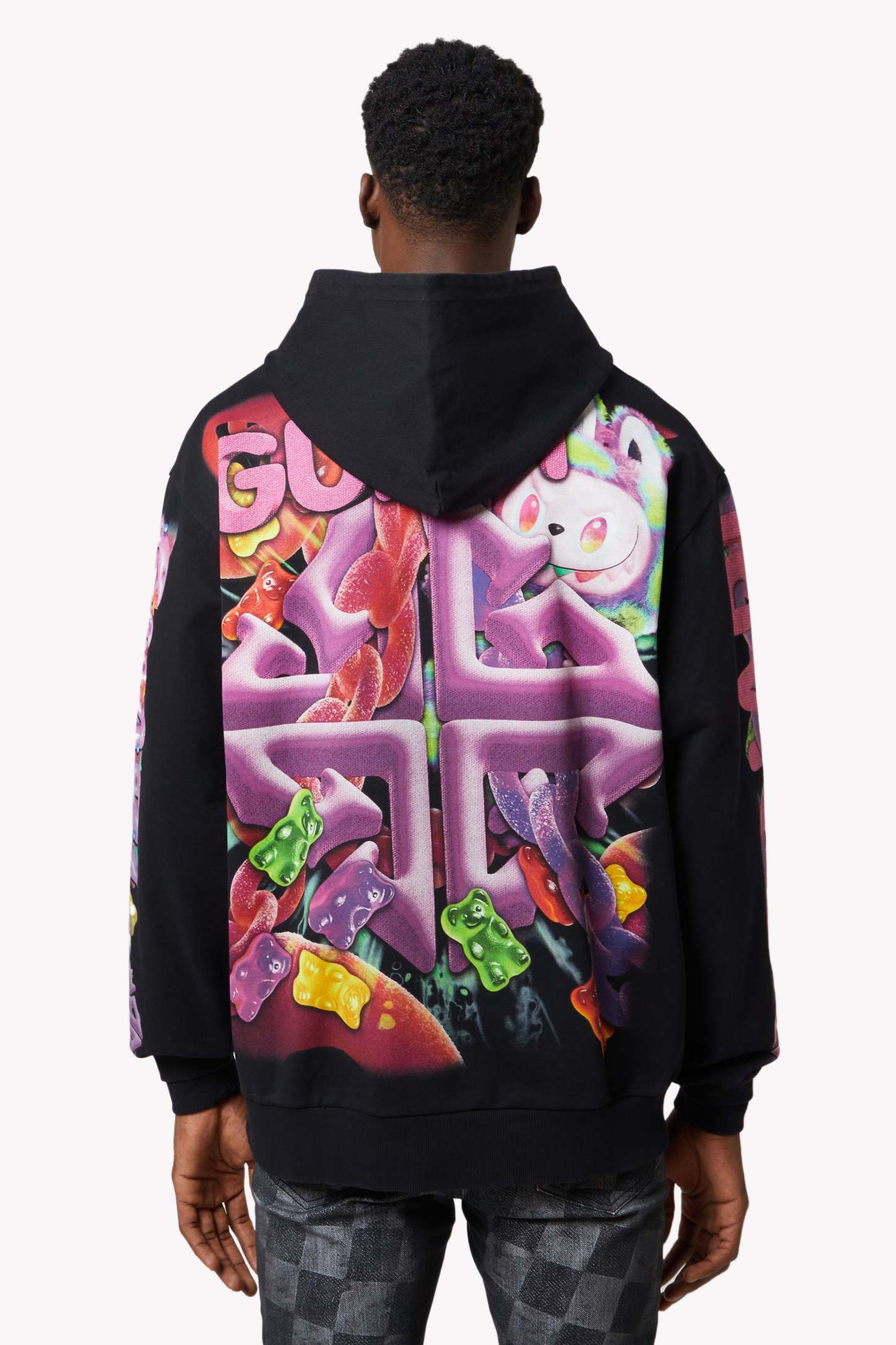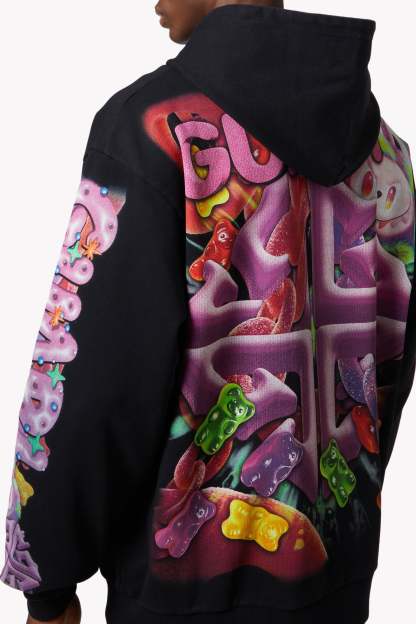 A maximalist statement piece that collides streetwear with surreal pop chaos, the Black Candy Riot Hoodie V3 is a bold visual overload rooted in GUAPI’s signature playful edge. Crafted from heavyweight cotton fleece, the hoodie features a hyper-saturated all-over graphic with gummy bear elements, cartoonish mascots, and oversized GUAPI iconography.