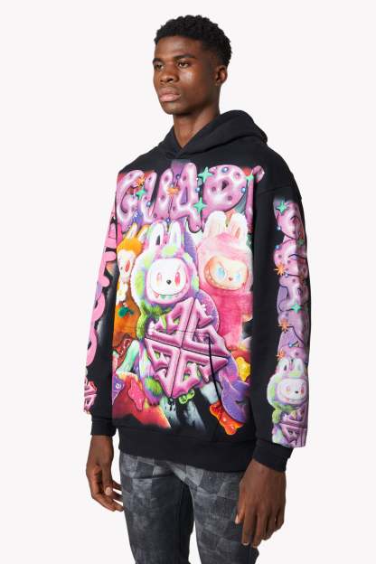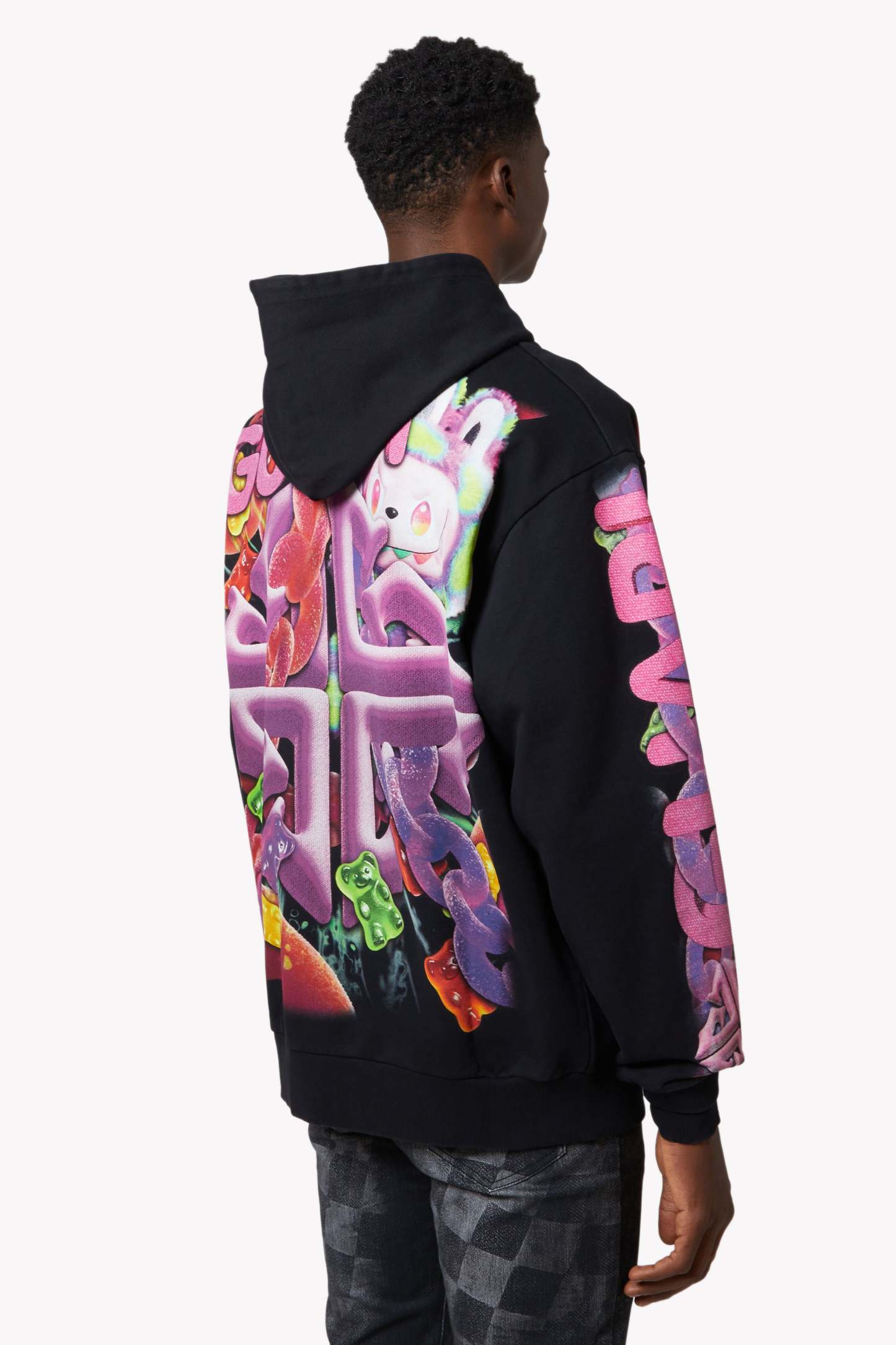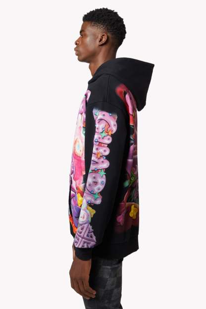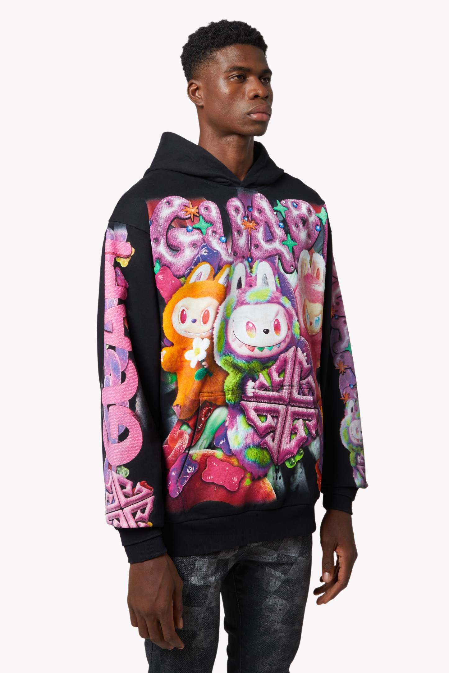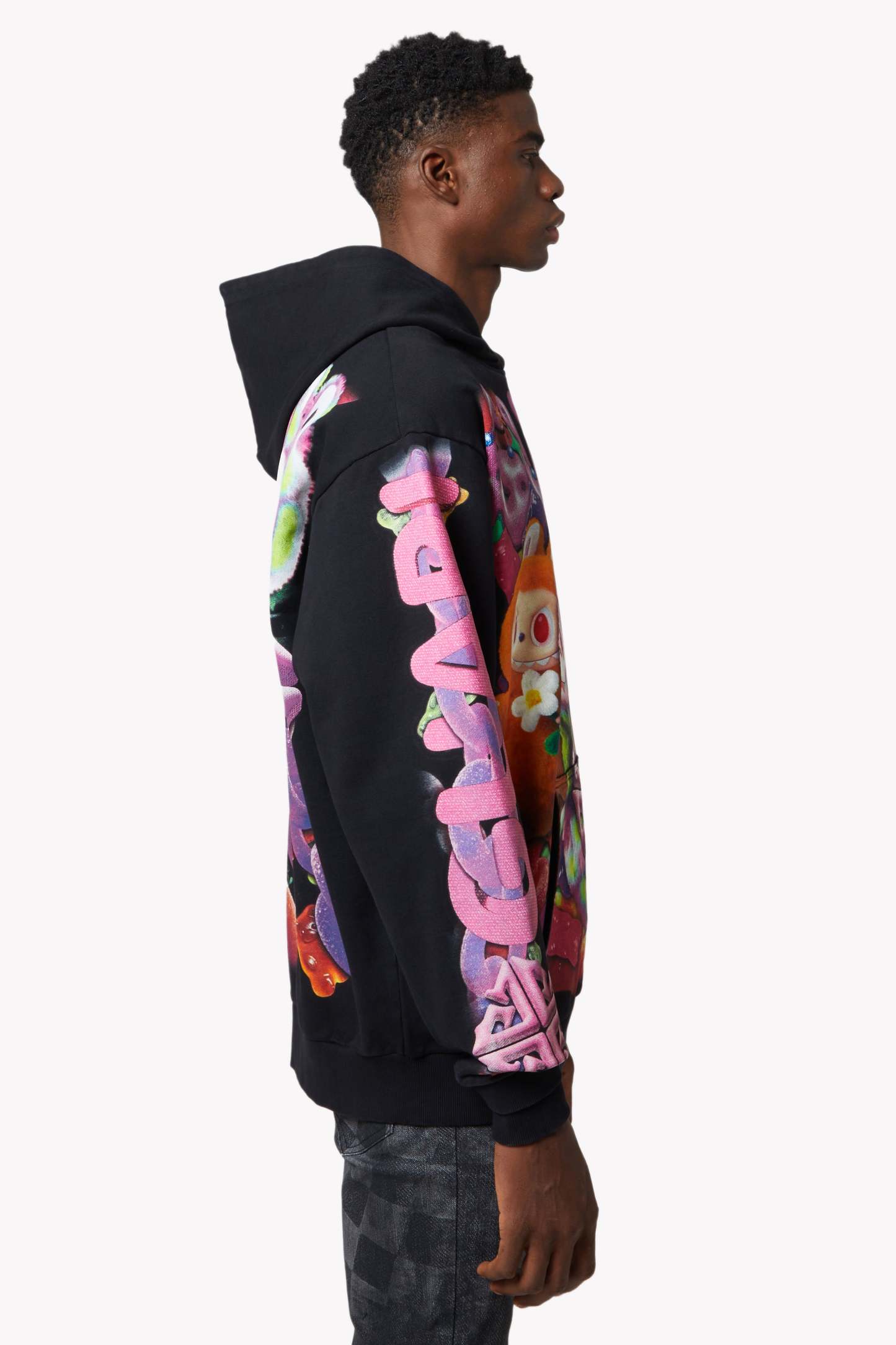 A maximalist statement piece that collides streetwear with surreal pop chaos, the Black Candy Riot Hoodie V3 is a bold visual overload rooted in GUAPI’s signature playful edge. Crafted from heavyweight cotton fleece, the hoodie features a hyper-saturated all-over graphic with gummy bear elements, cartoonish mascots, and oversized GUAPI iconography.