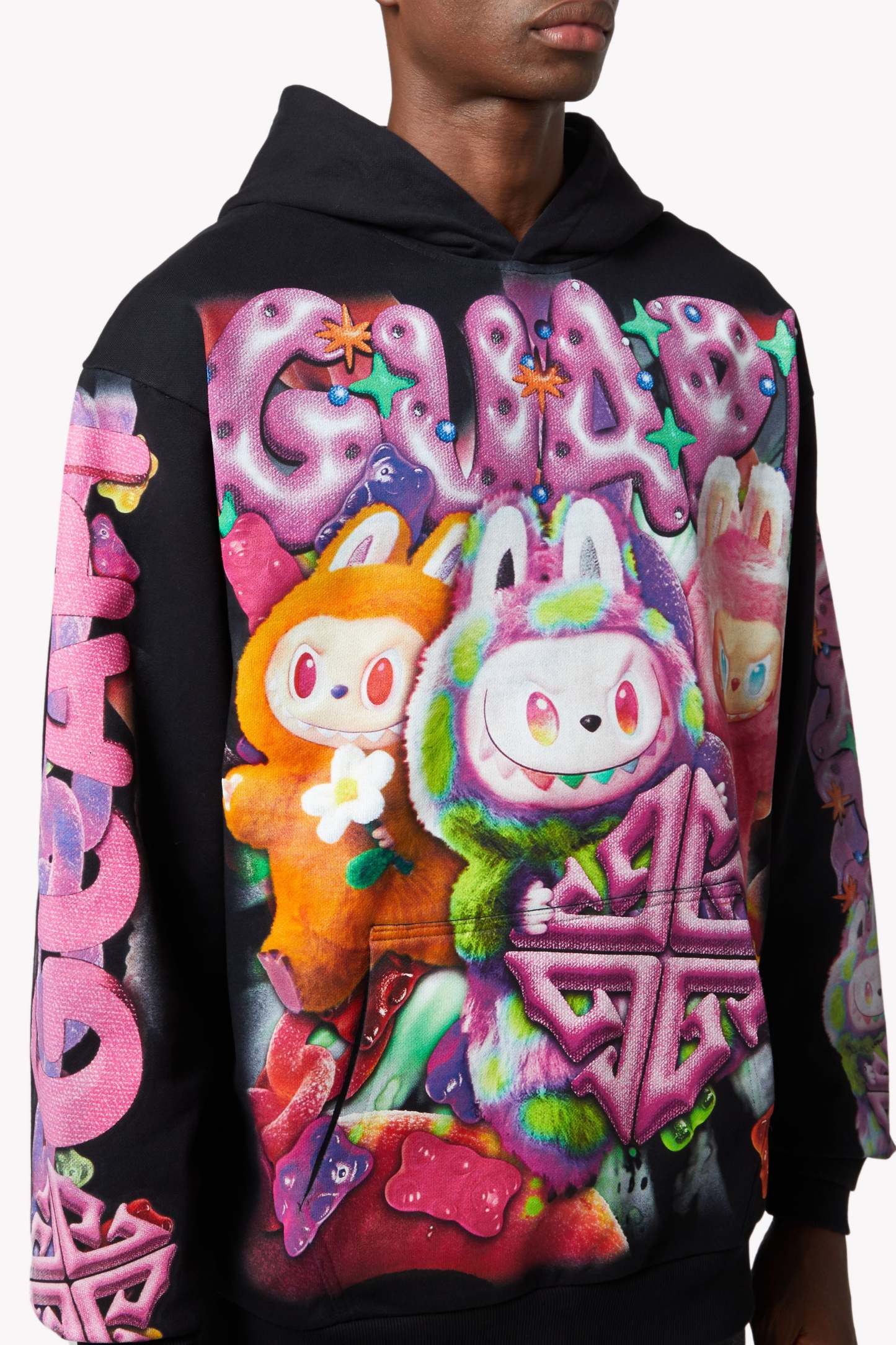 The front showcases fuzzy monster characters in multicolor hues, layered over a dreamlike candy riot landscape. GUAPI’s logo appears puff-printed in vibrant pinks across the chest and sleeves, while 3D crystal embellishments bring added depth and glimmer. On the back, a giant intertwined GUAPI emblem is overrun by glossy gummy bears and neon characters, pushing the visual chaos to the max. A kangaroo pocket is seamlessly integrated into the front panel, maintaining full functionality without interrupting the print flow.