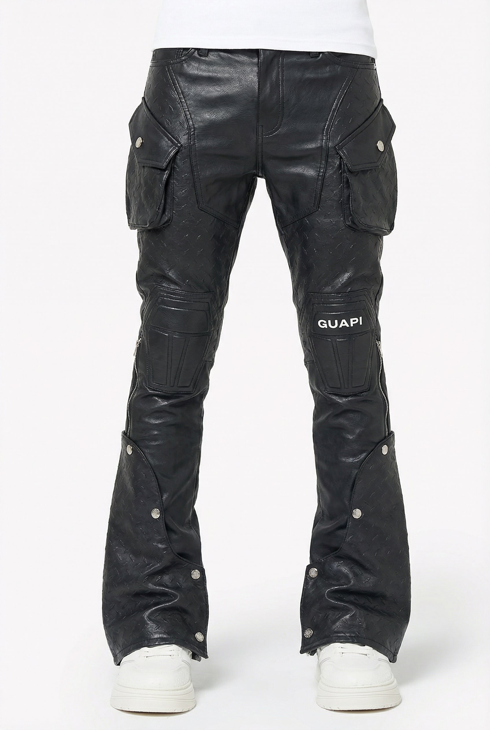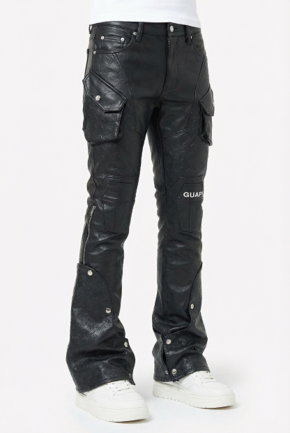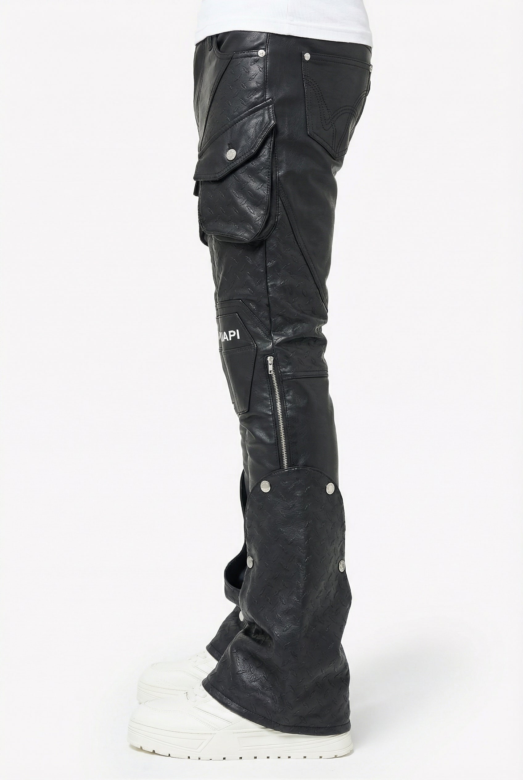 The lower leg is where the statement lands: an extended flared panel is framed with metal snaps running down the sides, adding hardware shine and modular energy. Textured sections—visible across the knees and flare—add depth and contrast against the smoother leather, giving the pant a layered, premium presence from every angle.