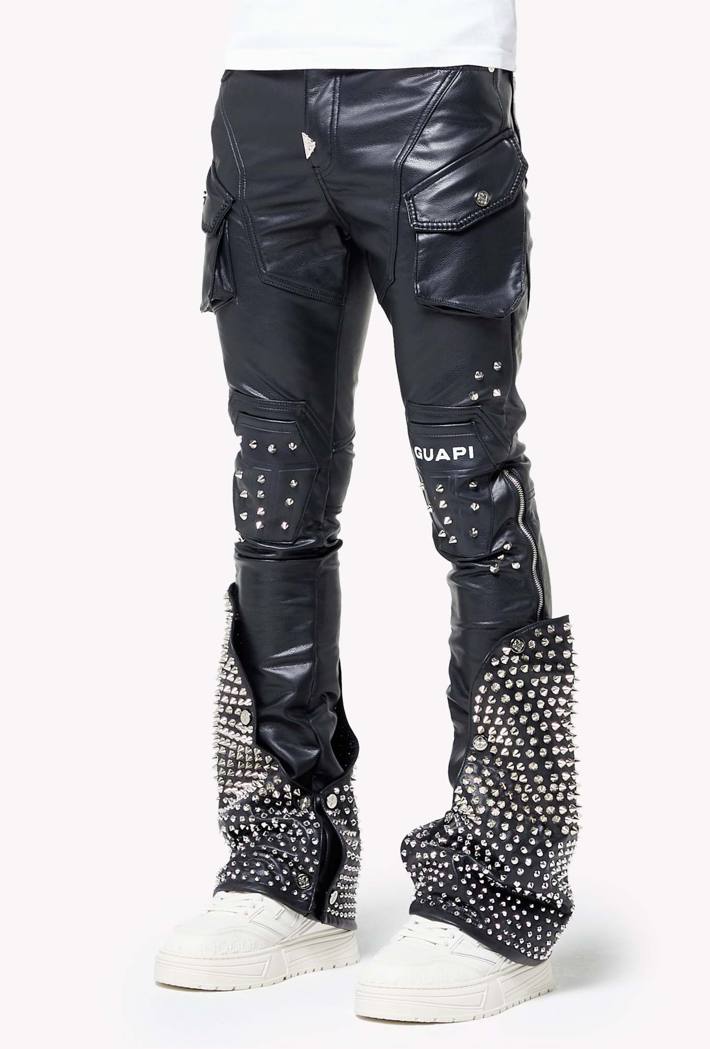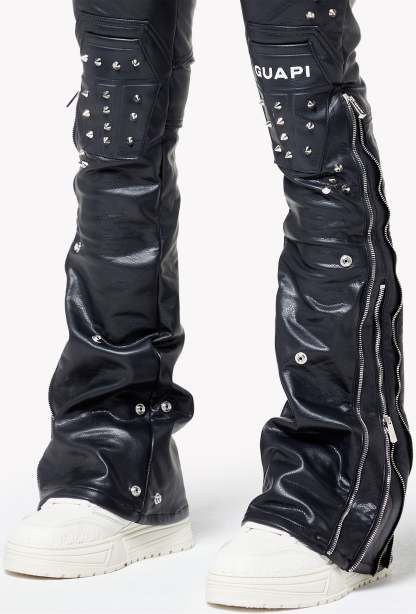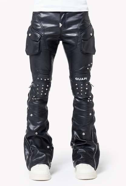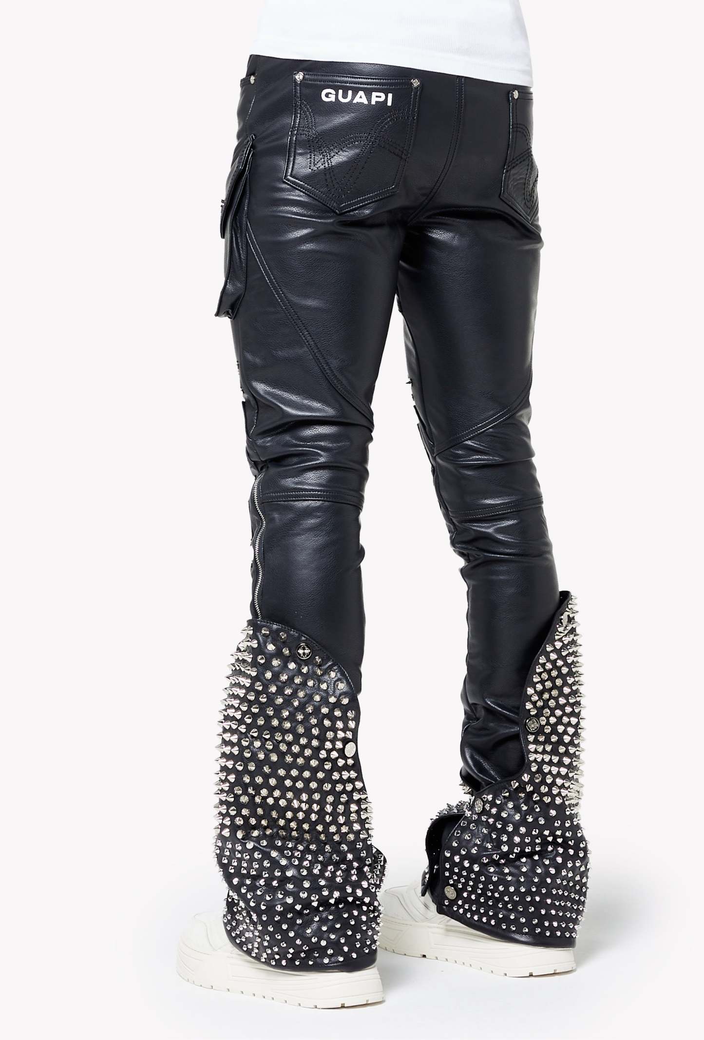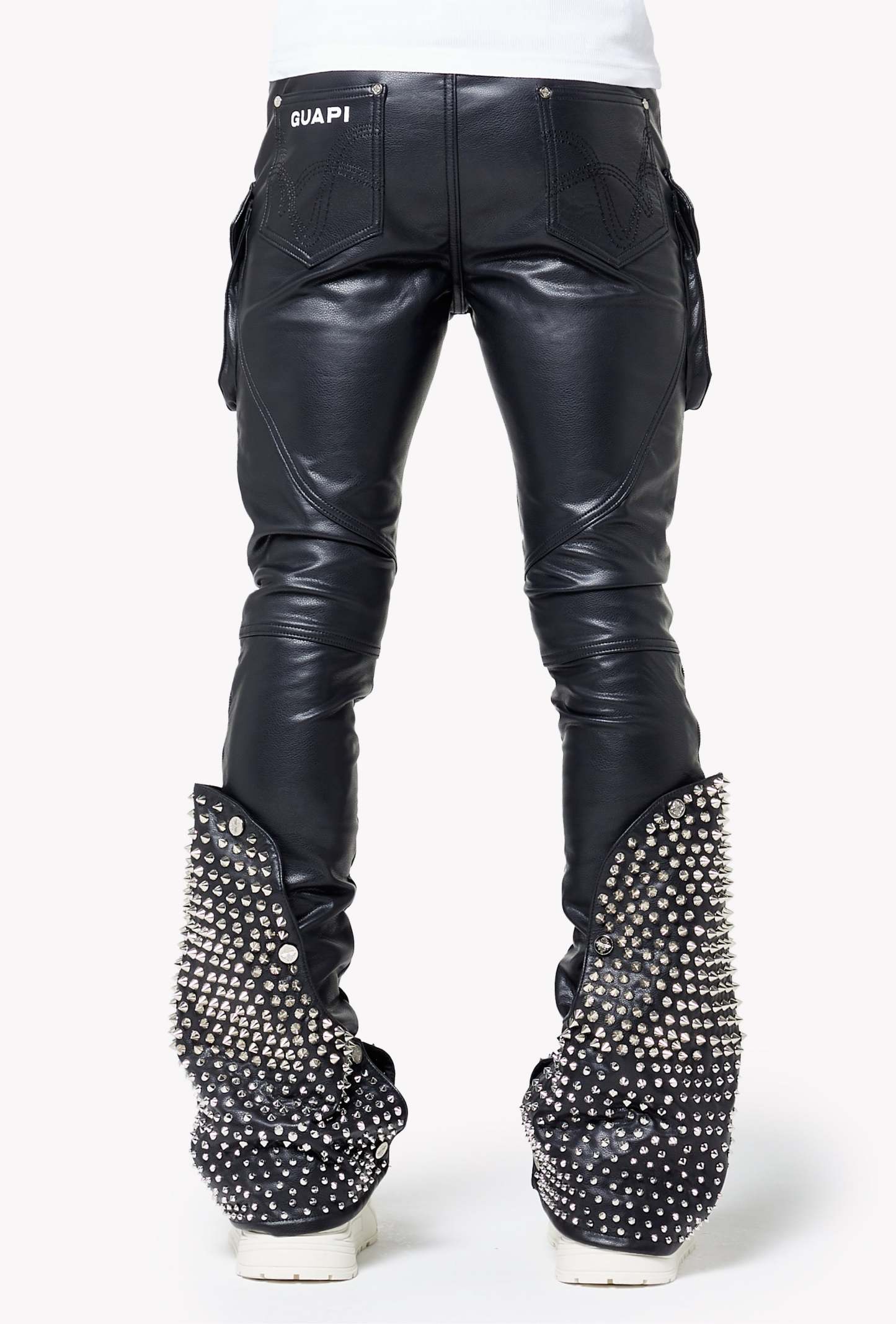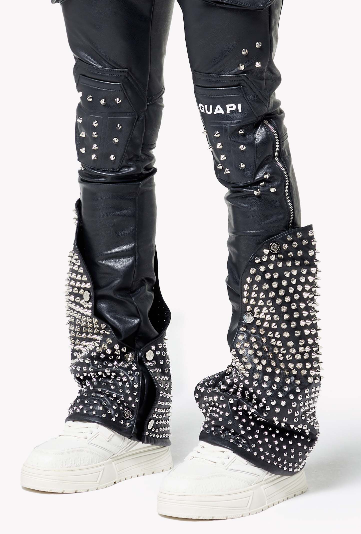 The upper section features GUAPI’s iconic coffin-arc paneling, sharply contoured to define the thighs and waist. Oversized cargo pockets sit on both sides, constructed with reinforced edges and secured with branded metal snap buttons. The knees are built with armored-style geometric padding and fully studded detailing, giving the piece a heavily engineered, moto-inspired edge.