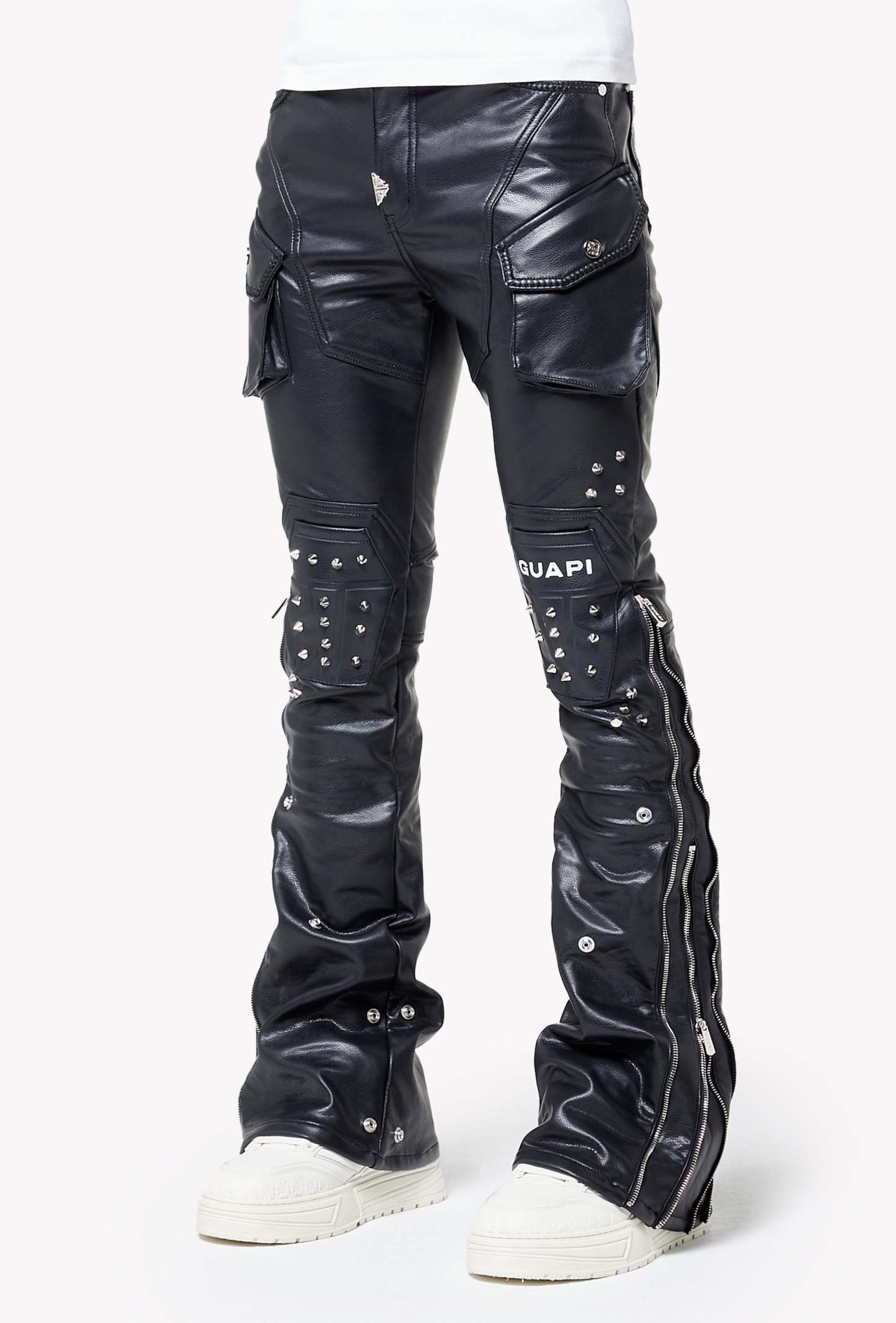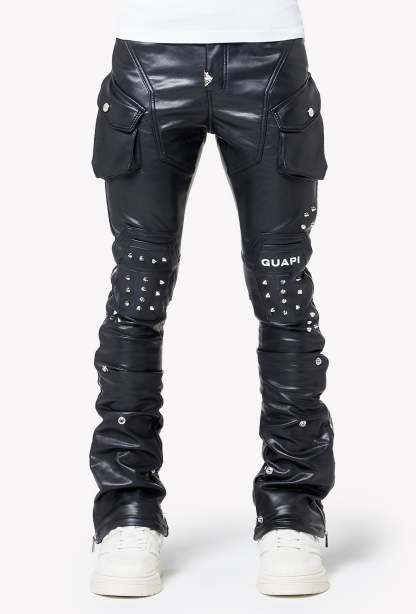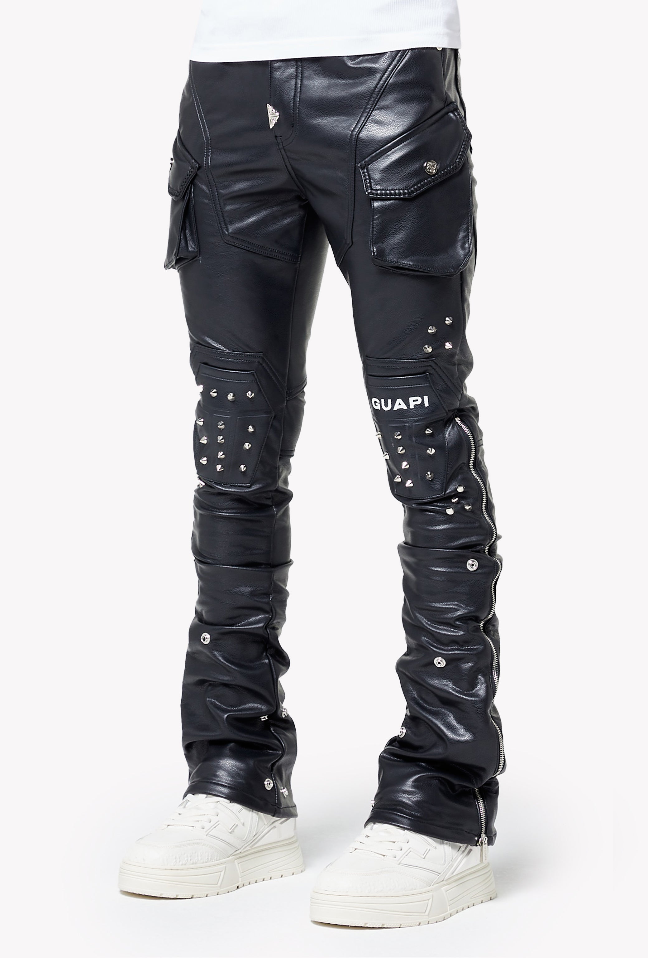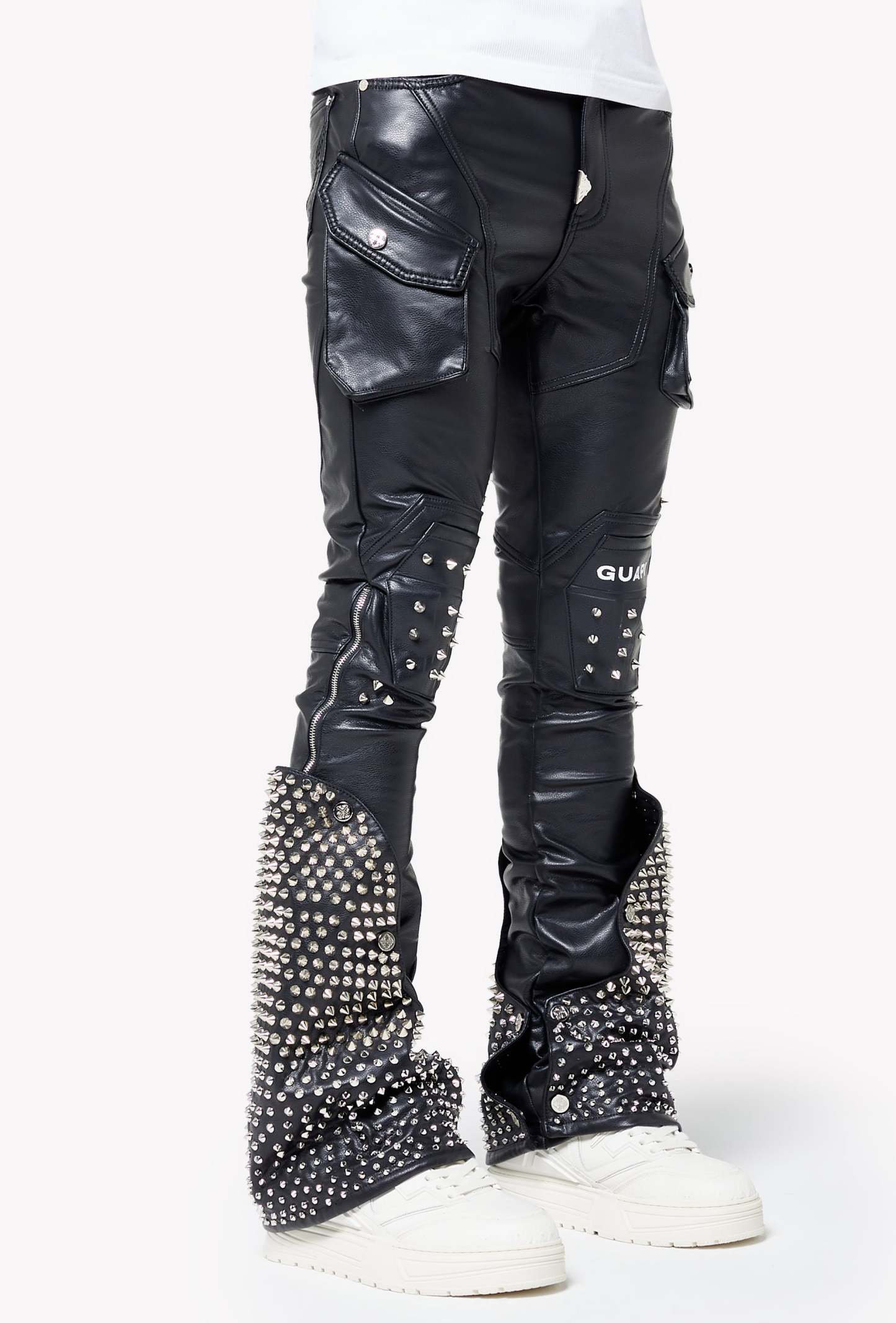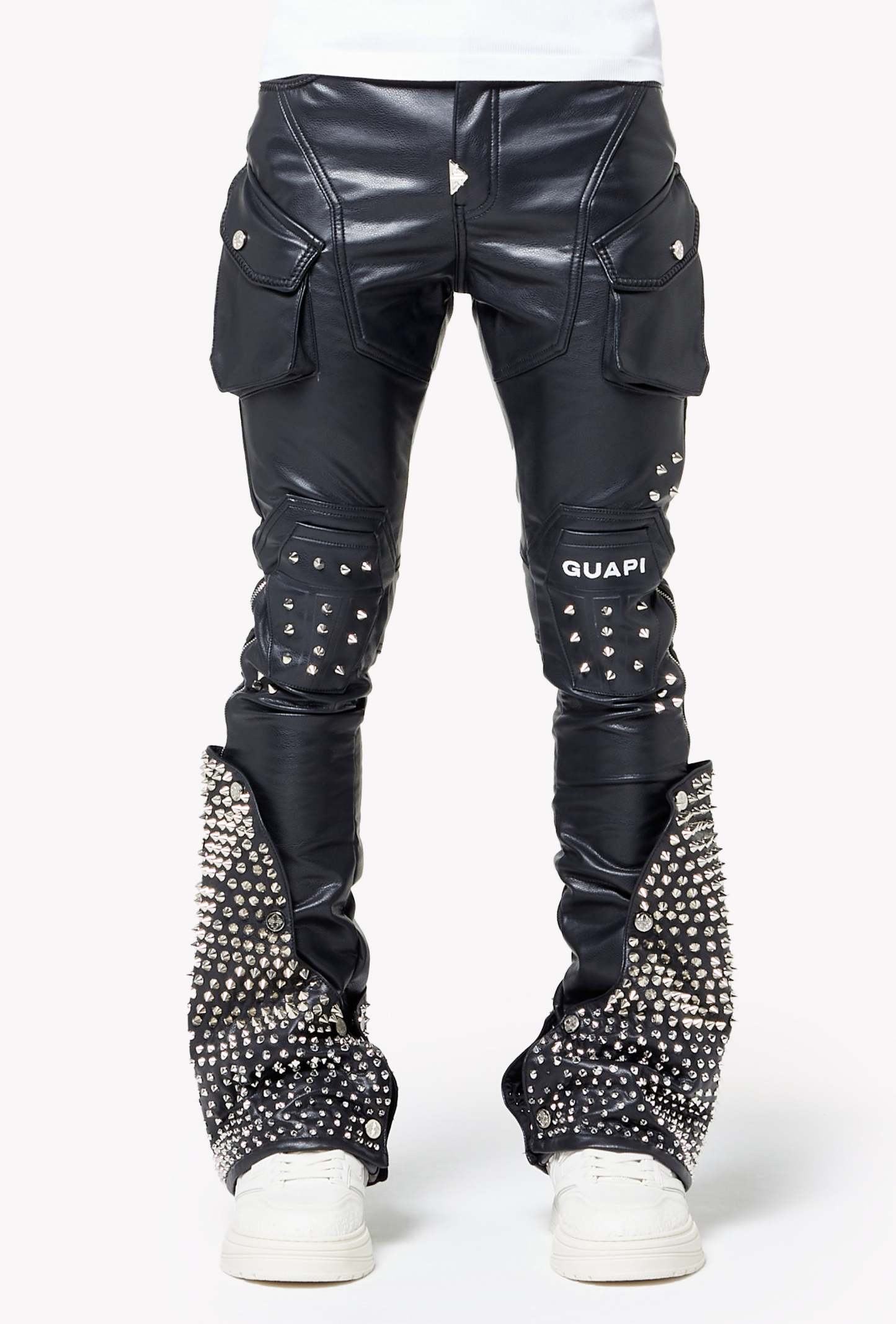 The upper section features GUAPI’s iconic coffin-arc paneling, sharply contoured to define the thighs and waist. Oversized cargo pockets sit on both sides, constructed with reinforced edges and secured with branded metal snap buttons. The knees are built with armored-style geometric padding and fully studded detailing, giving the piece a heavily engineered, moto-inspired edge.