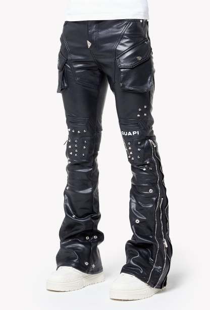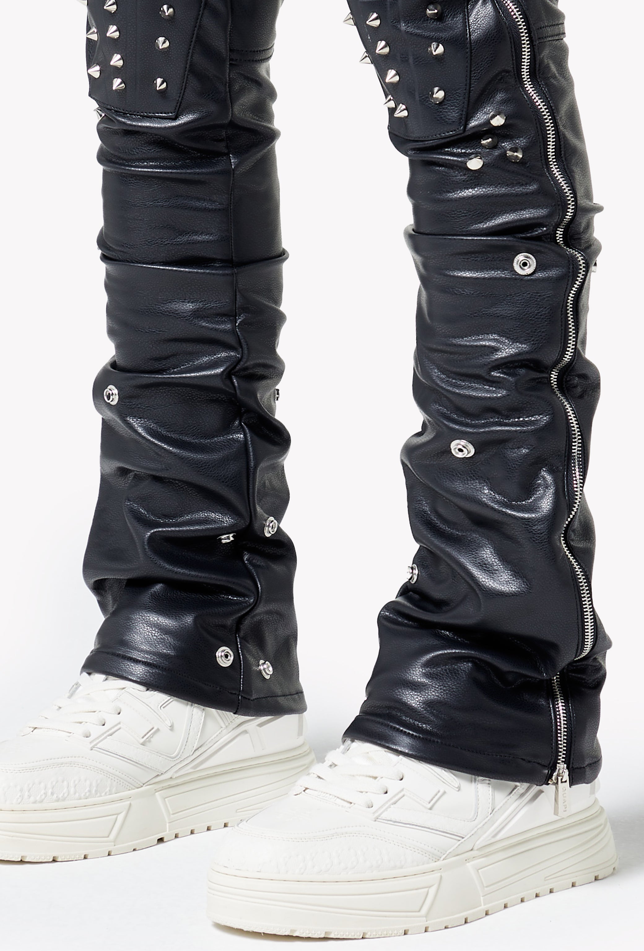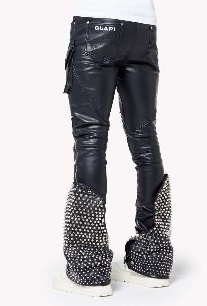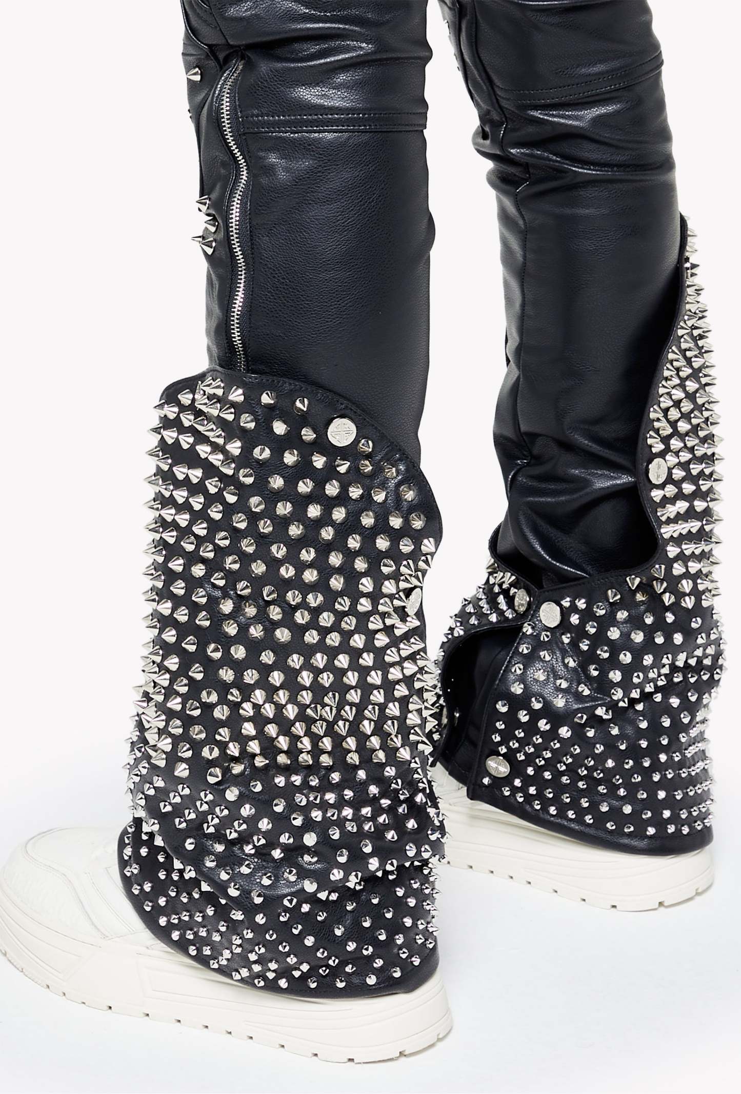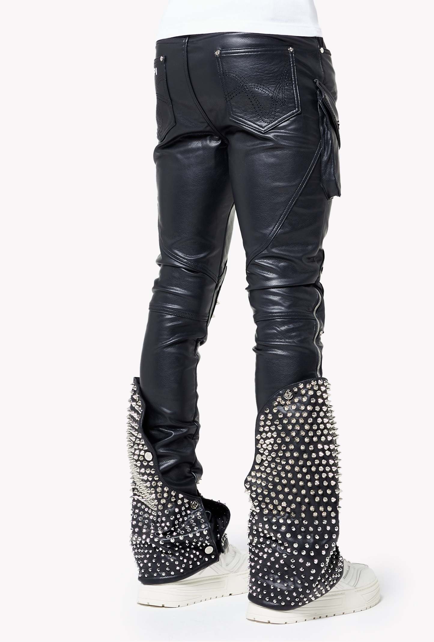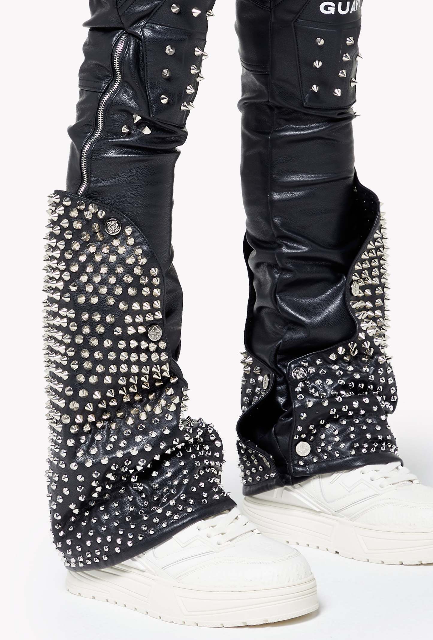 The lower legs feature two looks in one. When the full detachable flare panels are attached, the pants transform into a dramatic stacked flare silhouette covered in dense chrome studs of varying sizes. When removed, the pants revert to a slimmer stacked profile with visible zipper lines, creating a more minimal but still structured look.