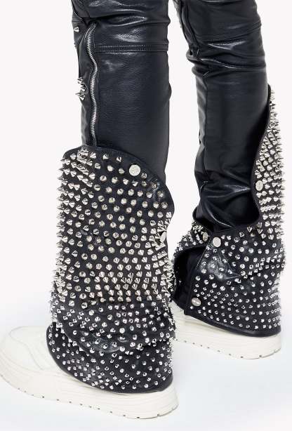 Dense chrome spike and pyramid studs on the bottom flare extensions