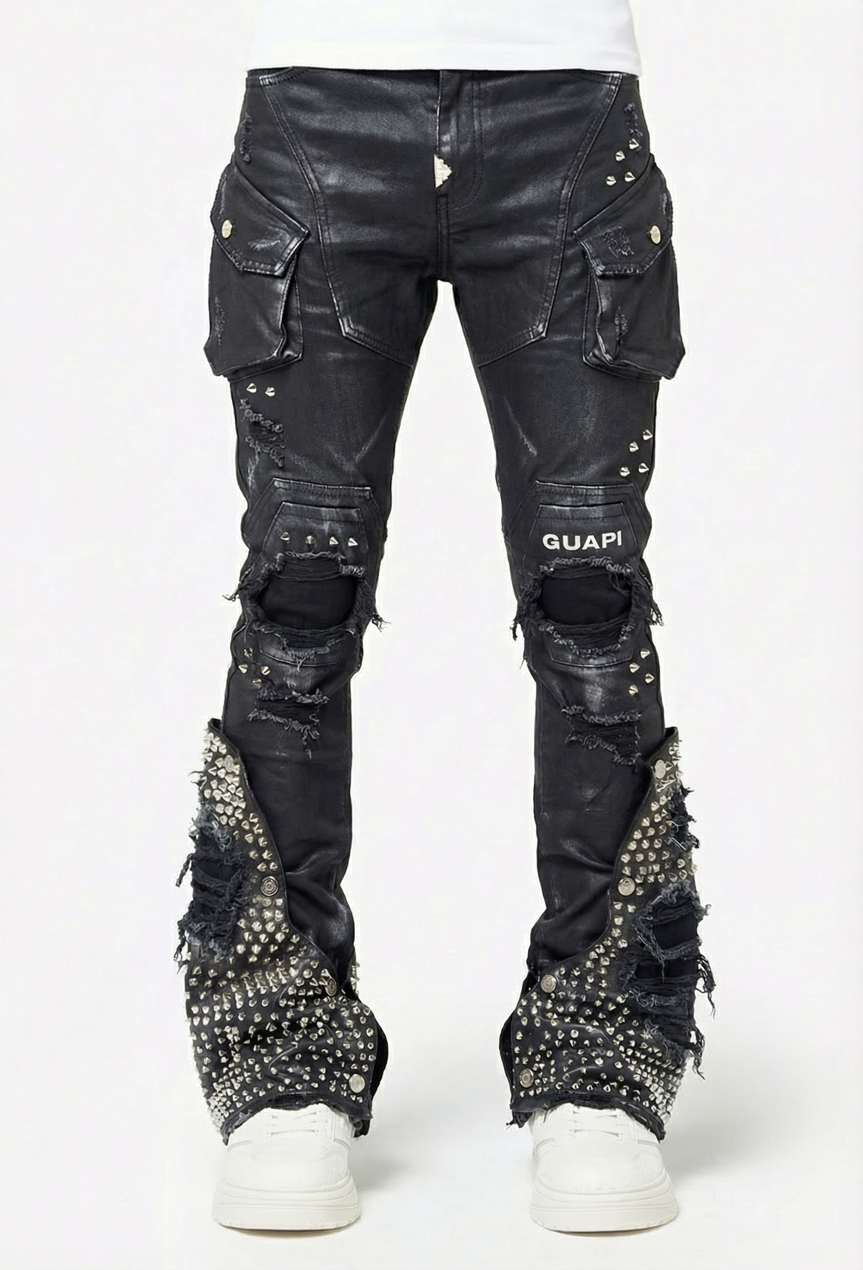 The upper section features GUAPI’s iconic coffin-arc paneling, sharply contoured to define the thighs and waist. Oversized cargo pockets sit on both sides, constructed with reinforced edges and secured with branded metal snap buttons. The knees are built with armored-style geometric padding and fully studded detailing, giving the piece a heavily engineered, moto-inspired edge.