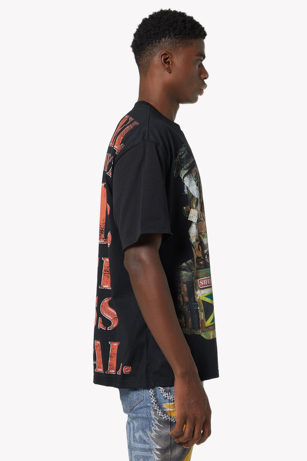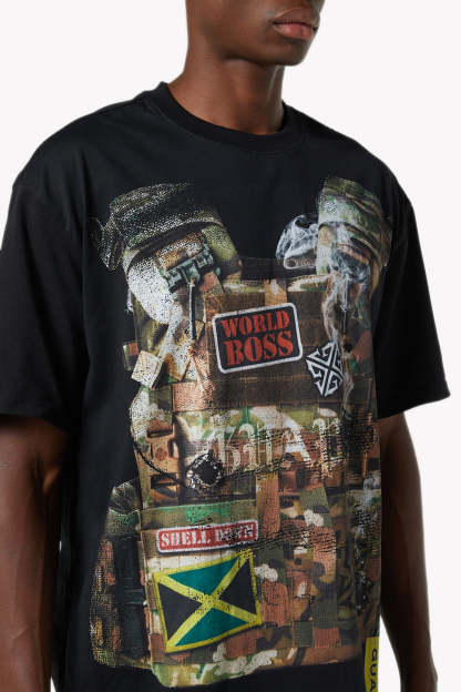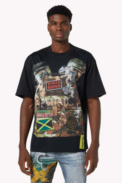 - Front graphic features tactical vest with statement patches (World Boss, Shell Down, Jamaican flag, Guapi emblem)