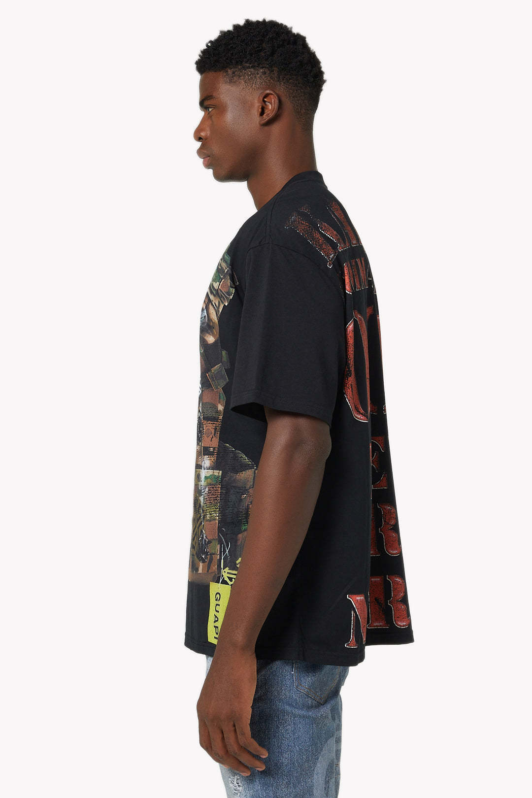 The front features a vivid print of a tactical vest with patches reading WORLD BOSS, SHELL DOWN, and a Jamaican flag, alongside Guapi’s emblem, emphasizing power and resistance. Smoke-like visual effects add depth and intensity, giving the tee a raw, street ready appeal.