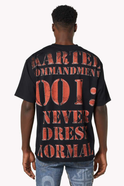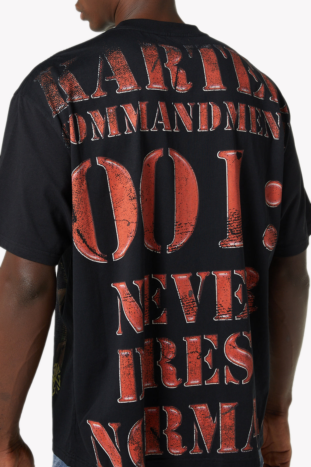 - Back showcases oversized stencil typography in distressed red: “Kartel Commandment 001: Never Dress Normal”