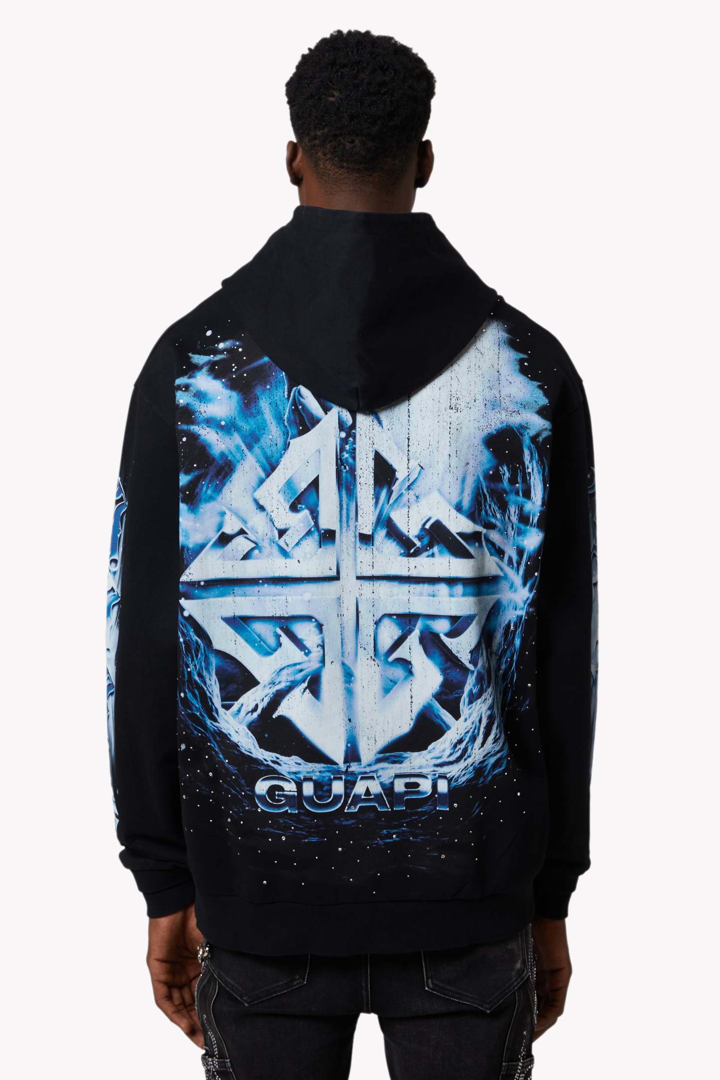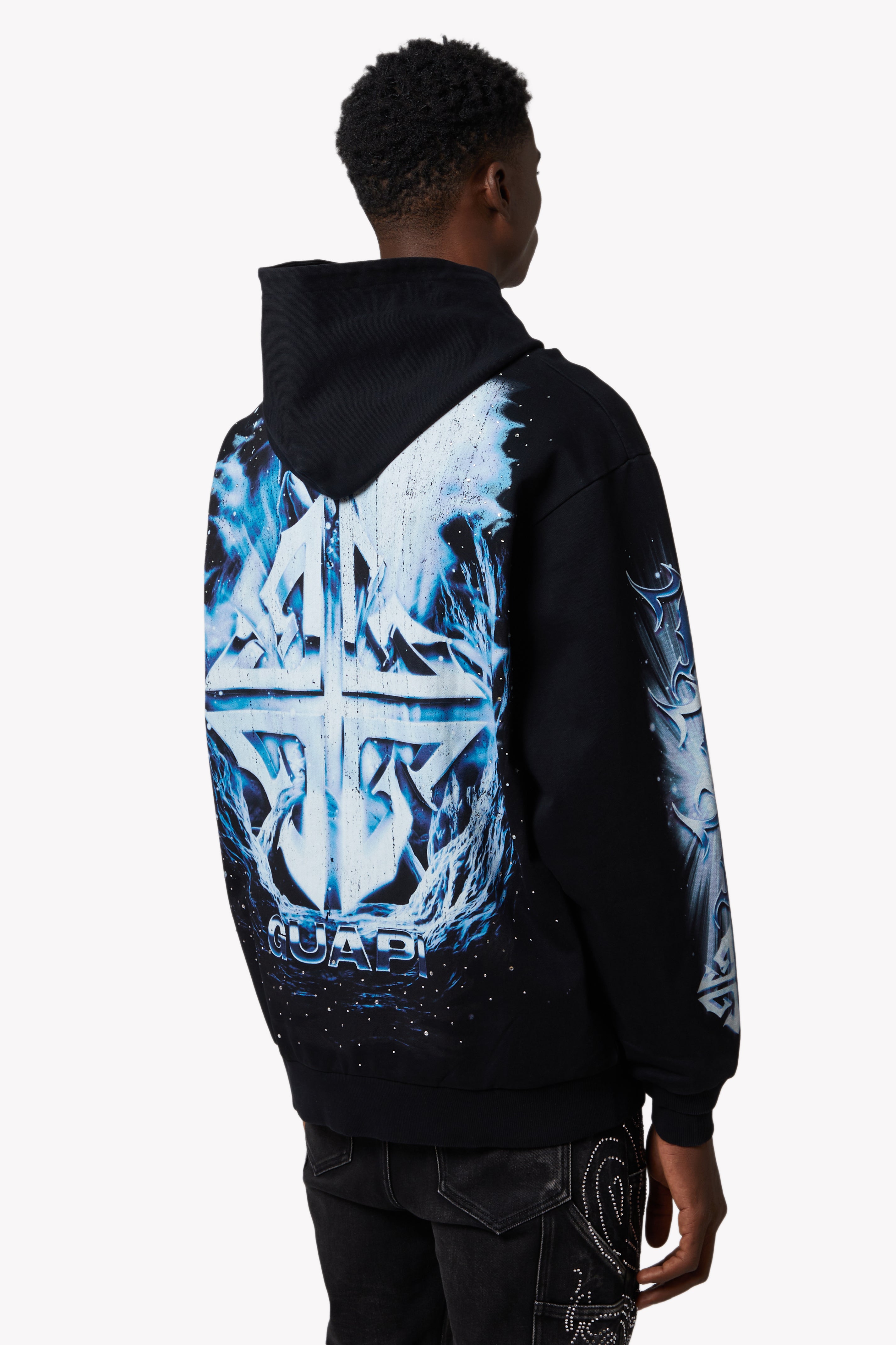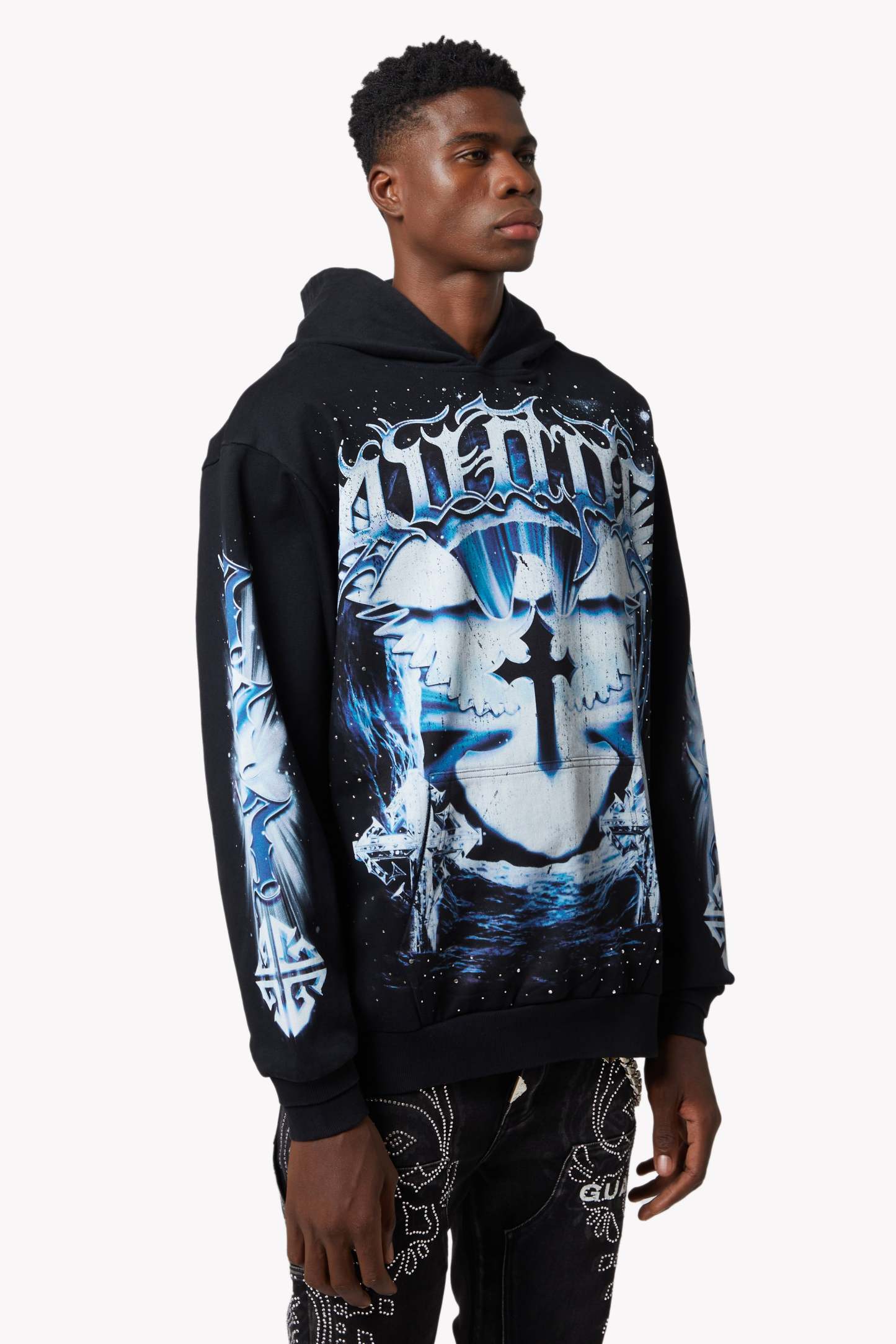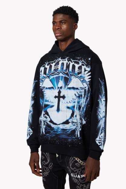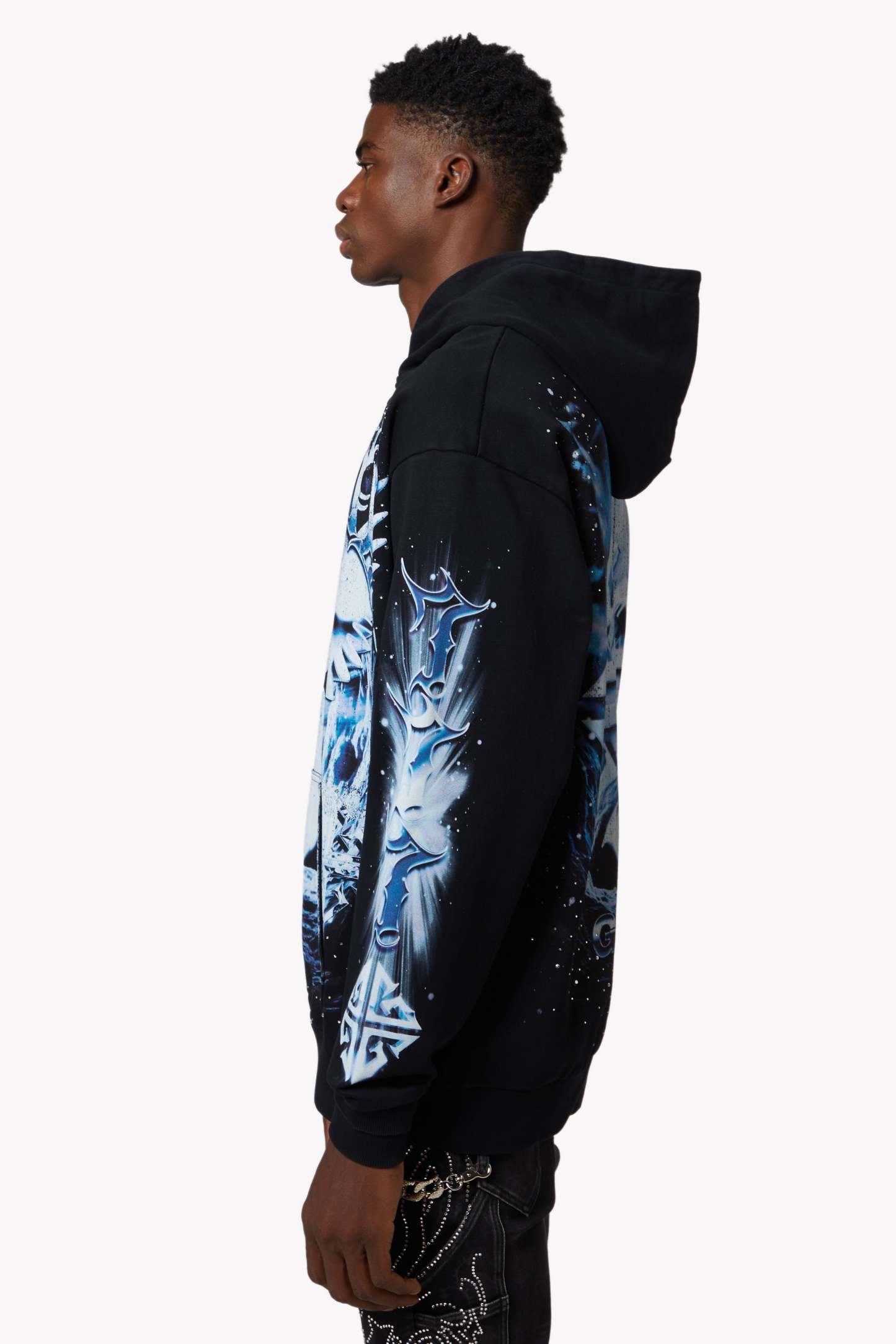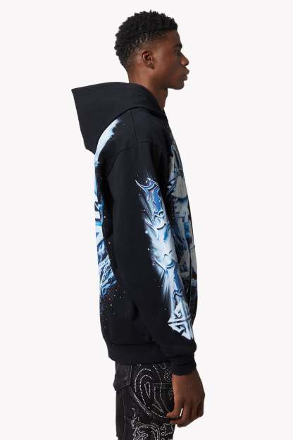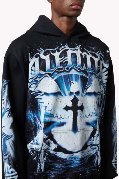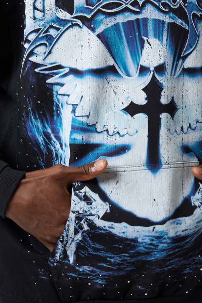 Commanding attention with celestial power, the Black Heavens Vault Hoodie V1 merges divine iconography with apocalyptic streetwear energy. Set on heavyweight black cotton, this oversized hoodie is engulfed in a bold, otherworldly blue and white graphic that evokes waves, lightning, and mystic symbols.