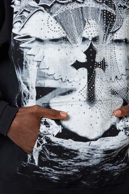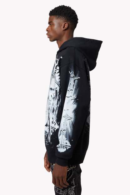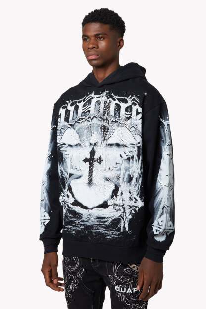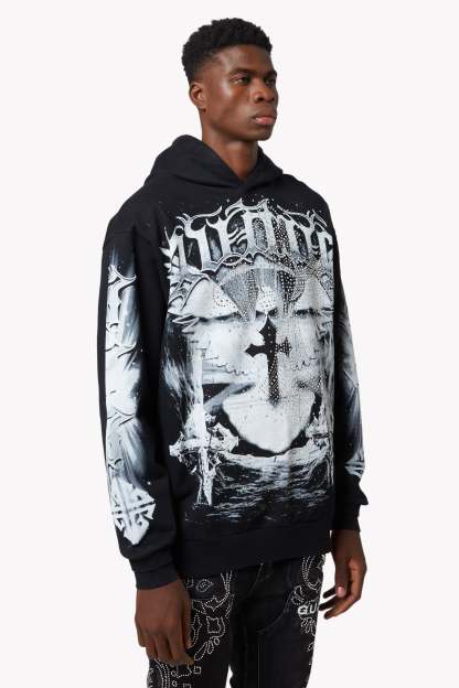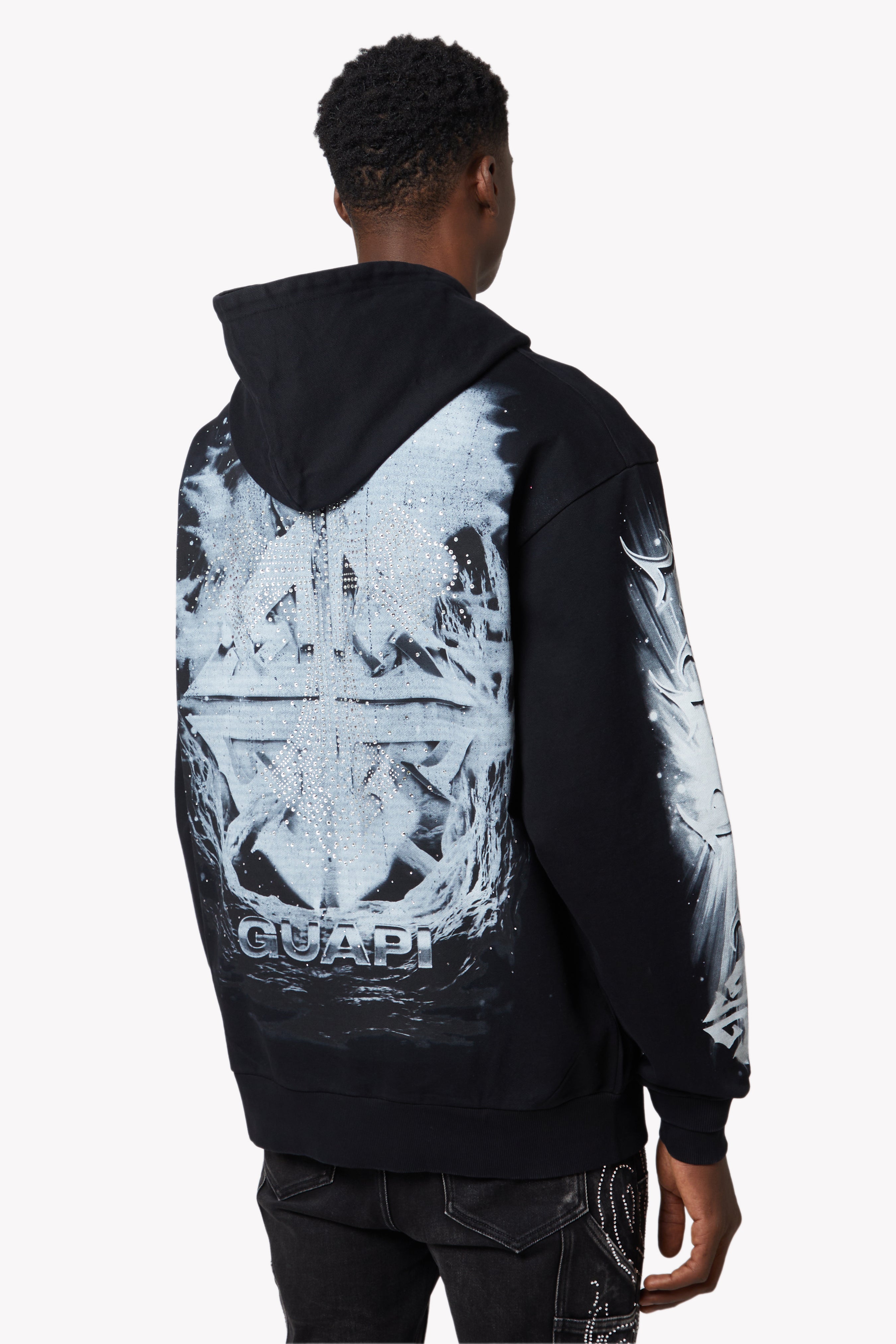 A bold visual statement rooted in GUAPI’s futuristic narrative, the Black Heavens Vault Hoodie V3 brings apocalyptic streetwear into focus with a hyper-detailed, symmetrical graphic treatment. The front showcases a mirrored double-eagle motif fused with celestial textures, skull overlays, and water-like distortions—all drenched in icy tones of white and blue. Rhinestone embellishments illuminate the print with multidimensional shine, adding movement and contrast.
