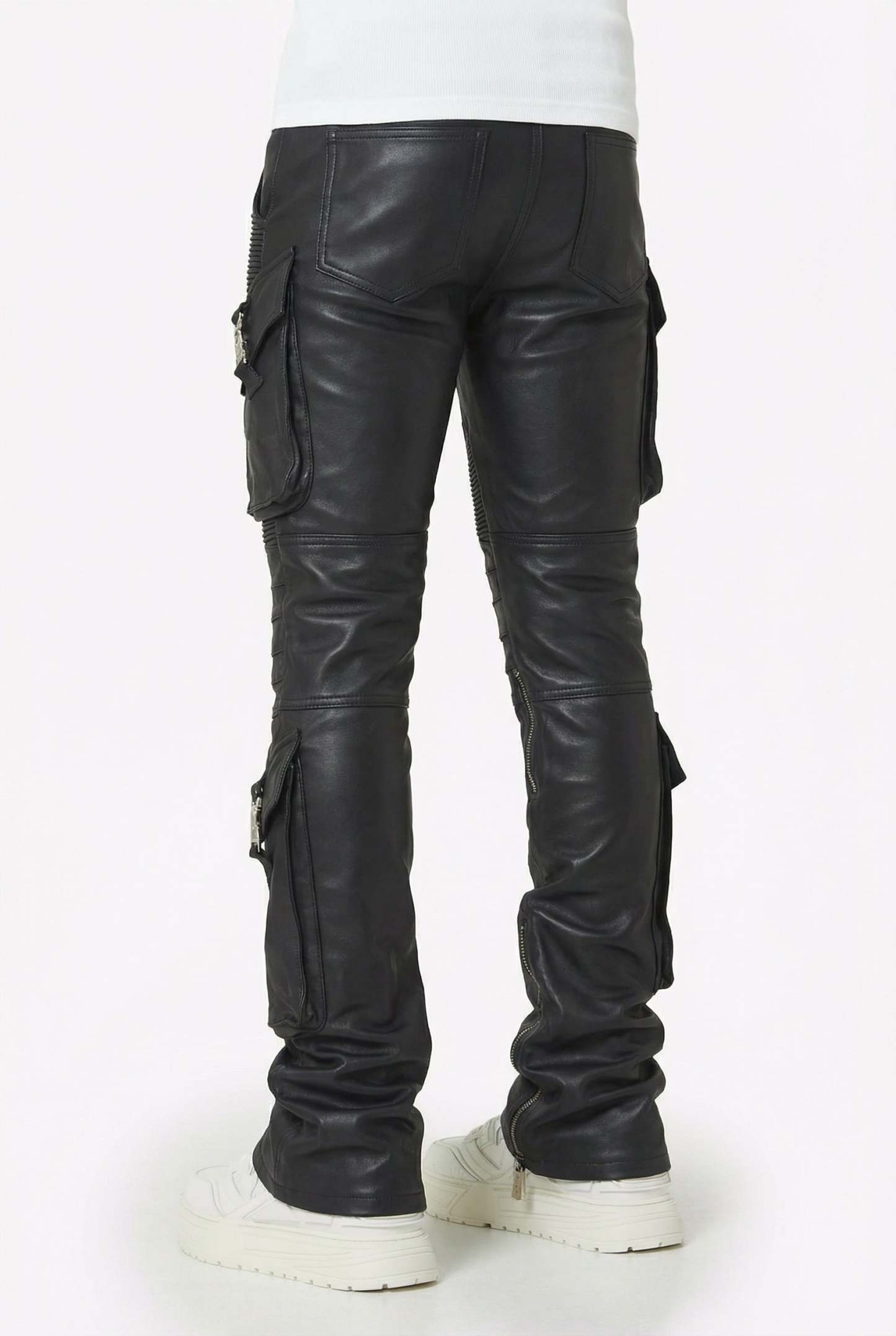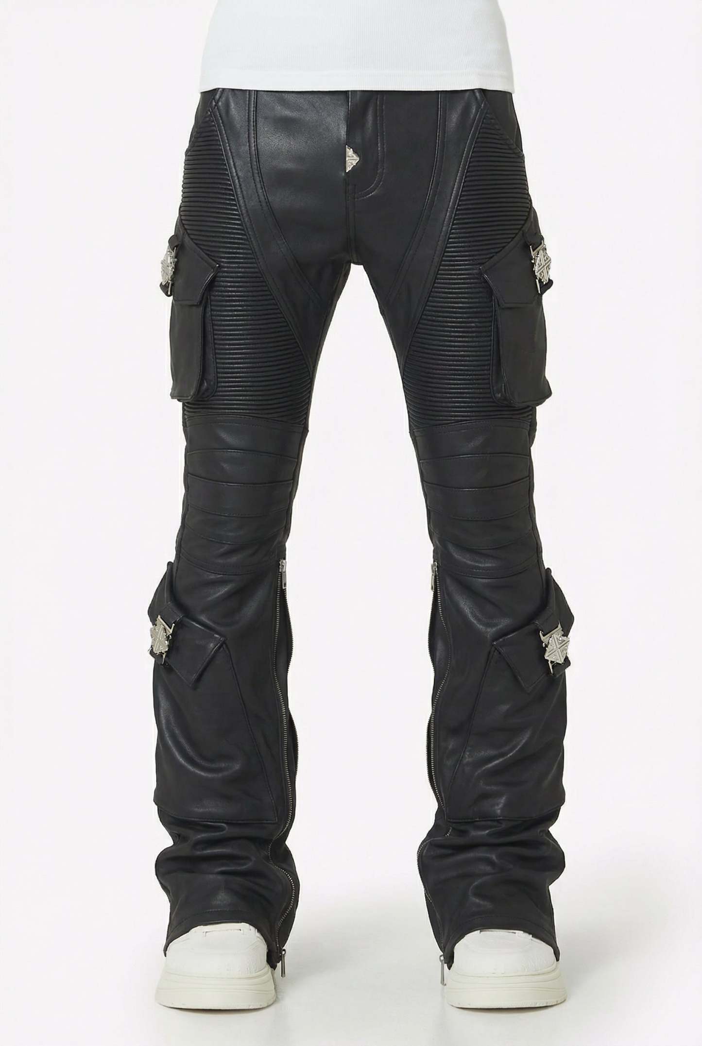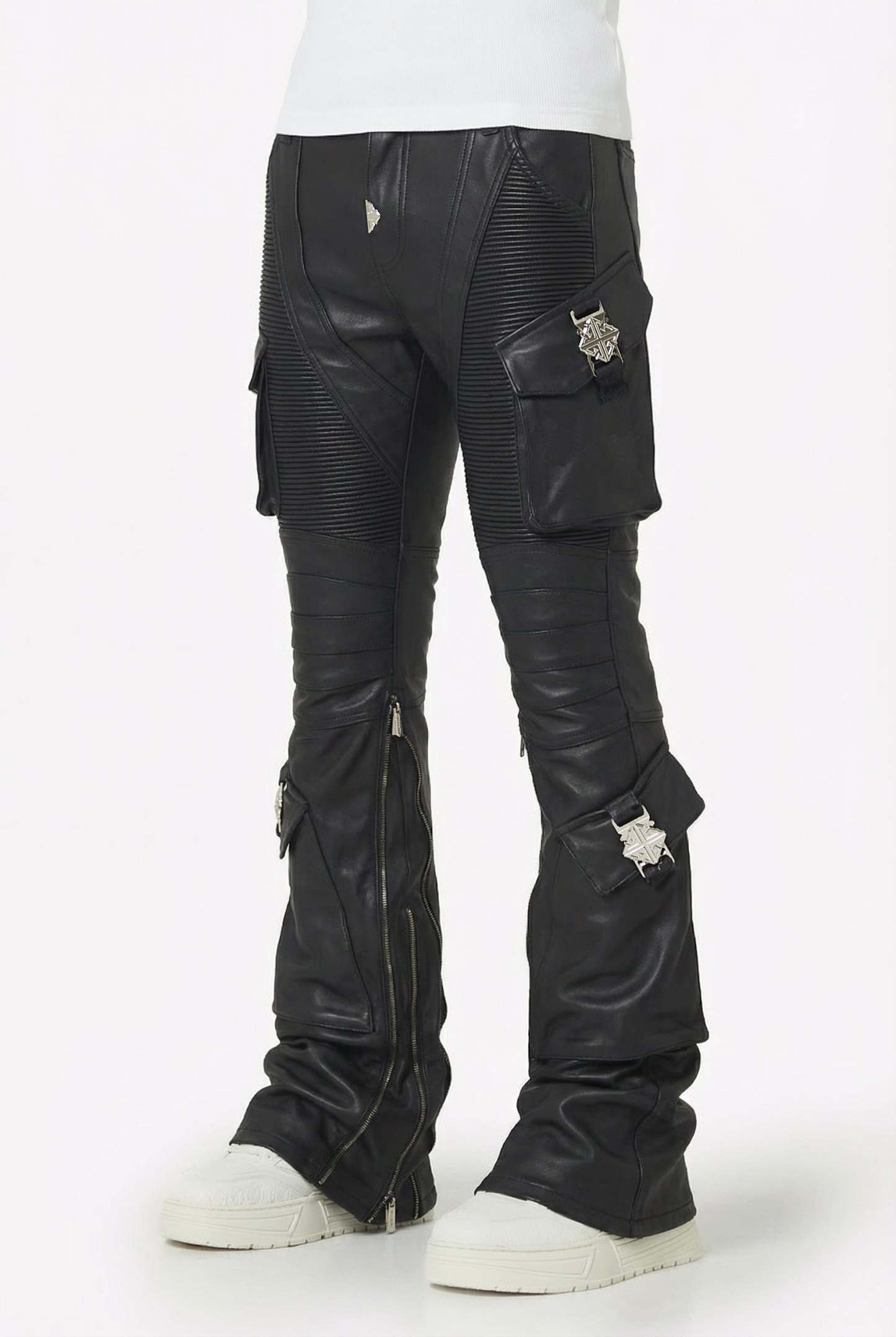 Ribbed moto paneling wraps around the thighs and knees, adding depth and movement while enhancing the sculpted fit. Multiple cargo pockets sit on both legs, each secured with heavyweight custom metal buckles featuring GUAPI’s engraved emblem. Diagonal seam lines, articulated knee construction, and inner-calf zippers give the denim a flexible, stacked profile that sits clean over sneakers.