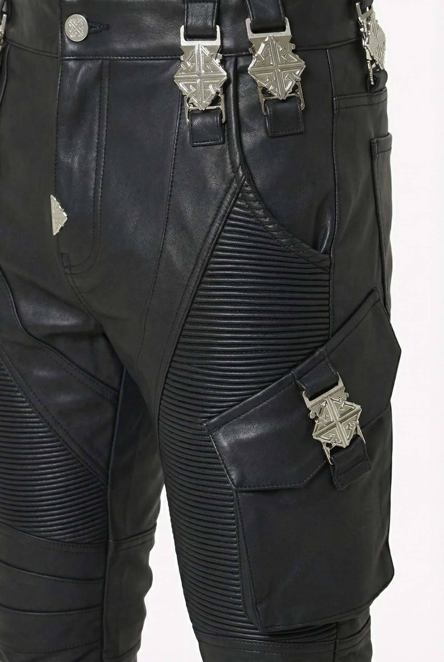 Diagonal seam work, sculpted knee panels, and layered constructions that define the leg shape.