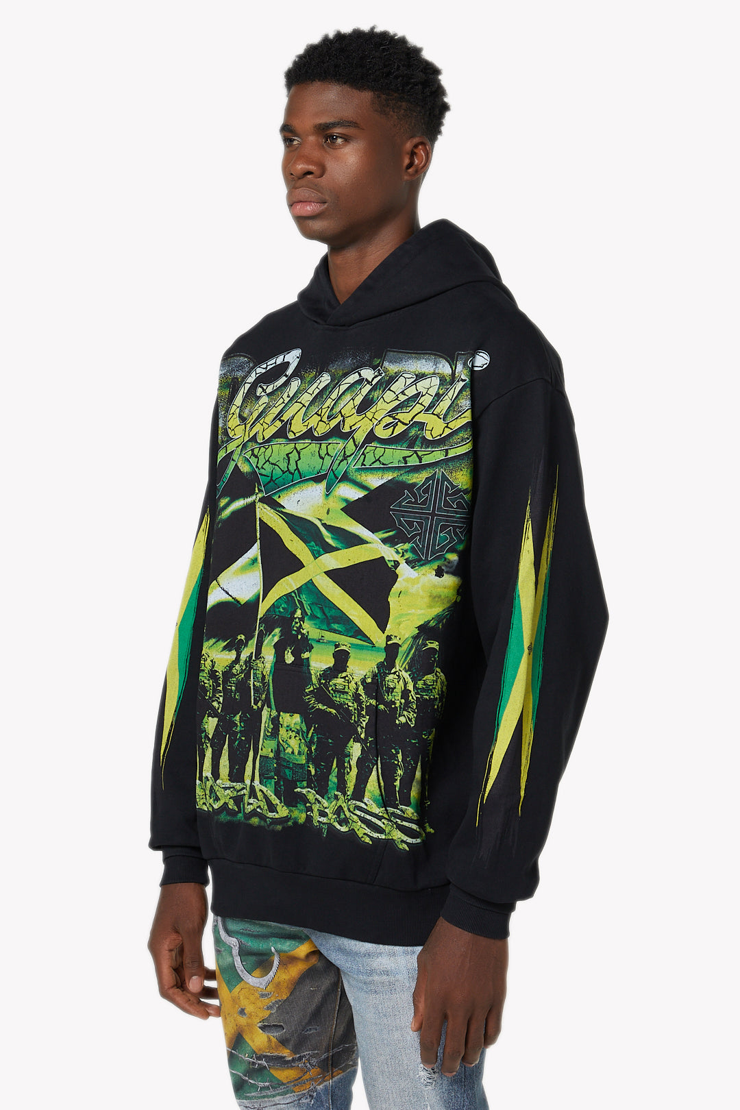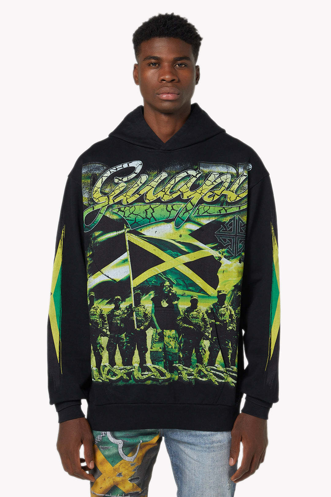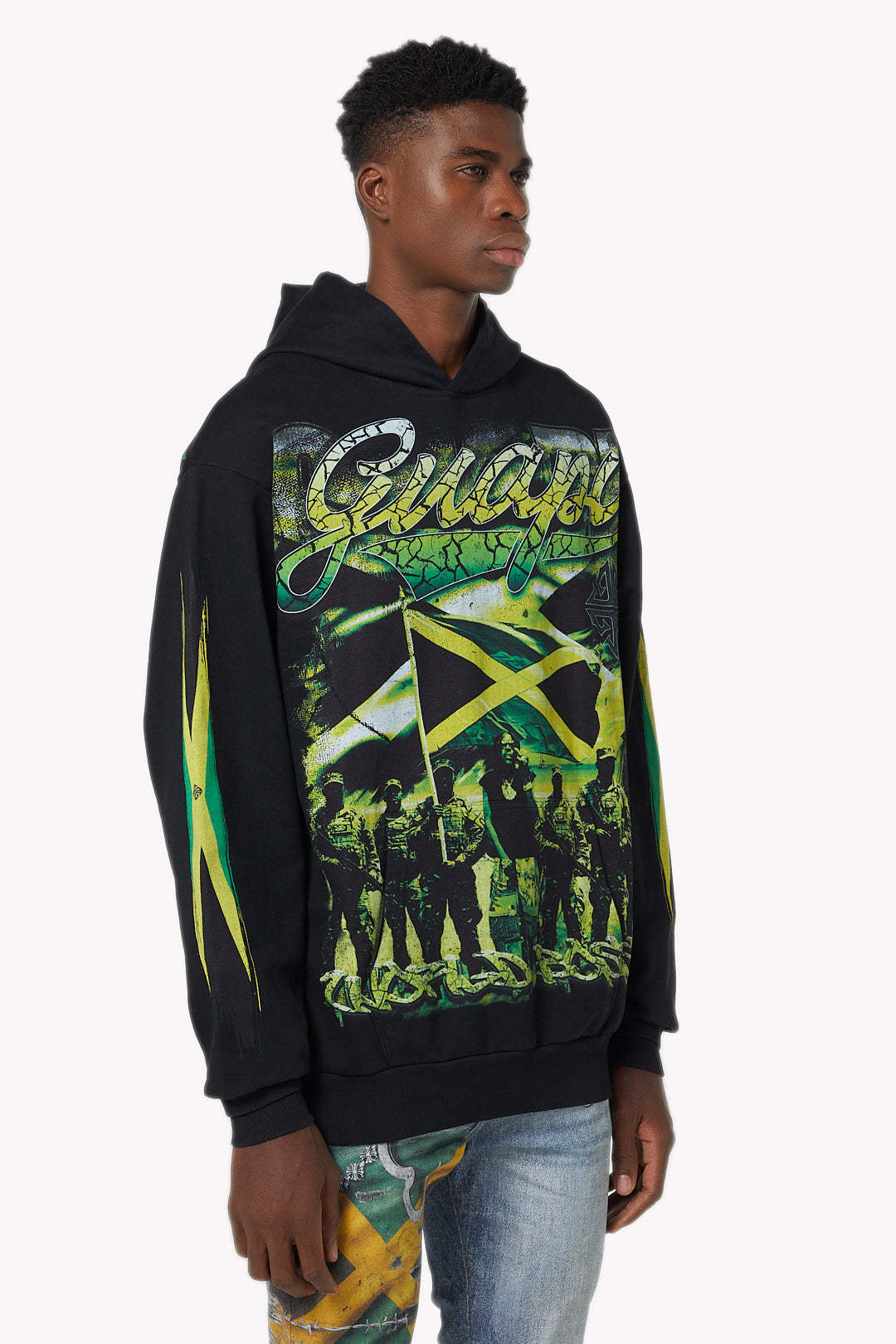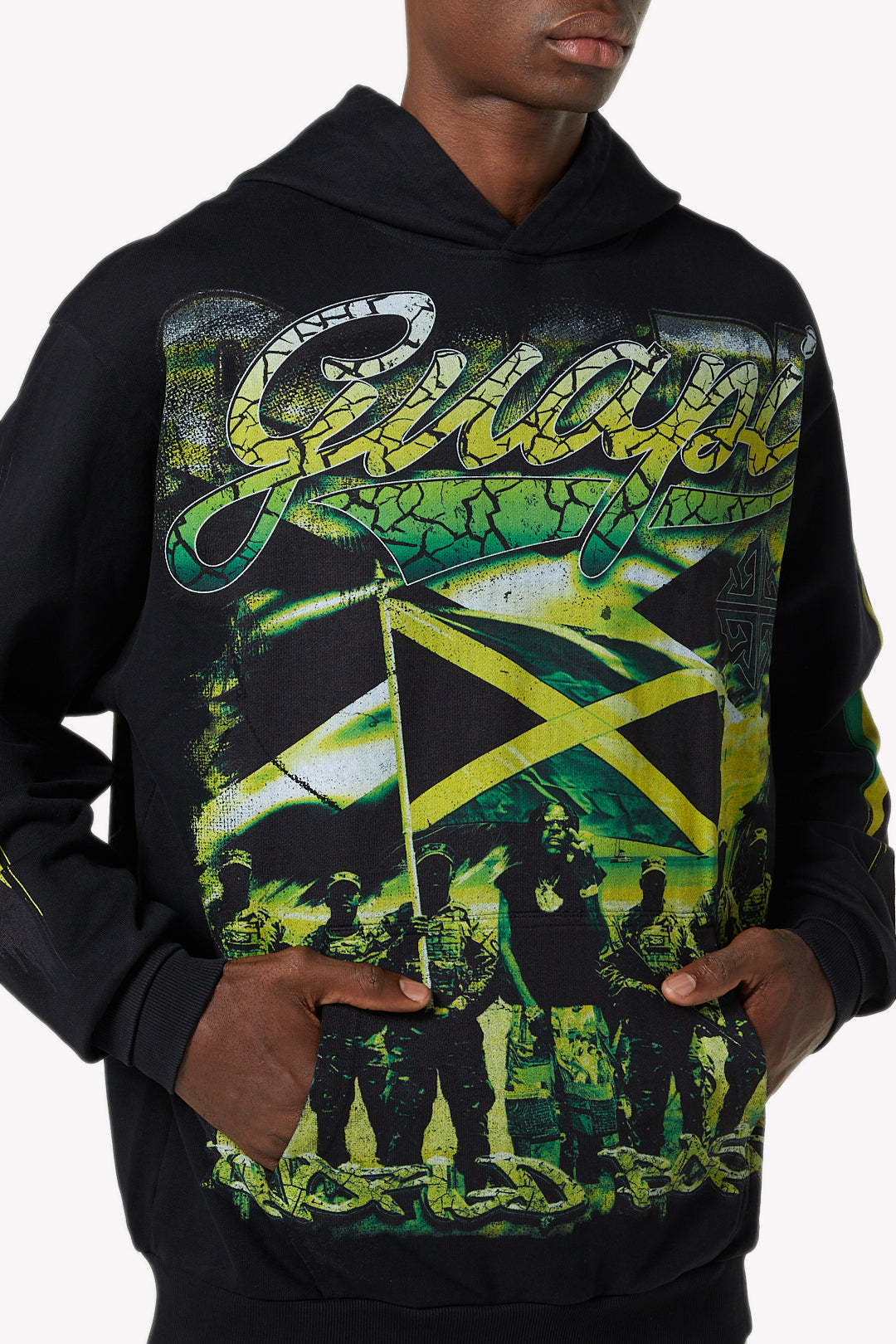 The front design features an oversized Jamaican flag graphic layered over a militant-inspired group illustration, symbolizing strength and resilience. Above the artwork, bold “Guapi” script branding sits against a cracked green texture, adding a distressed yet powerful effect. Both sleeves carry elongated Jamaican flag graphics for symmetry and continuity.