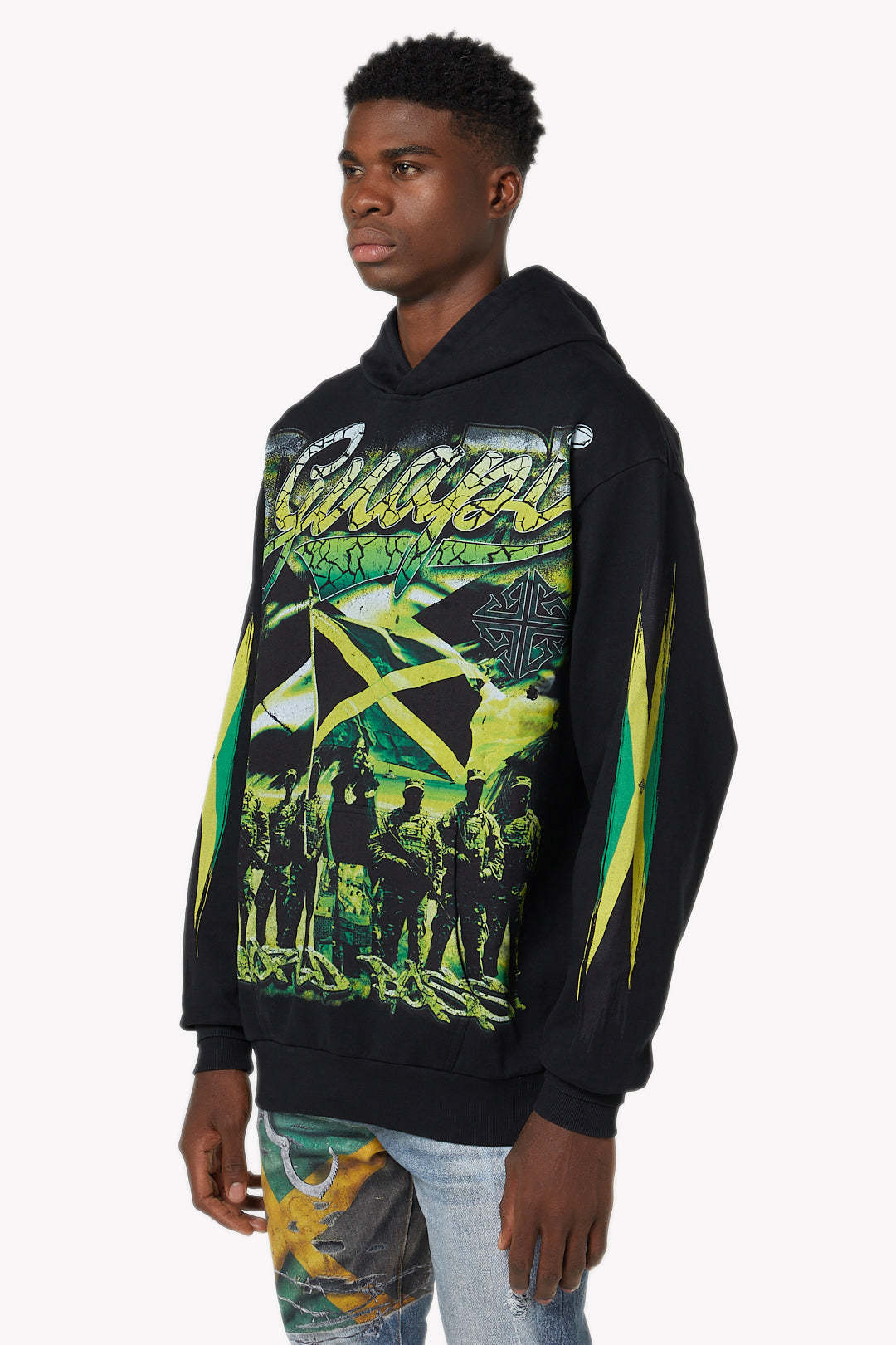 - Jamaican flag artwork with militant group illustration on the front