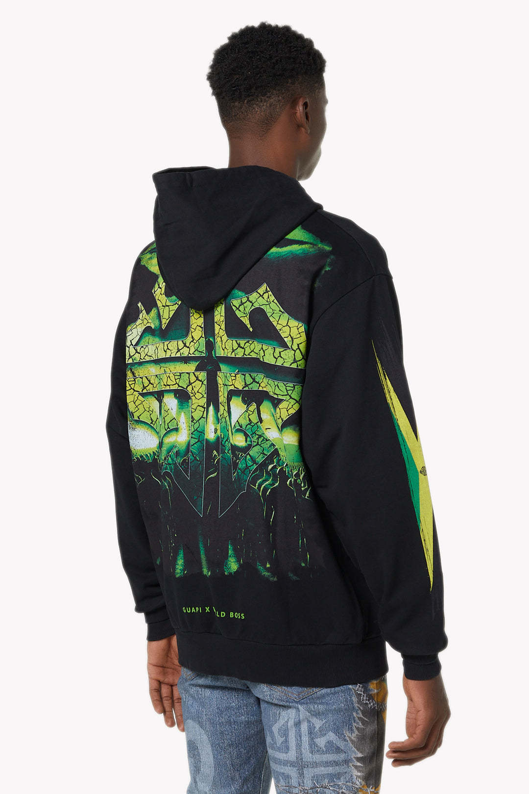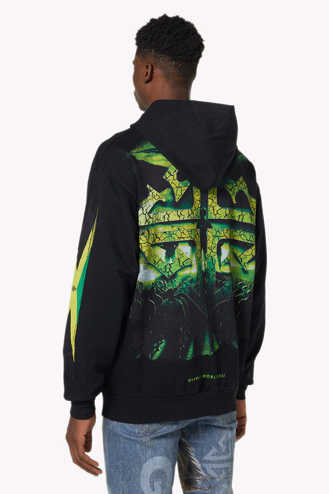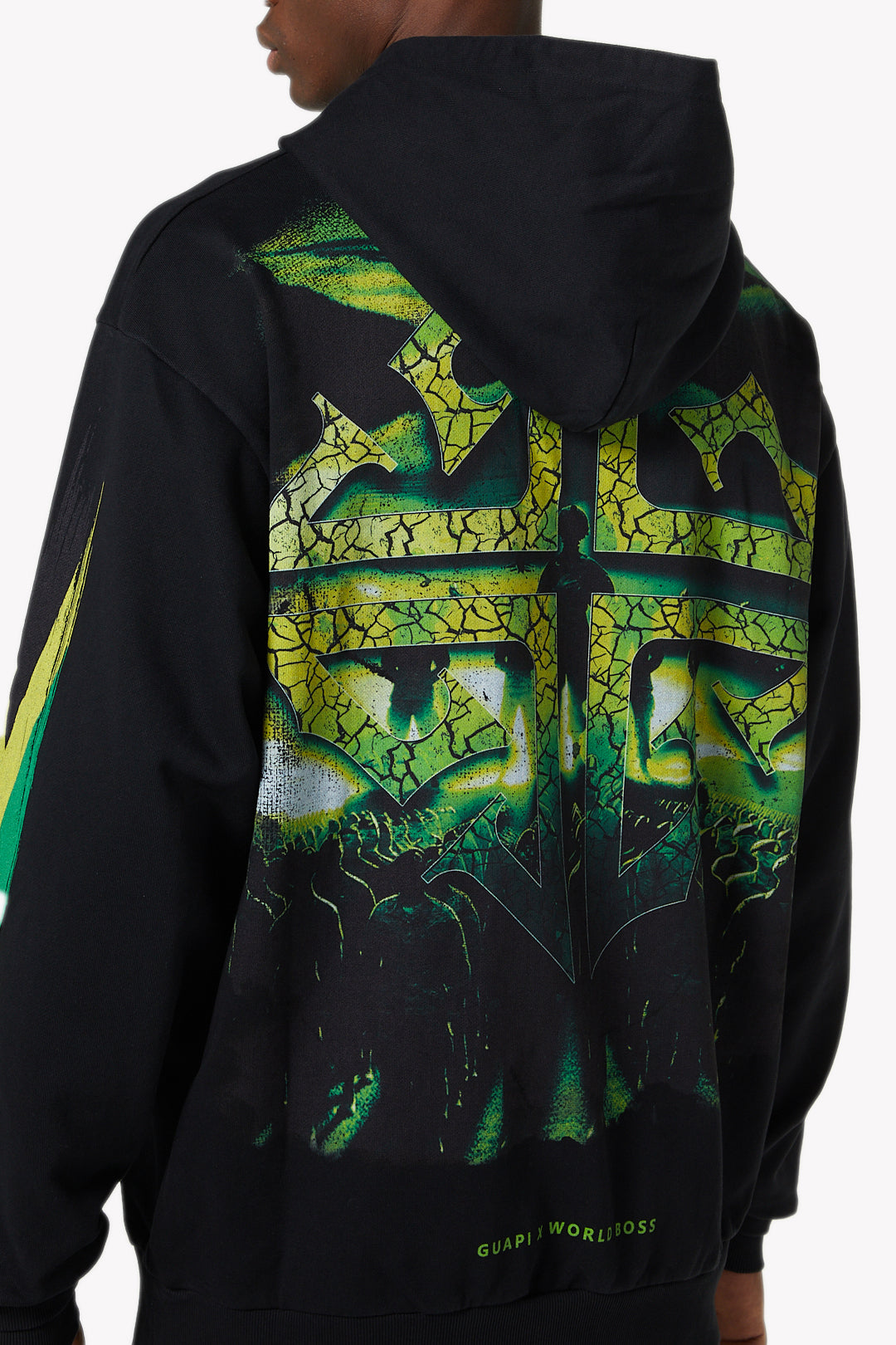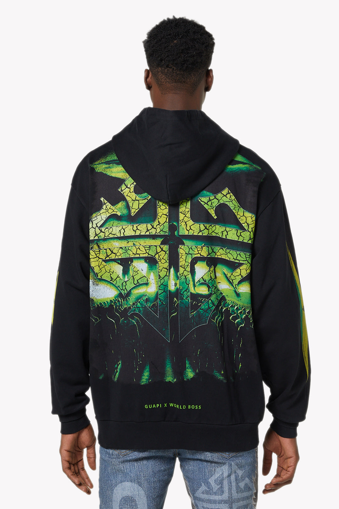 The back showcases a large scale cracked green cross emblem, backed by a shadowy crowd, creating a commanding visual that amplifies the hoodie’s message of collective power. Finishing details include ribbed cuffs and hem, kangaroo pouch pocket, and “GUAPI x WORLD BOSS” branding along the lower back.