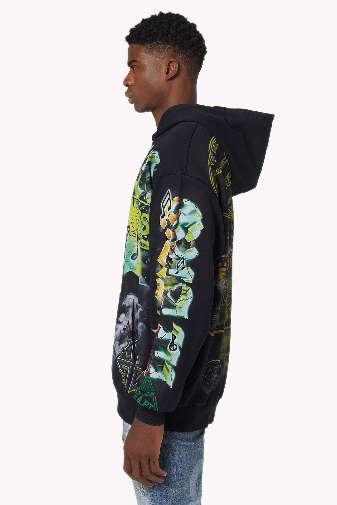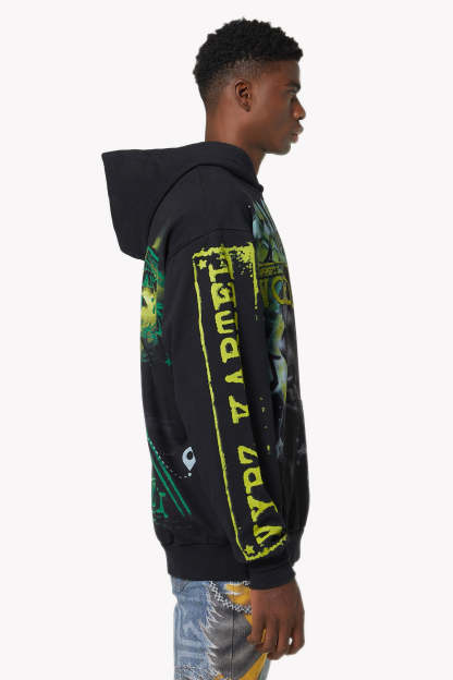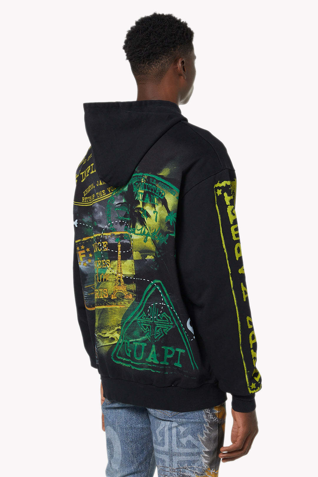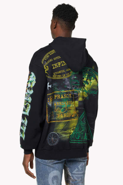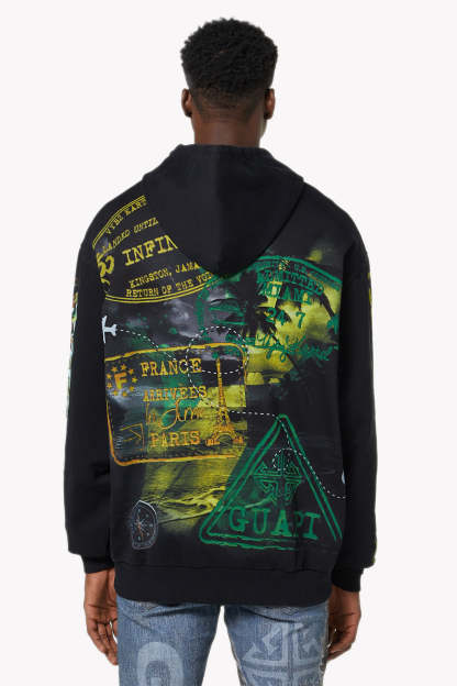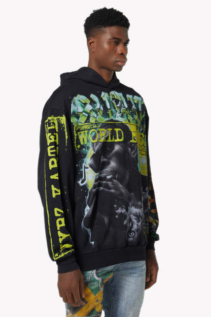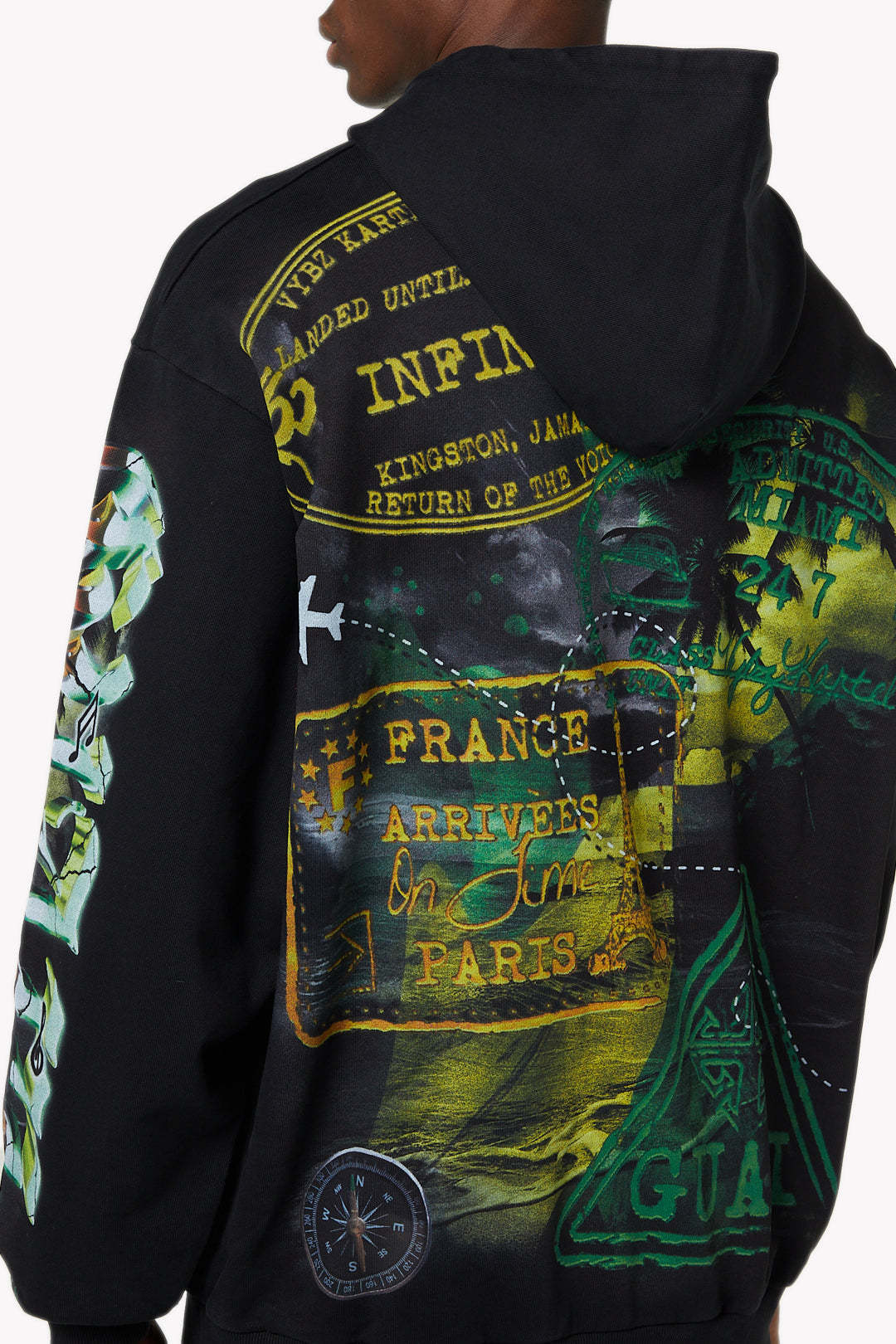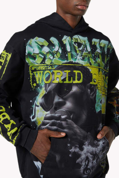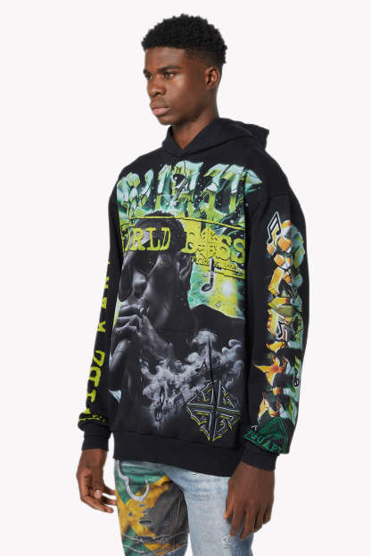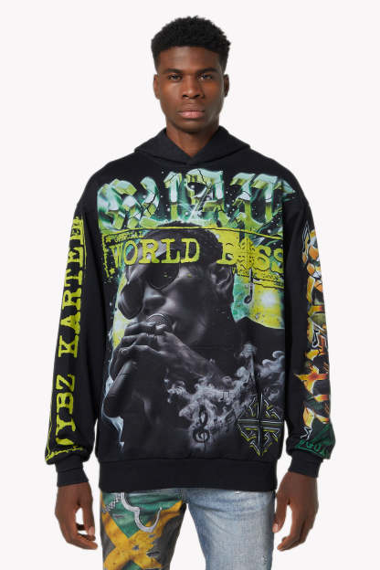 The Black World Boss Hoodie V2 stands out as a bold streetwear statement, combining cultural tribute with striking design elements. Crafted in deep black cotton, the hoodie is dominated by an oversized airbrushed graphic of Vybz Kartel at the front, styled in vibrant neon green, yellow, and smoky grey tones for a high-impact look. The sleeves are detailed with bold lettering and graffiti-inspired artwork, adding to its urban edge. On the back, passport stamp motifs, tropical imagery, and GUAPI branding continue the narrative of global influence and freedom. A relaxed silhouette ensures comfort, while the vibrant artwork cements its position as a collector’s piece in the World Boss collection.