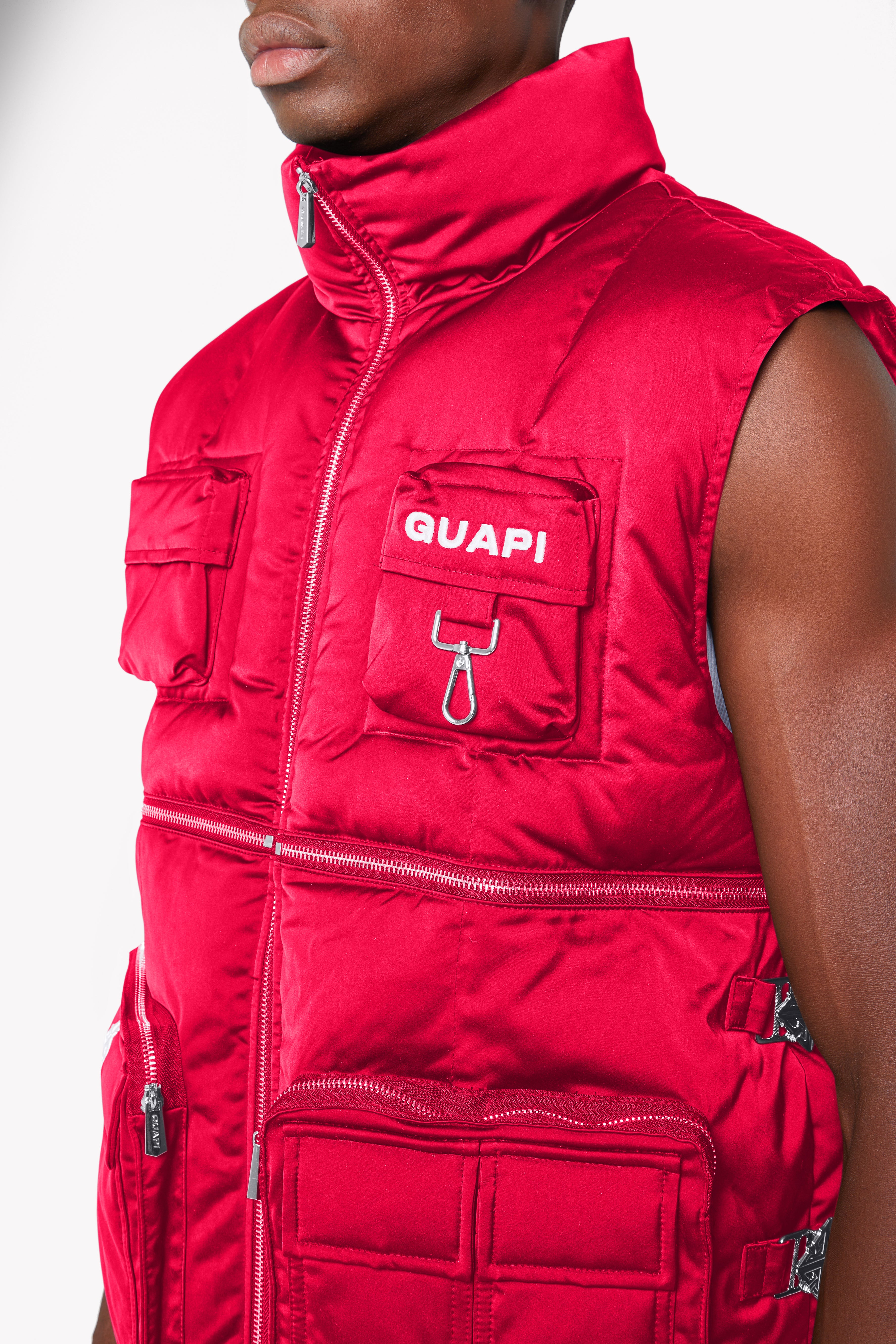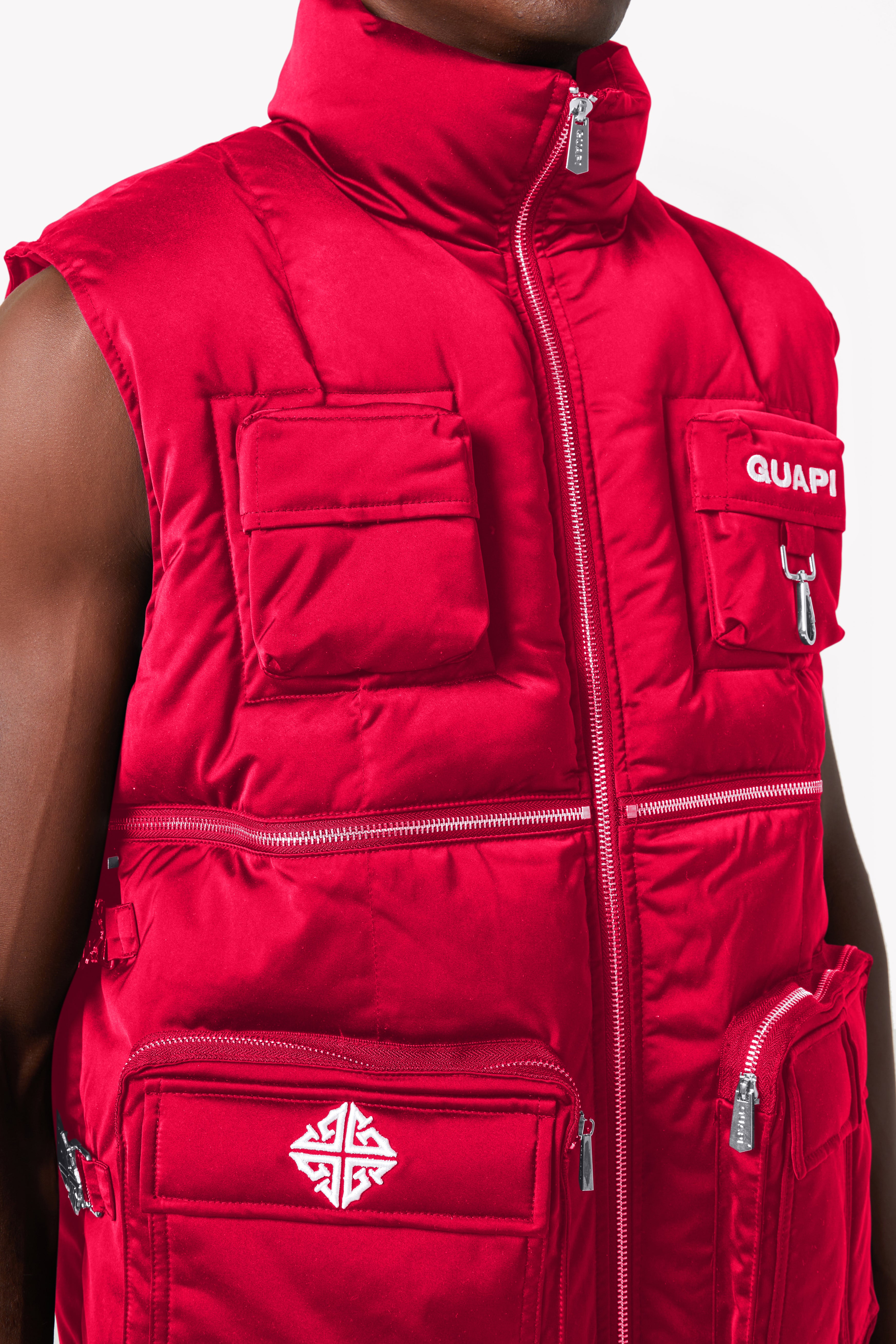 Make a bold statement with the GUAPI Blood Red Puffer Vest, a perfect blend of striking design and practicality. Crafted in a deep, rich red shade, this vest stands out with its sleek finish and functional details. It has multiple utility pockets and a high-collar design, ensuring both style and versatility. The back showcases an oversized GUAPI icon, intricately towel-embroidered for a textured, eye-catching detail. Whether you're layering up for an urban adventure or elevating a casual look, this vest delivers warmth and undeniable style.