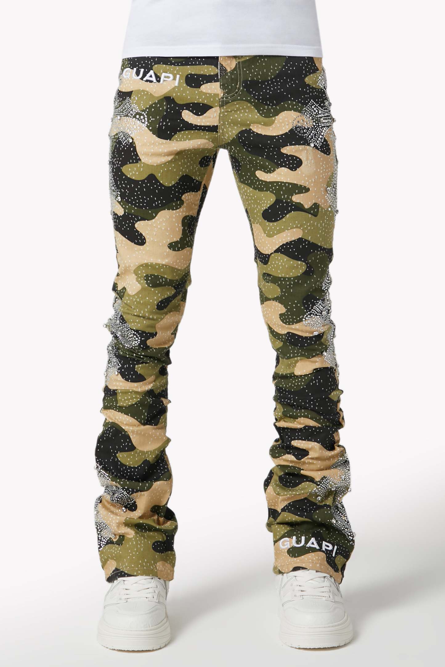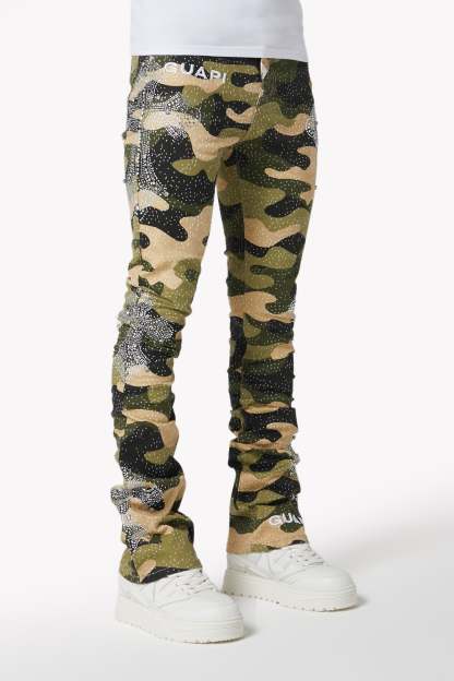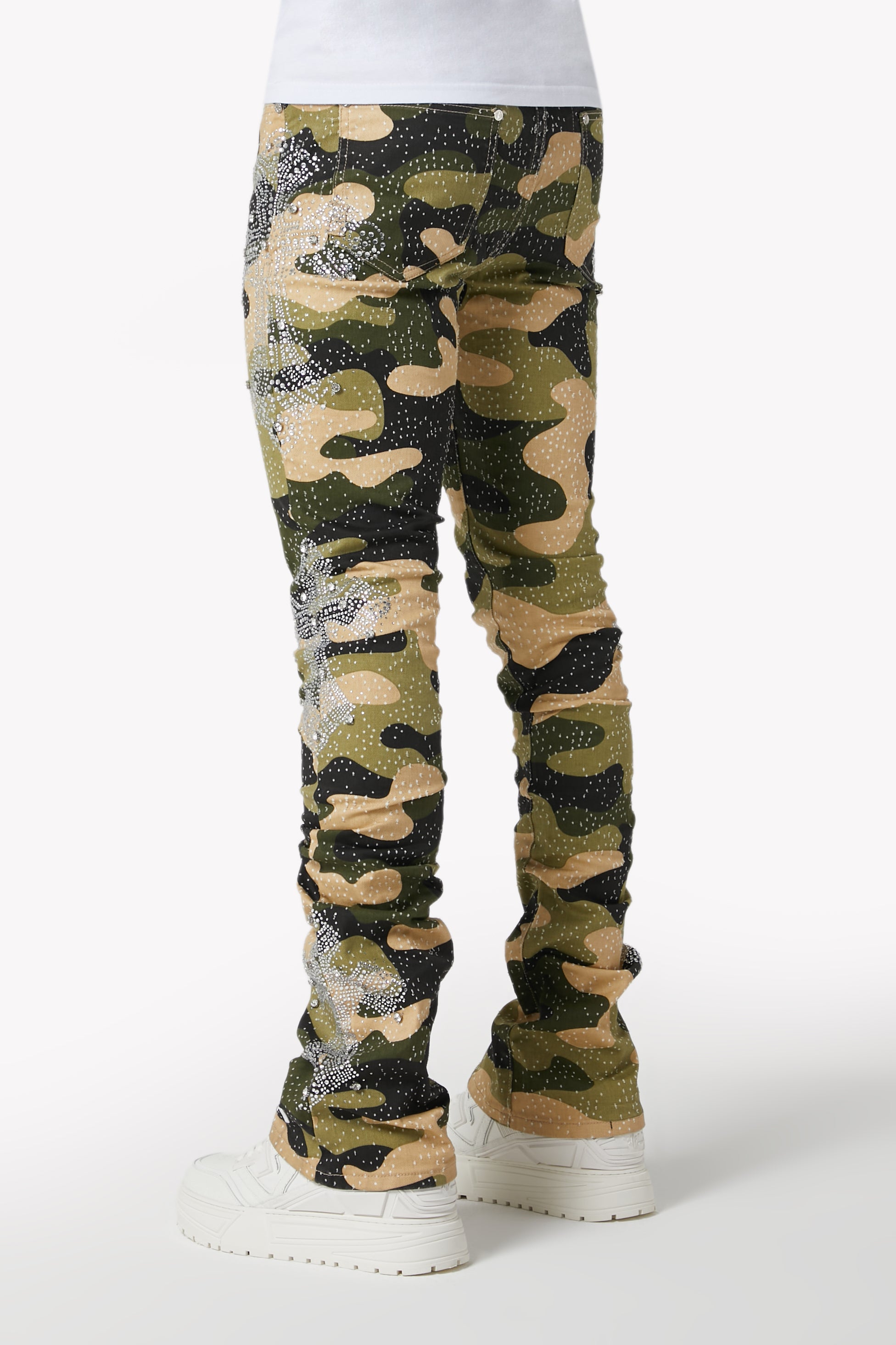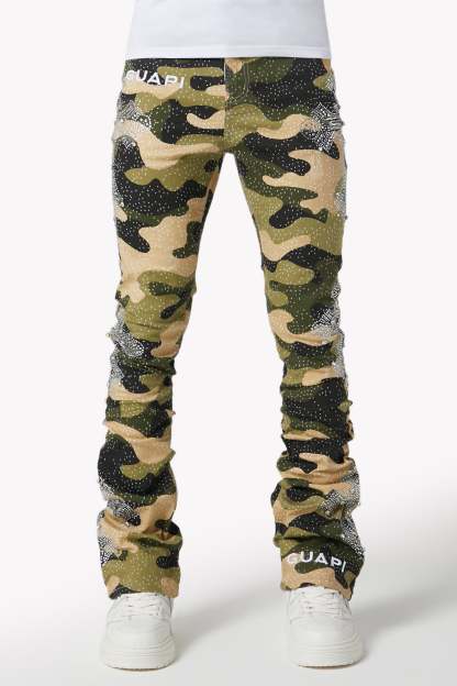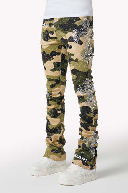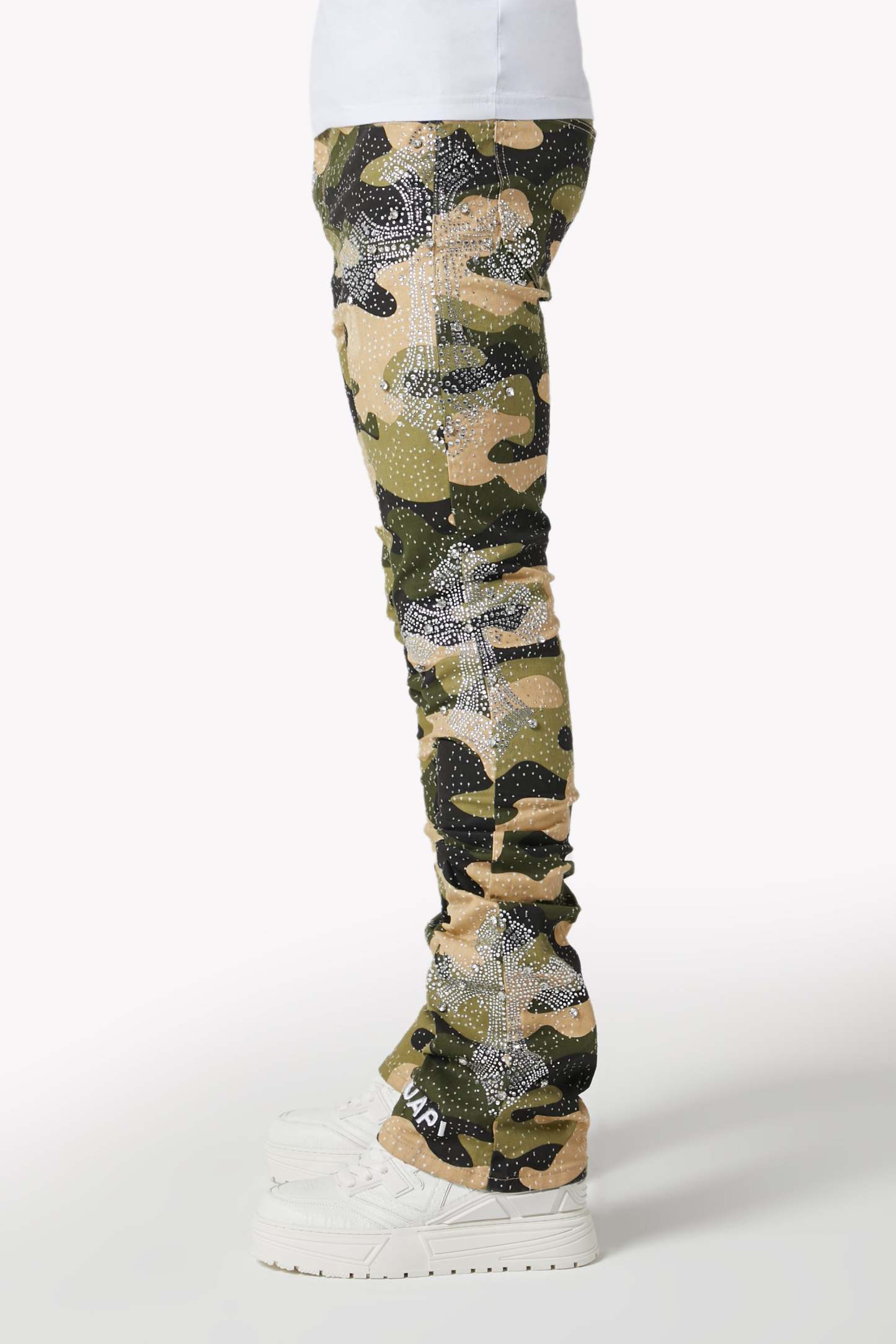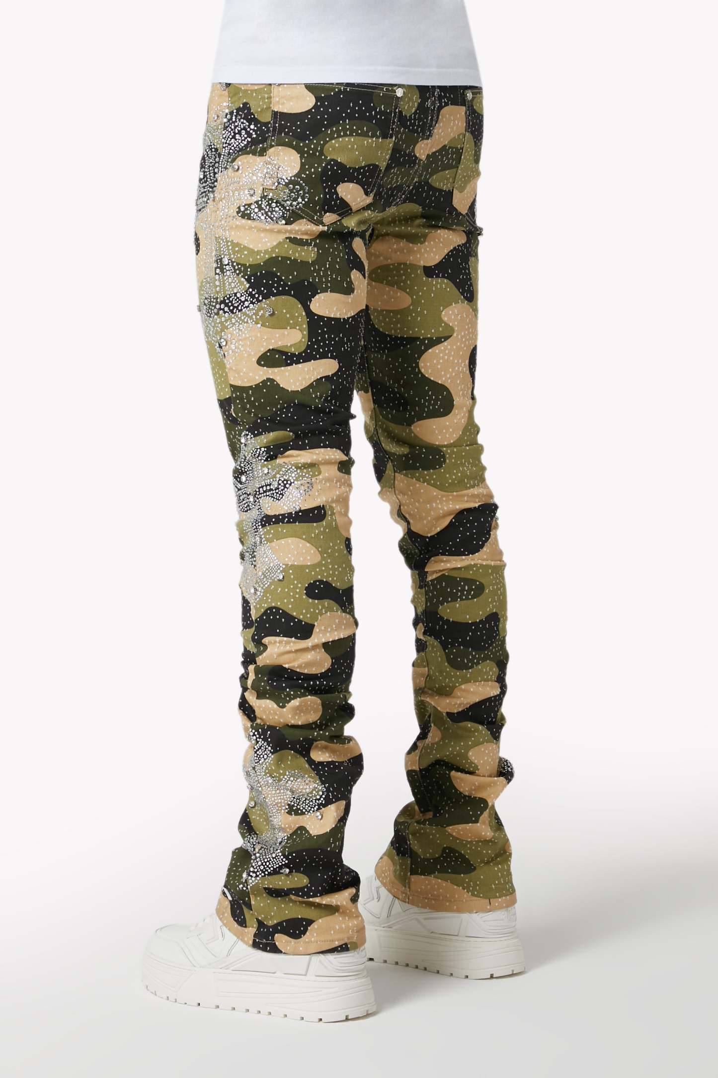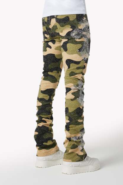 Command attention in the Camo Cross Denim, a tactical streetwear icon infused with luxury energy. Featuring a bold camouflage print and crystal-studded cross motifs, these denims fuse utilitarian patterning with intricate embellishment and modern stacked construction.