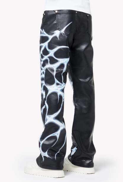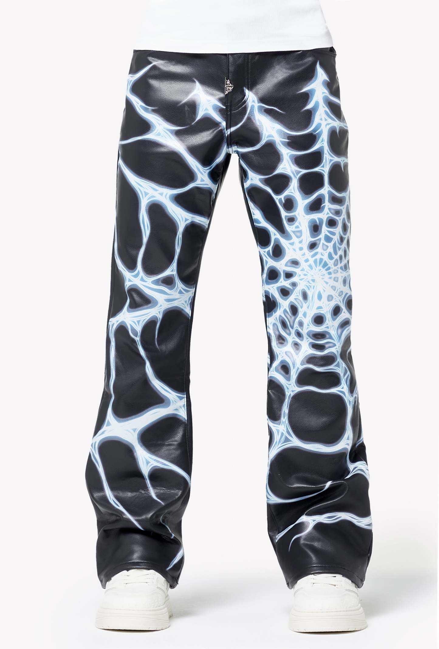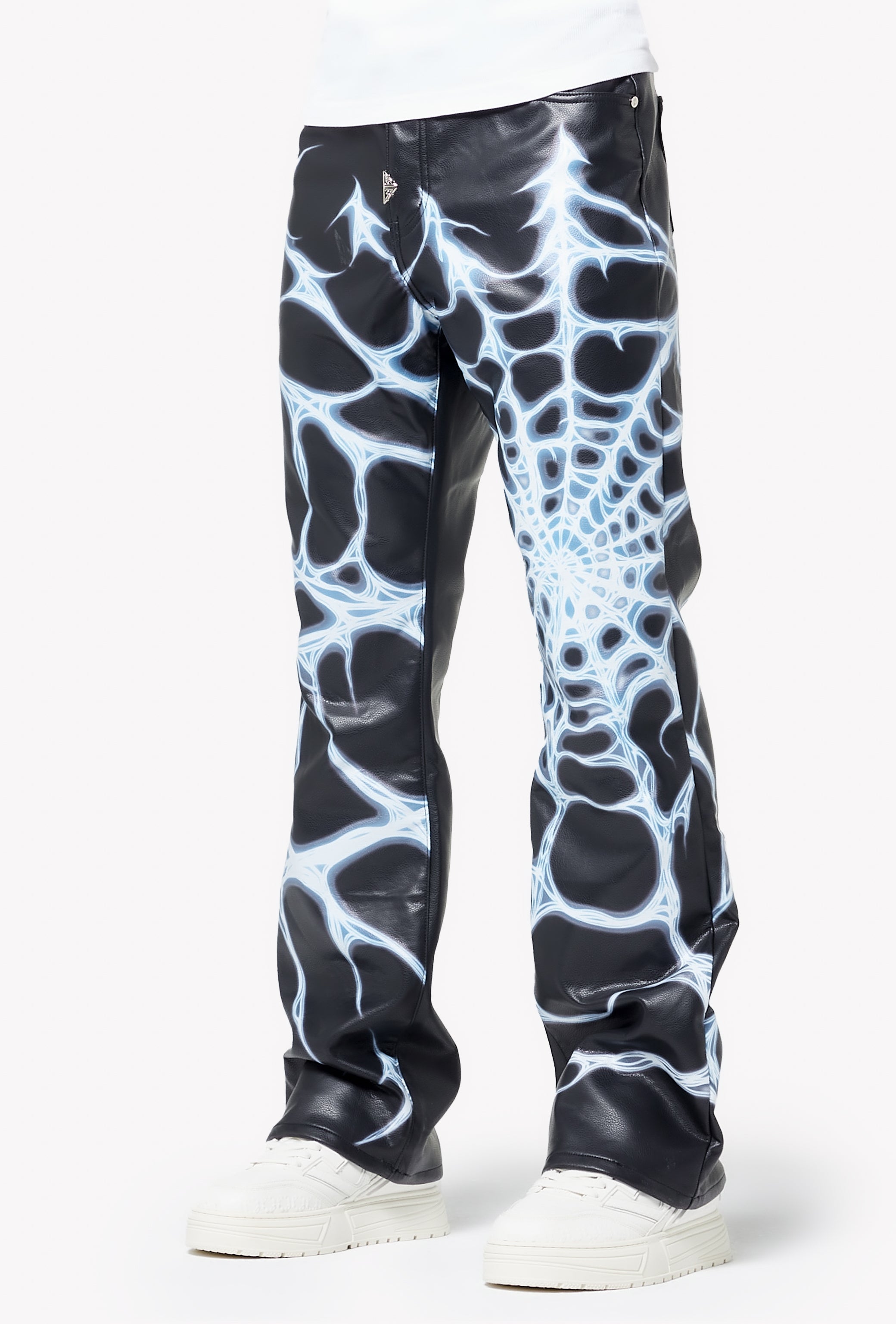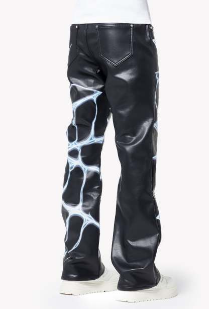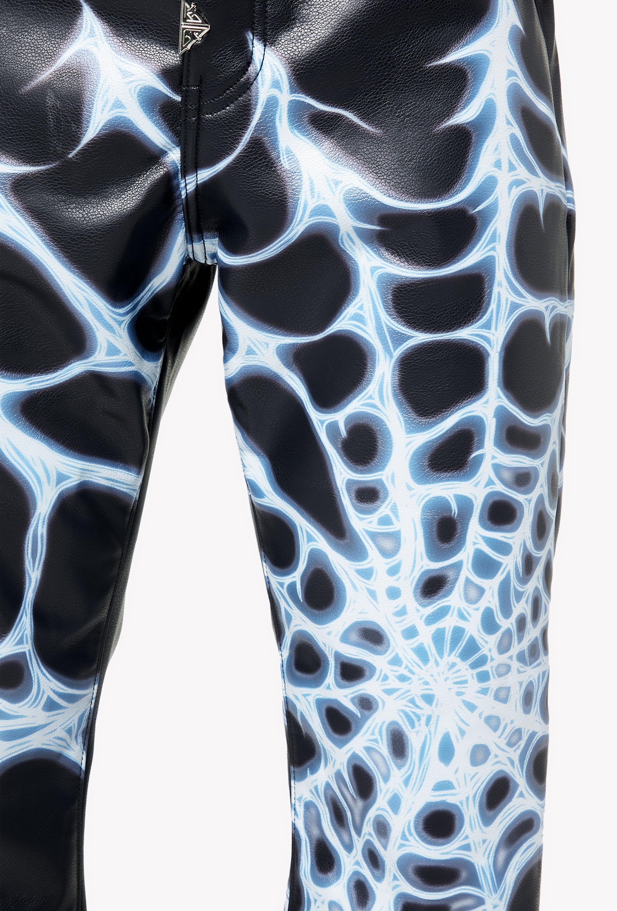 The Chrome Web Leather Pant brings a bold, futuristic edge to classic leatherwear, blending GUAPI’s signature silhouette with an electrifying digital graphic. Crafted from premium black faux leather, the pants are finished with a hyper-detailed chrome-blue web pattern that wraps around the legs like liquid electricity. The glossy surface enhances the print’s depth, giving the pants a striking 3D effect under light.