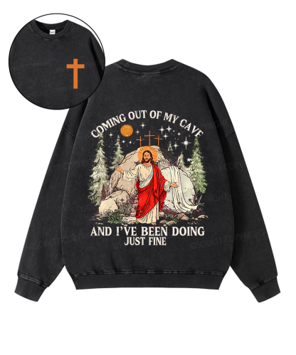 Coming Out Of My Cave And I've Been Doing Just Fine Double Sided Unisex Washed Christian Sweatshirt