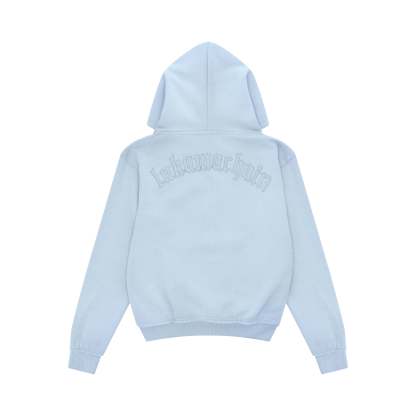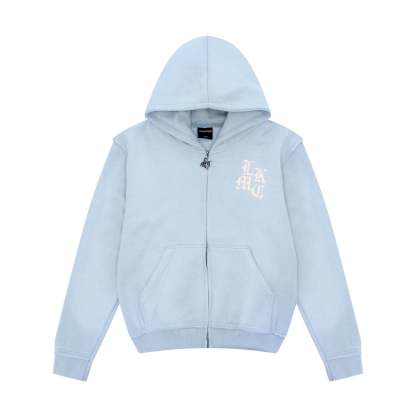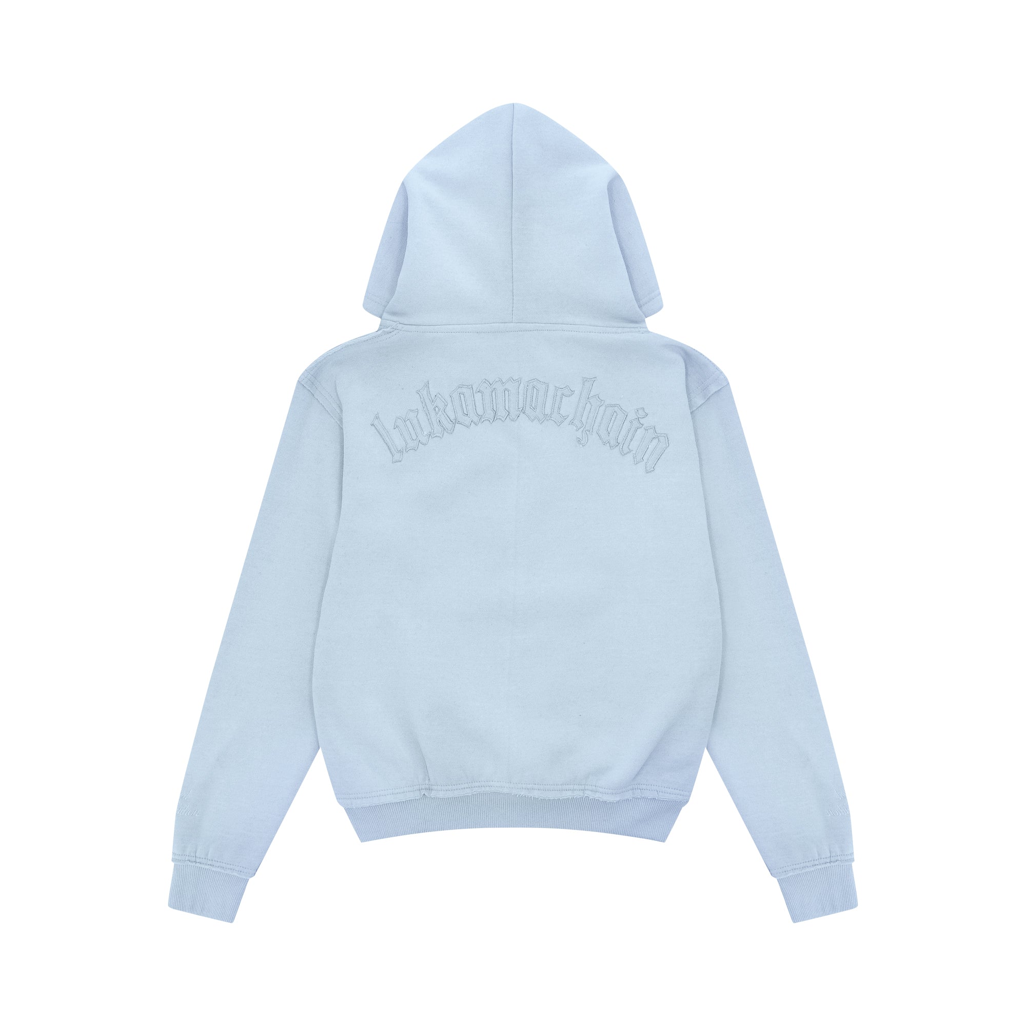 Washed & distressed baby blue zip hoodie with distressed logo embroidery on the back.