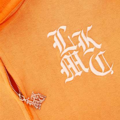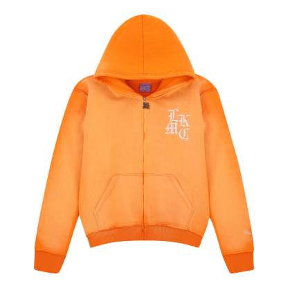 Washed & distressed Orange zip hoodie with distressed logo embroidery on the back