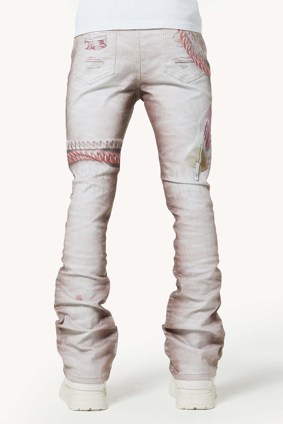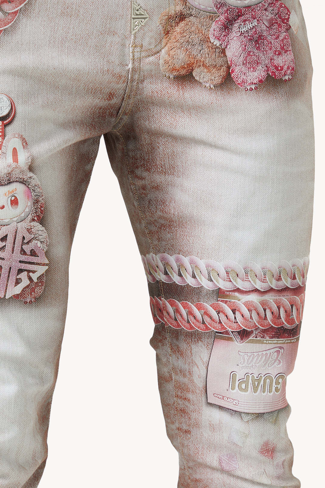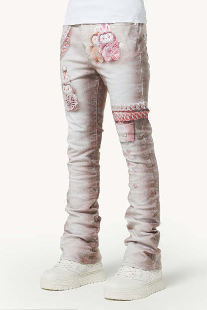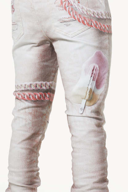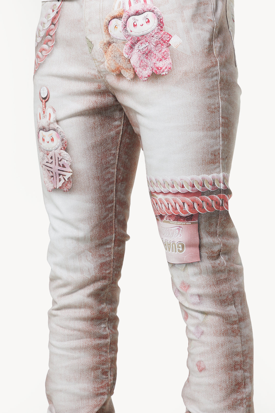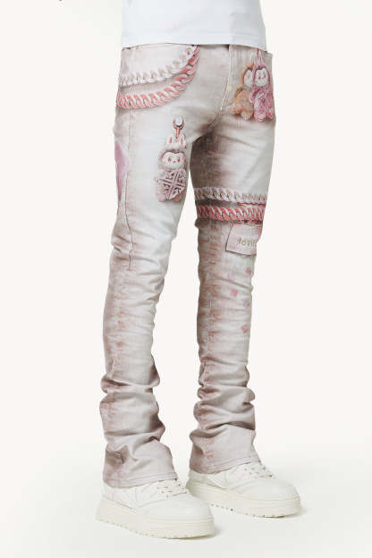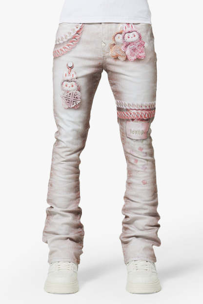 The Candy Riot Denim pushes past boundaries with surreal candy-inspired graphics stitched into our signature stacked silhouette. Every pair is designed as a wearable art piece – provocative, playful, and impossible to ignore.