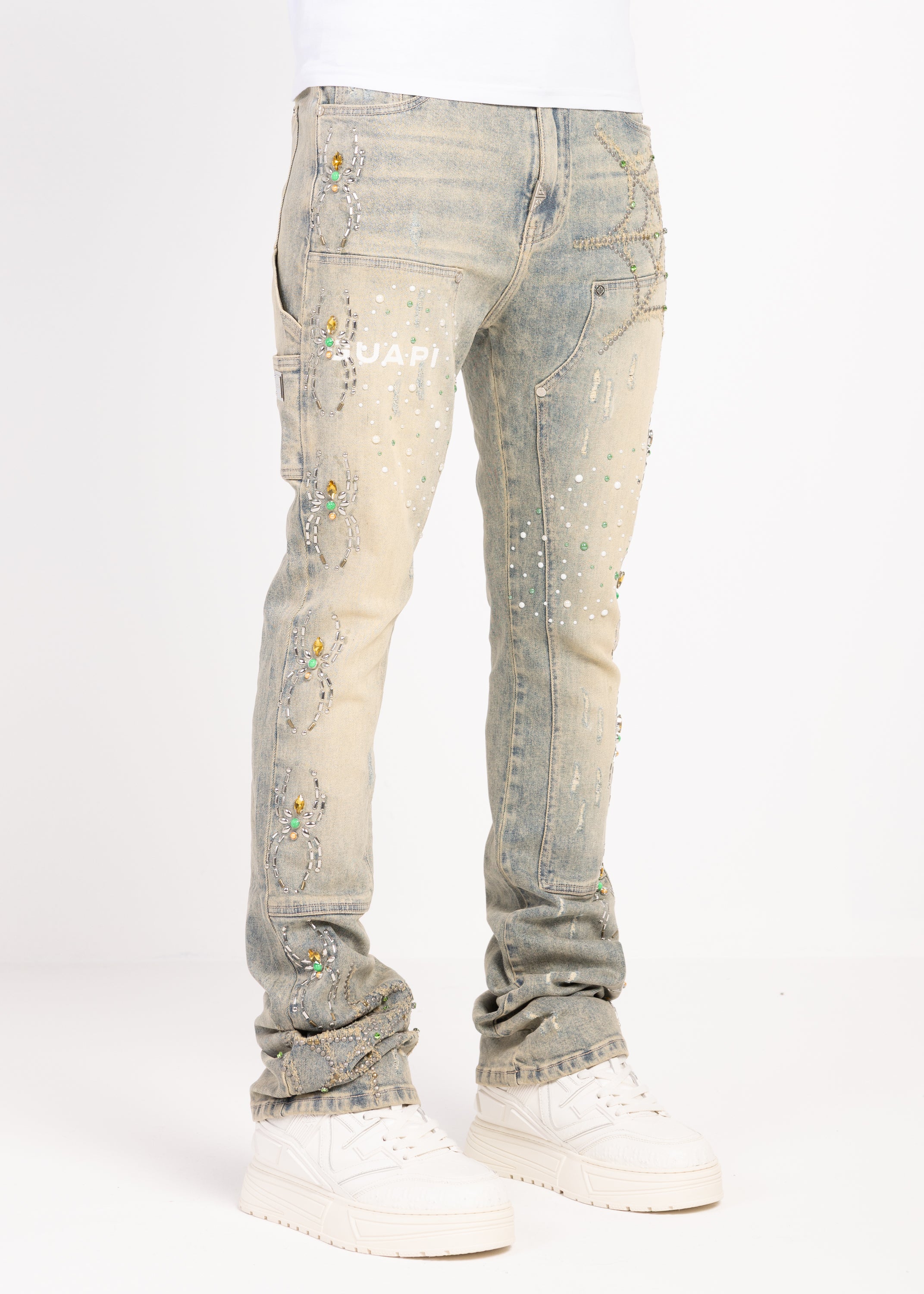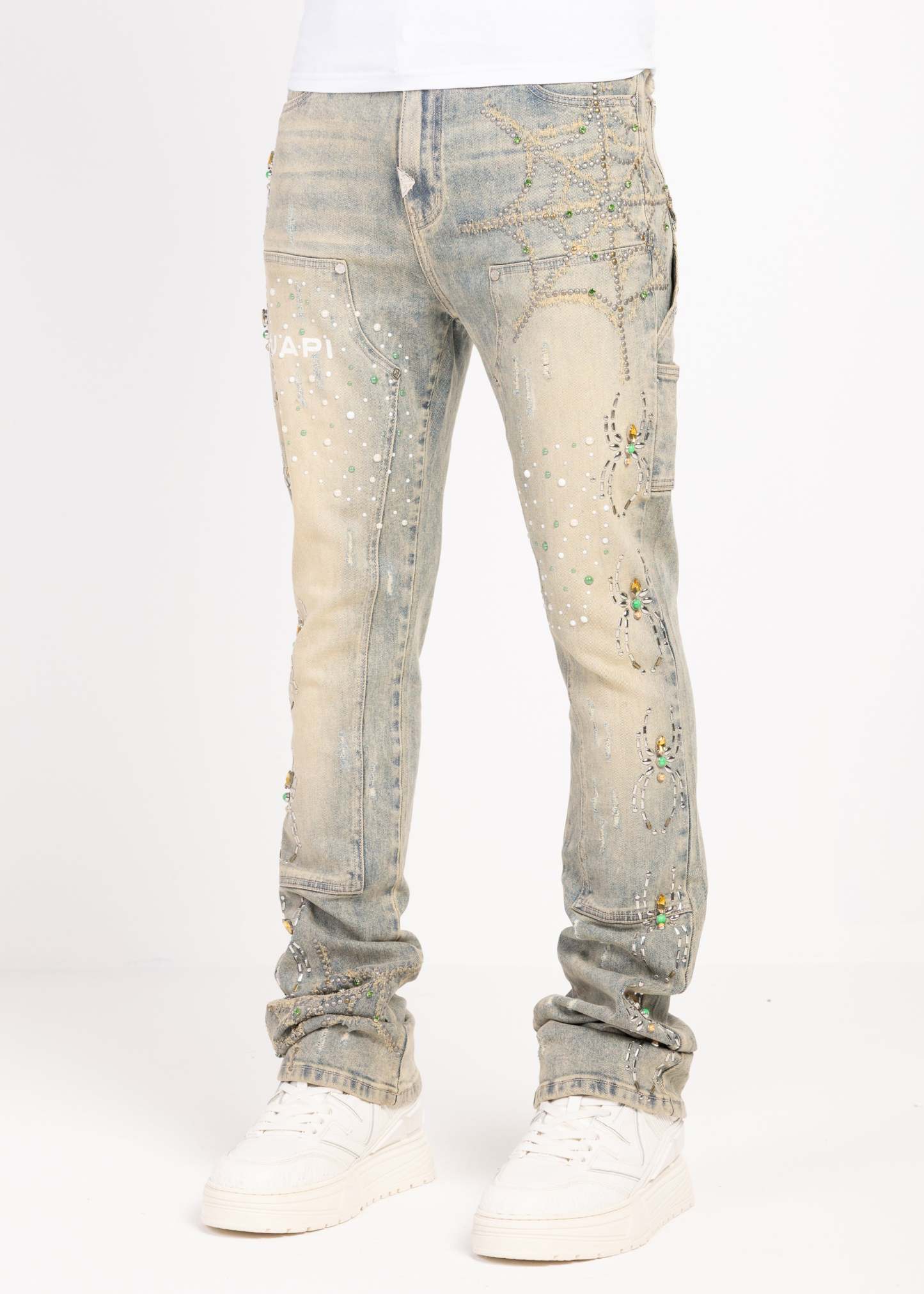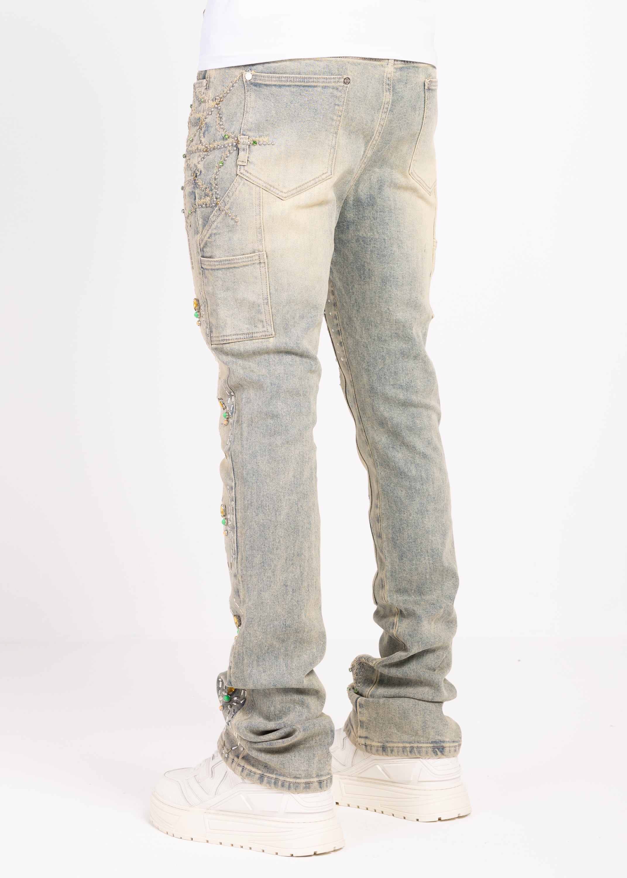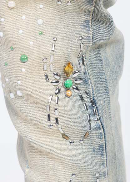 Crafted from premium denim, these statement jeans blend intricate embellishment with elevated streetwear construction. The silhouette is cut in a slim fit with extended length, allowing the fabric to stack naturally at the ankle for a bold, layered finish.