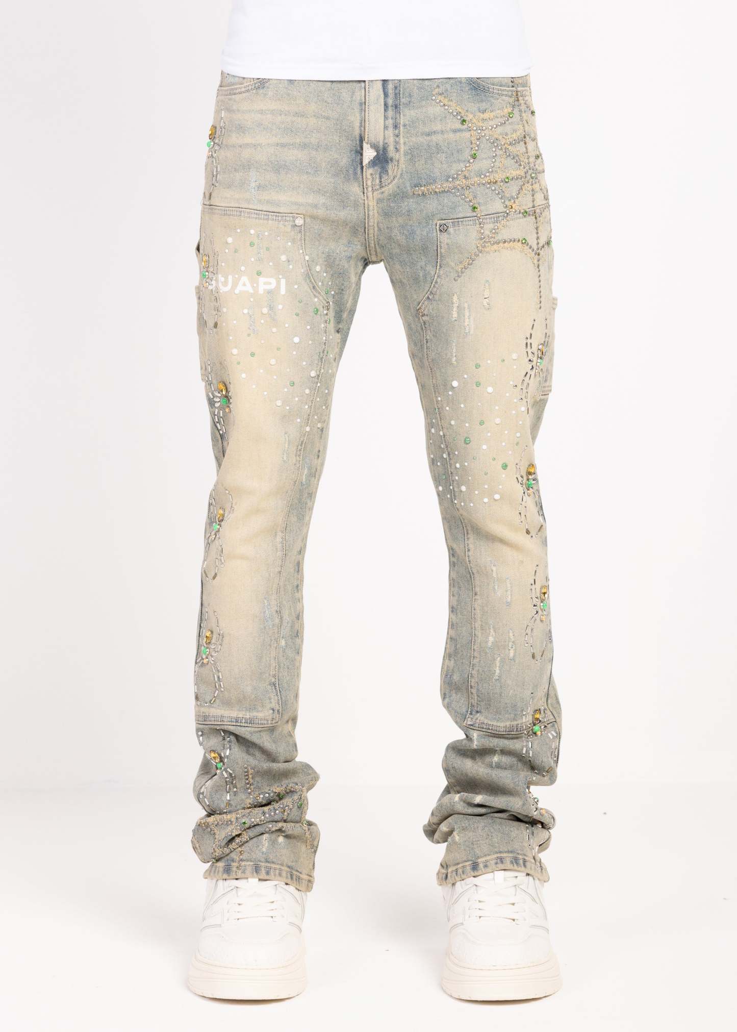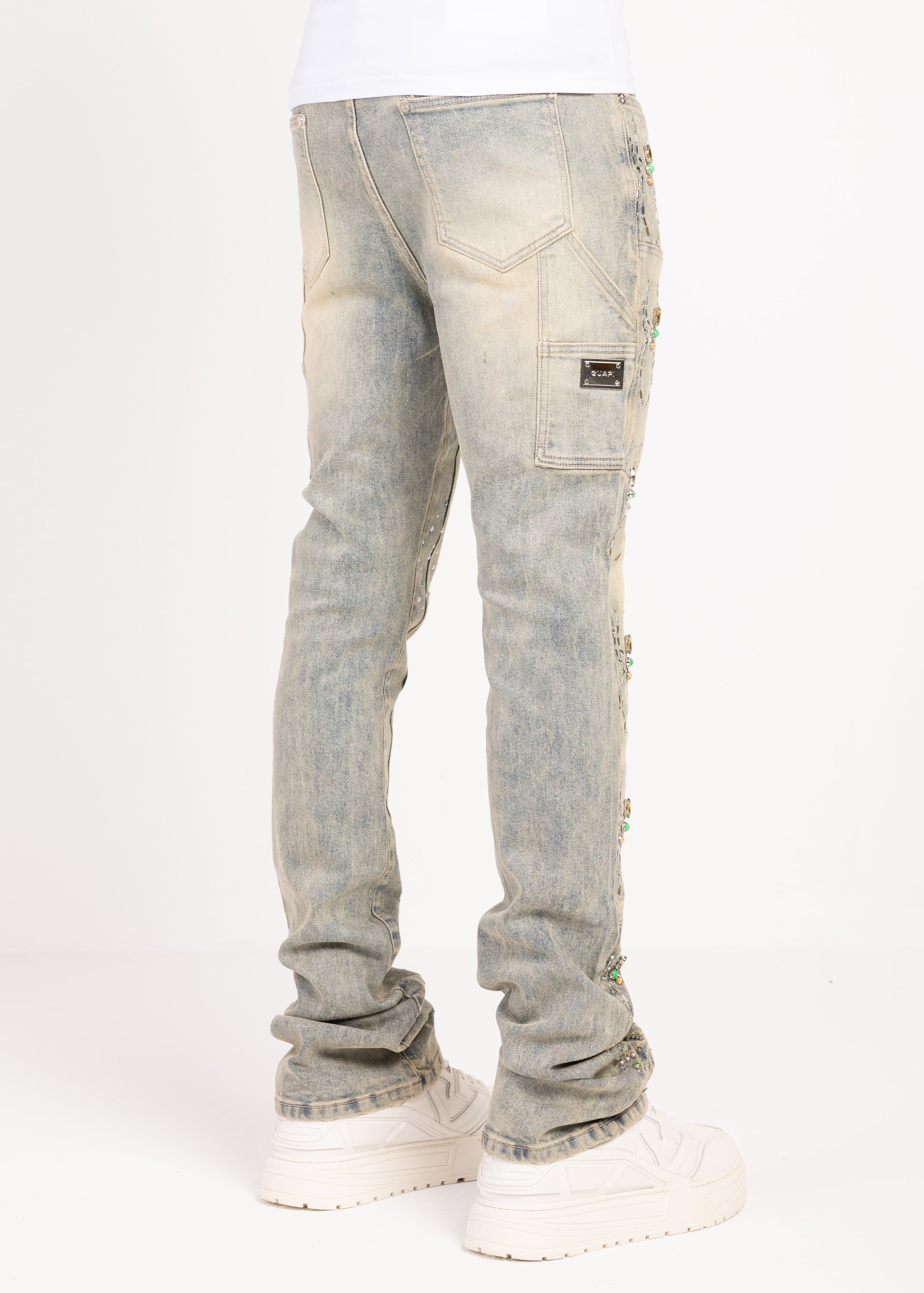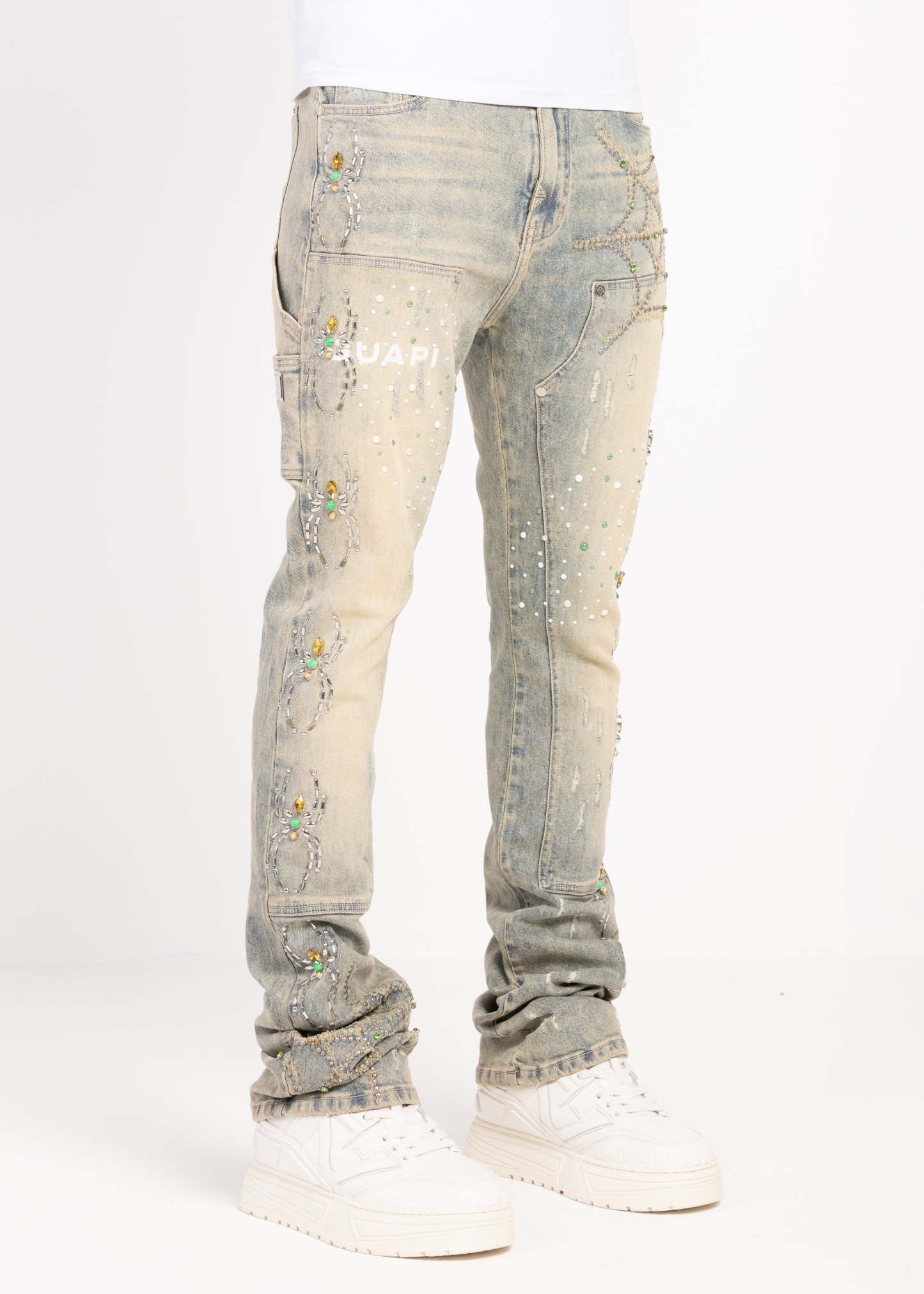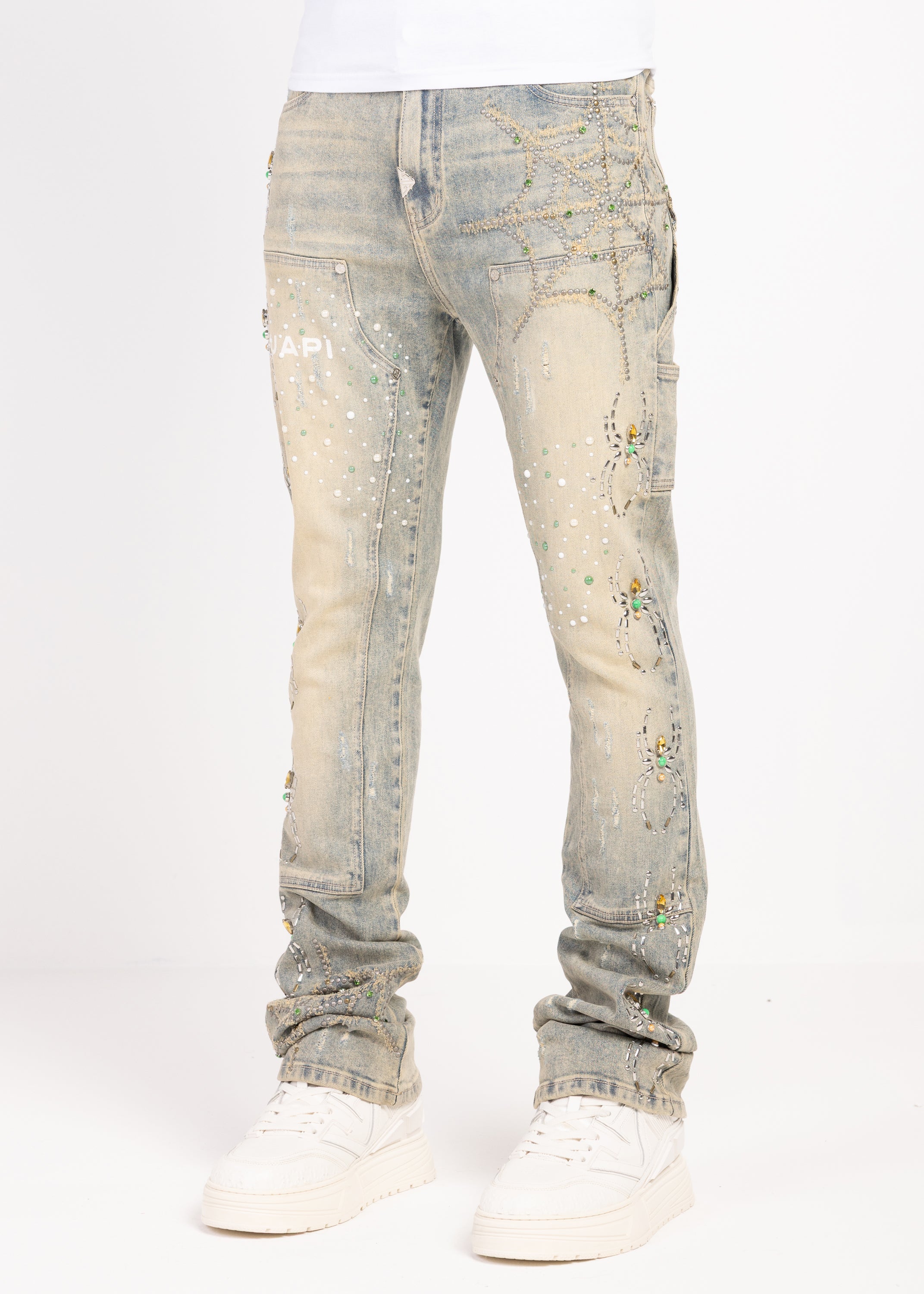 Crafted from premium denim, these statement jeans blend intricate embellishment with elevated streetwear construction. The silhouette is cut in a slim fit with extended length, allowing the fabric to stack naturally at the ankle for a bold, layered finish.