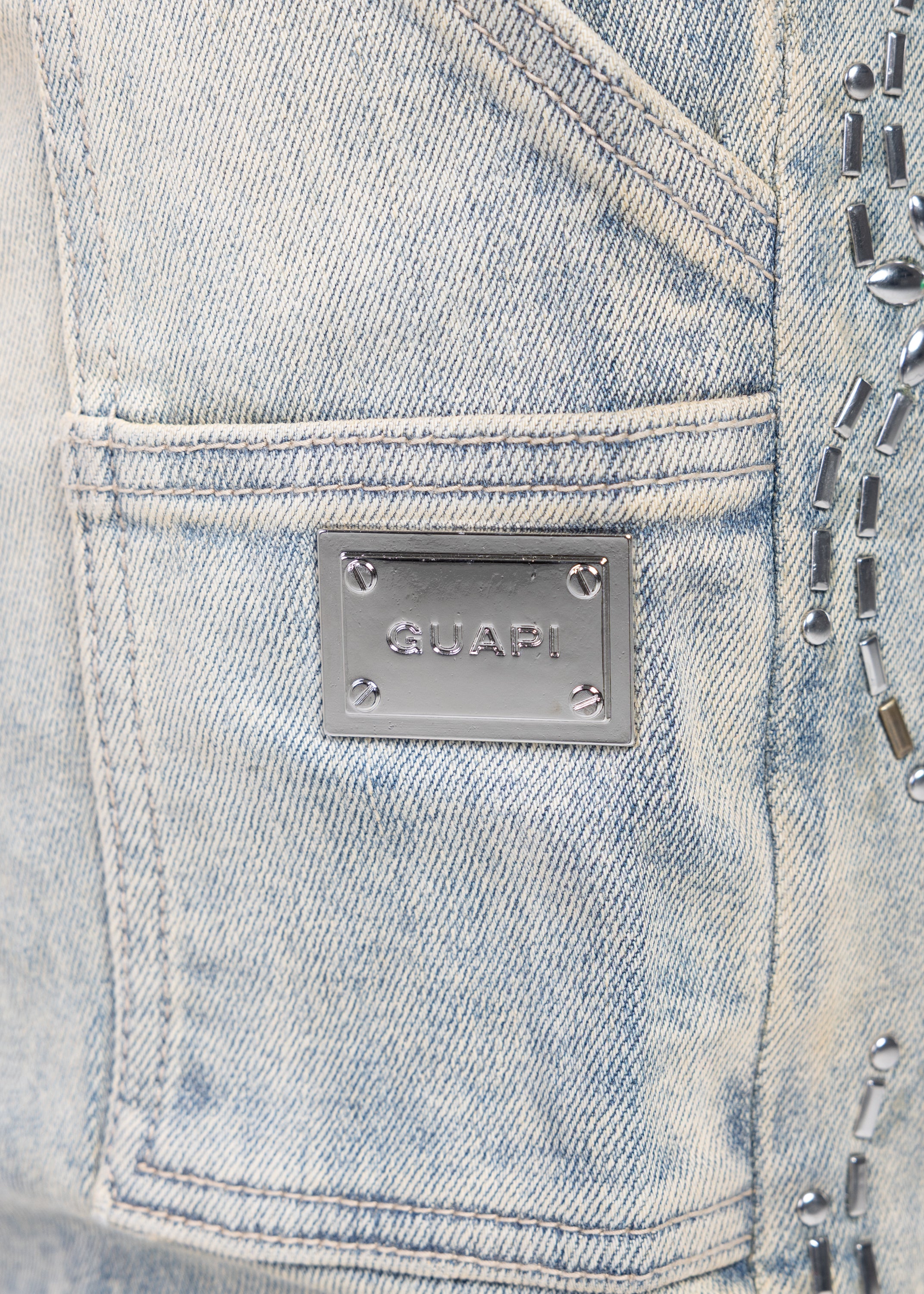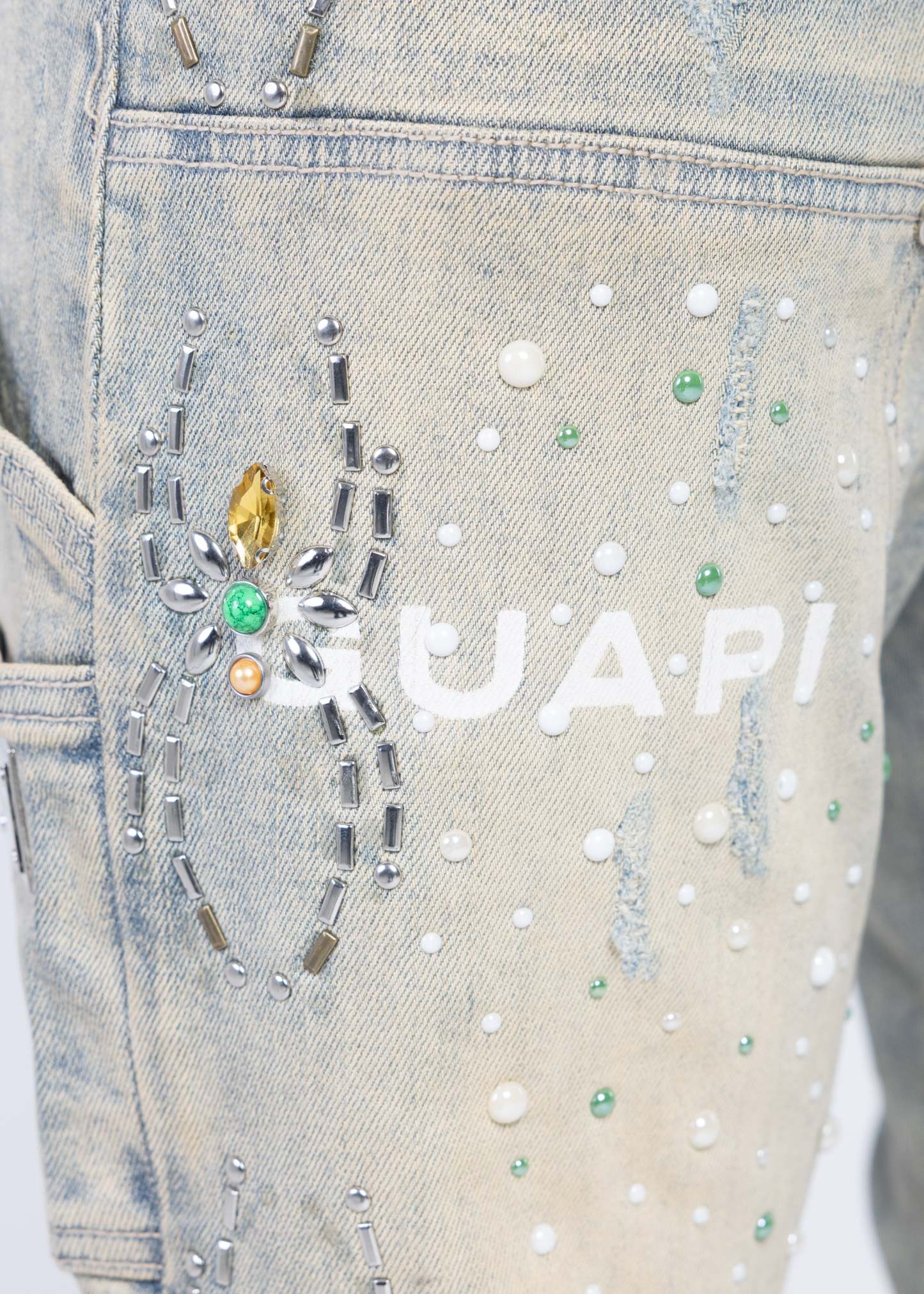 The surface is detailed with hand-placed rhinestones and crystal-style accents arranged in abstract web-inspired patterns and scattered highlights throughout. Additional distressed elements and subtle abrasion effects enhance depth and texture, giving the garment a worn-in yet luxury feel.