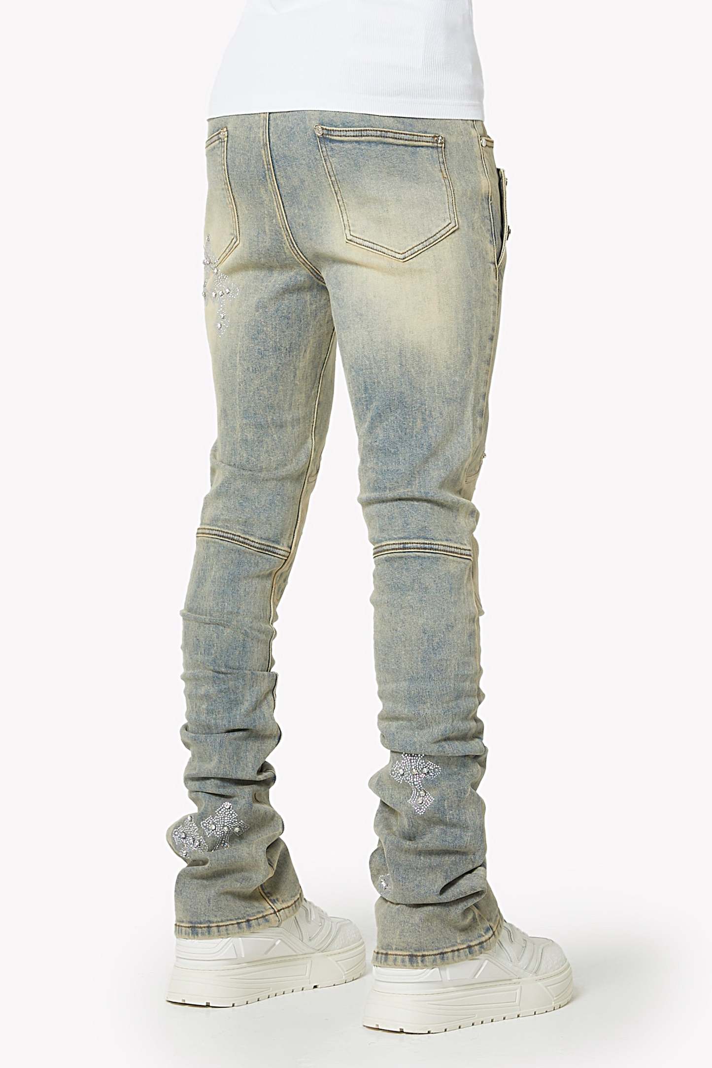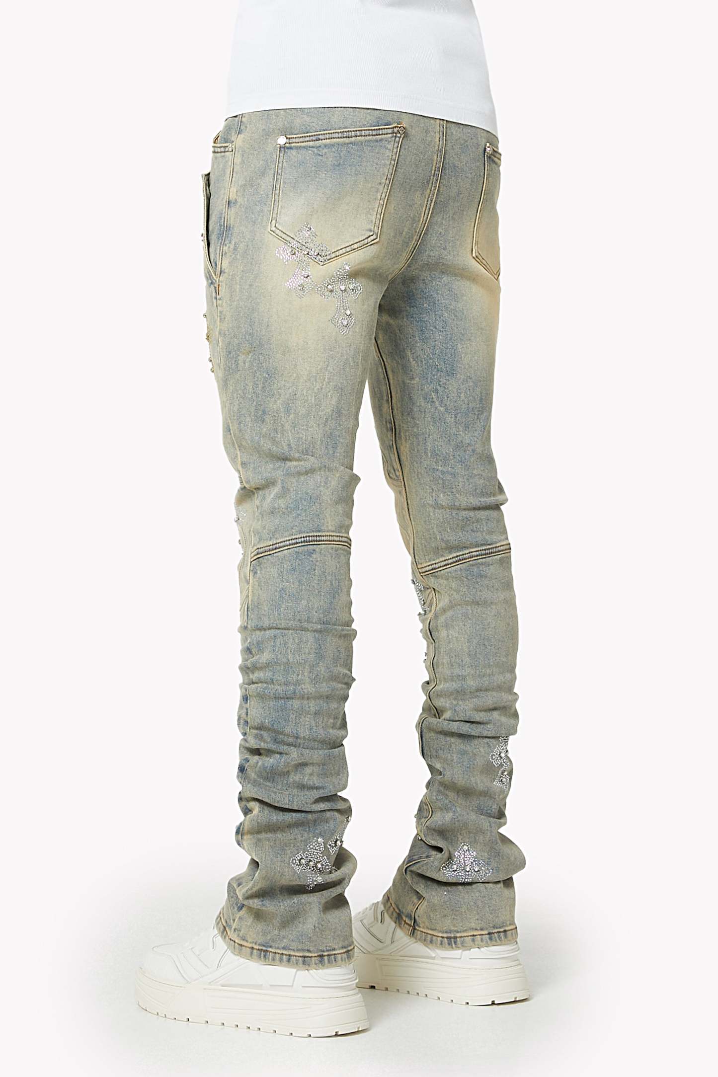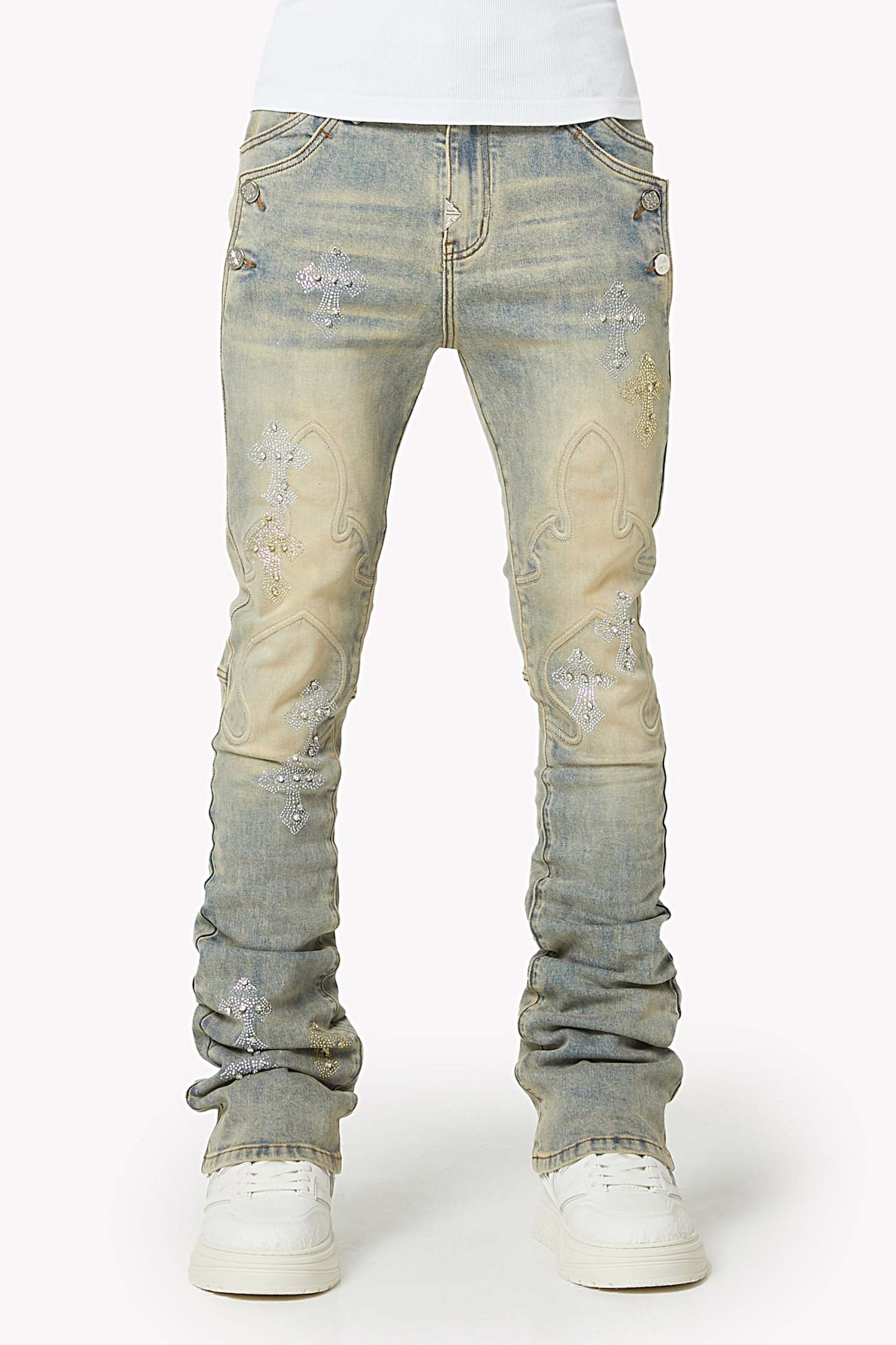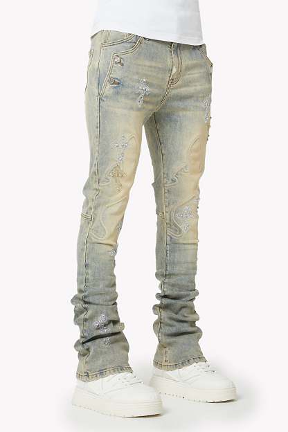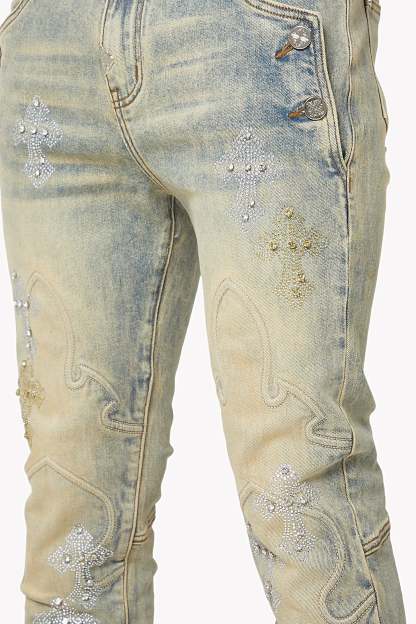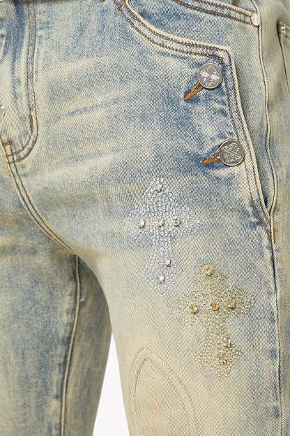 A signature GUAPI silhouette reimagined in a washed-out, sun-bleached finish. The Faded Cross Denim V2 blends vintage tones with sculpted panel work and fully embellished crystal cross motifs. The denim features soft sand-beige fading through the front thigh area, creating a natural gradient into the cooler blue tones along the legs. Stacked ankles give the fit its classic GUAPI drape, while the embroidered cross contours add depth and shape to the overall structure of the jeans. Multi-tone crystal placements of silver and gold bring a full-body shimmer effect, giving the denim a strong statement presence from every angle.