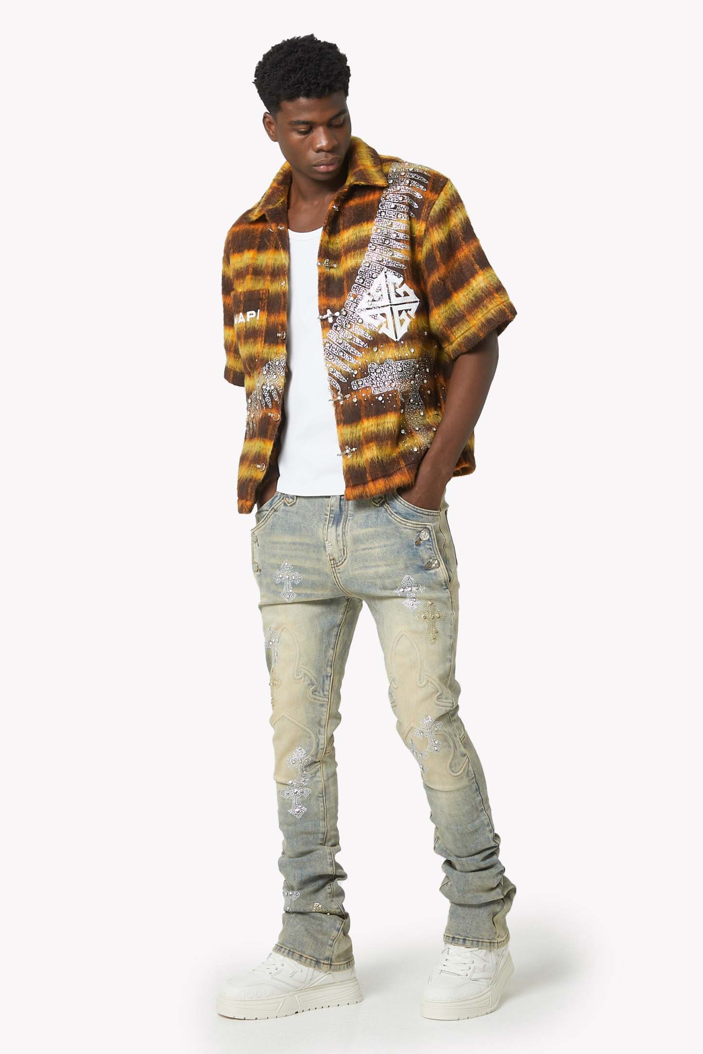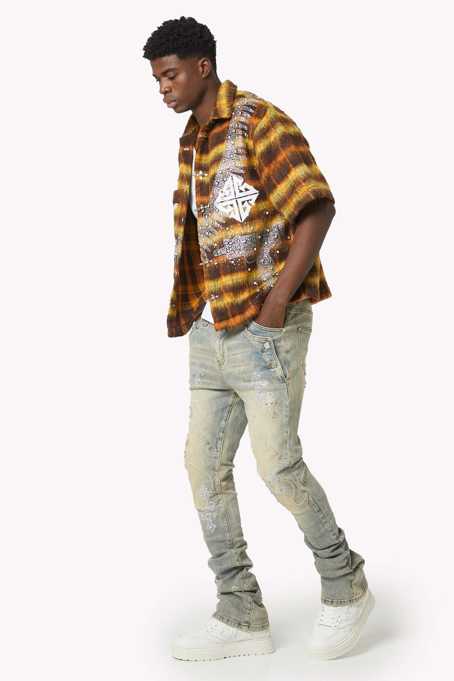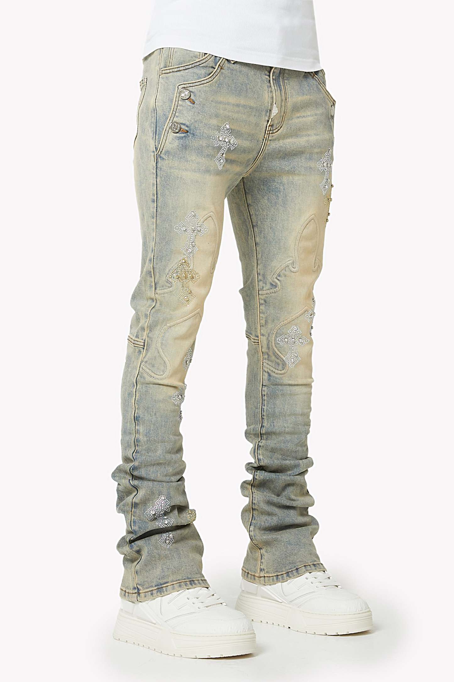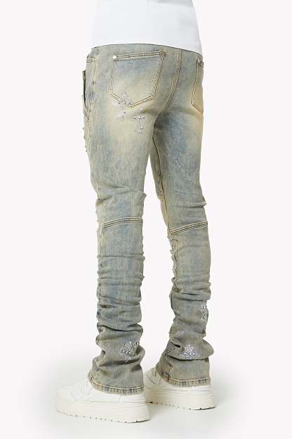 A signature GUAPI silhouette reimagined in a washed-out, sun-bleached finish. The Faded Cross Denim V2 blends vintage tones with sculpted panel work and fully embellished crystal cross motifs. The denim features soft sand-beige fading through the front thigh area, creating a natural gradient into the cooler blue tones along the legs. Stacked ankles give the fit its classic GUAPI drape, while the embroidered cross contours add depth and shape to the overall structure of the jeans. Multi-tone crystal placements of silver and gold bring a full-body shimmer effect, giving the denim a strong statement presence from every angle.