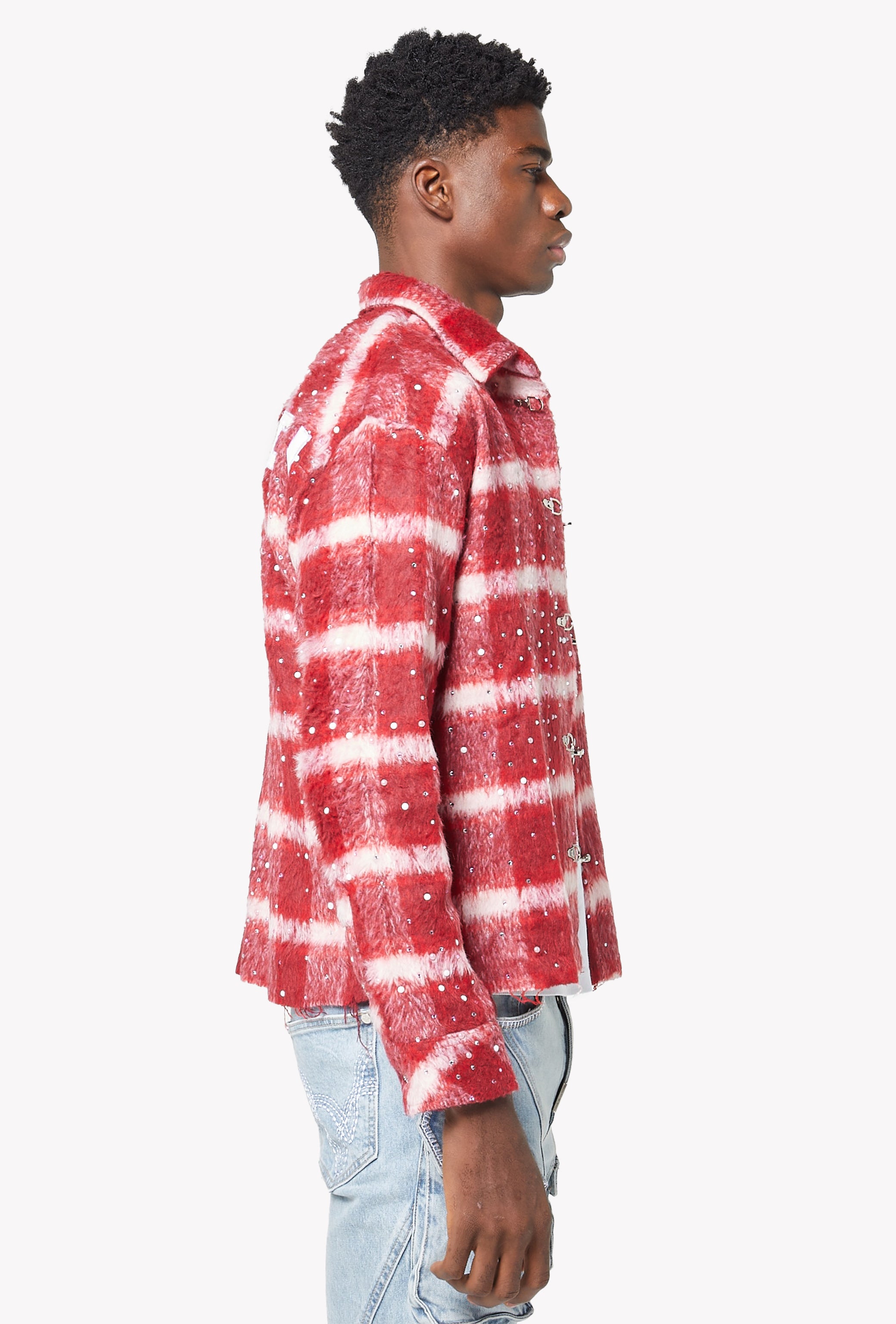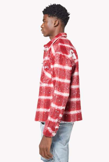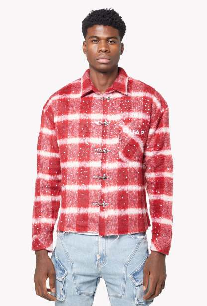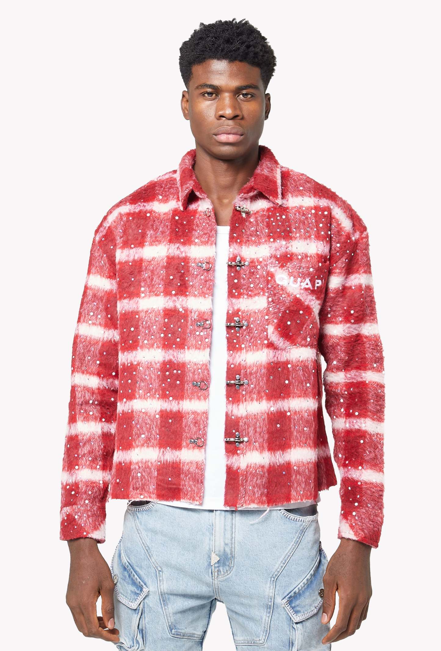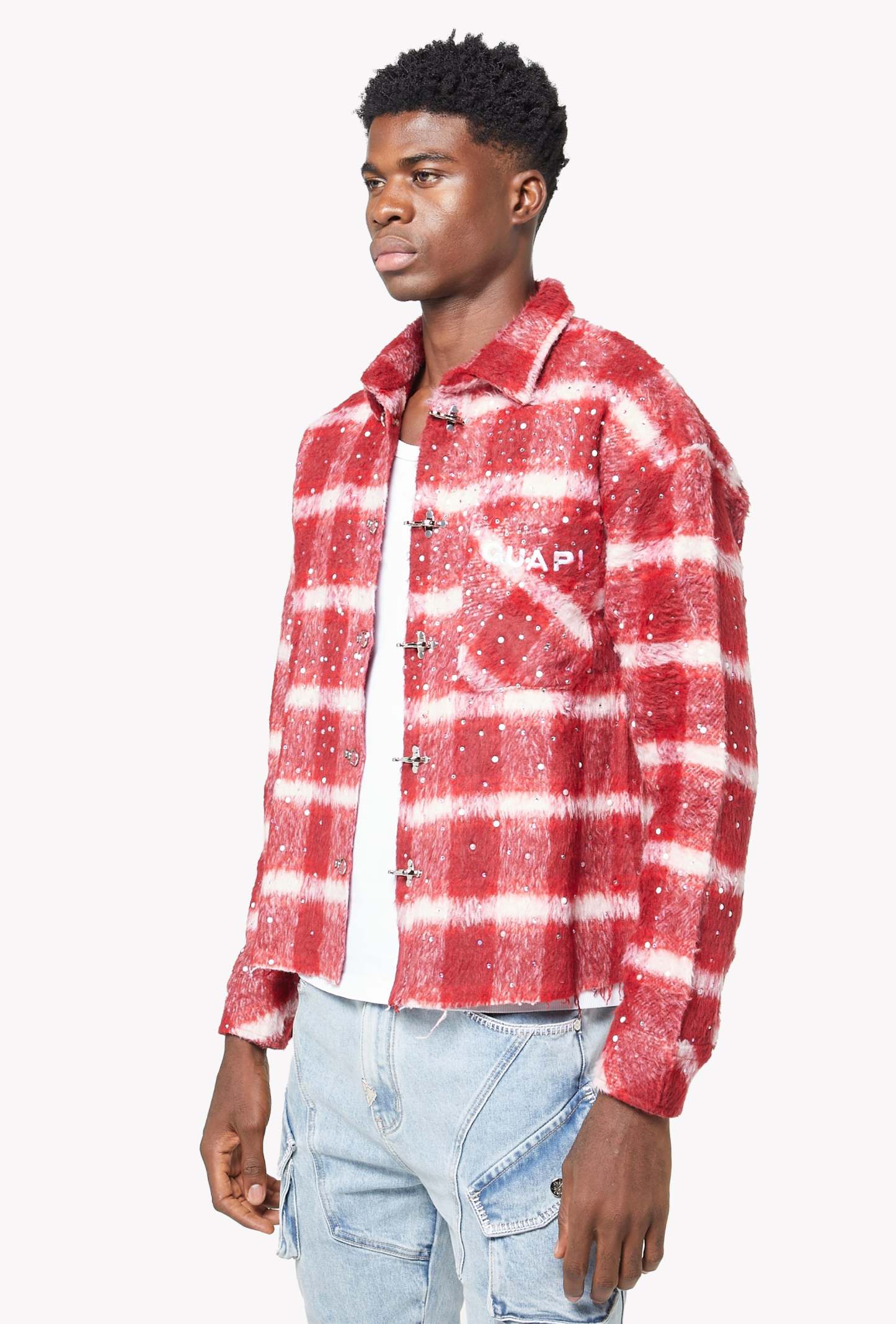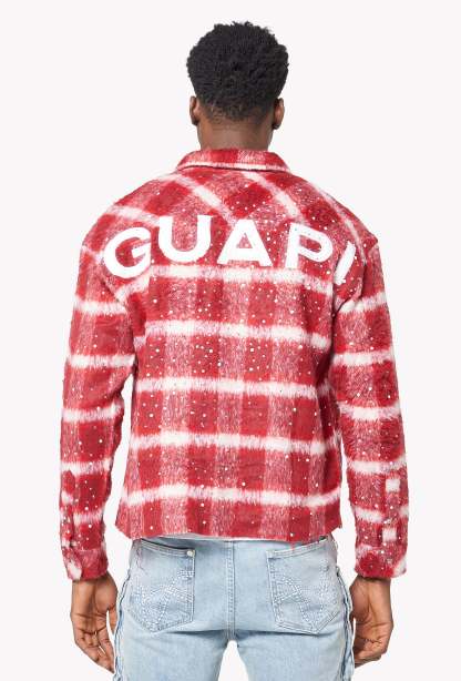 The entire body is embellished with scattered micro-rhinestones, adding a controlled shimmer across the chest, sleeves, and back. Each crystal catches the light, creating a striking contrast against the flannel’s warm texture. The front closure replaces traditional buttons with custom metallic hook clasps, industrial, polished, and unmistakably GUAPI.