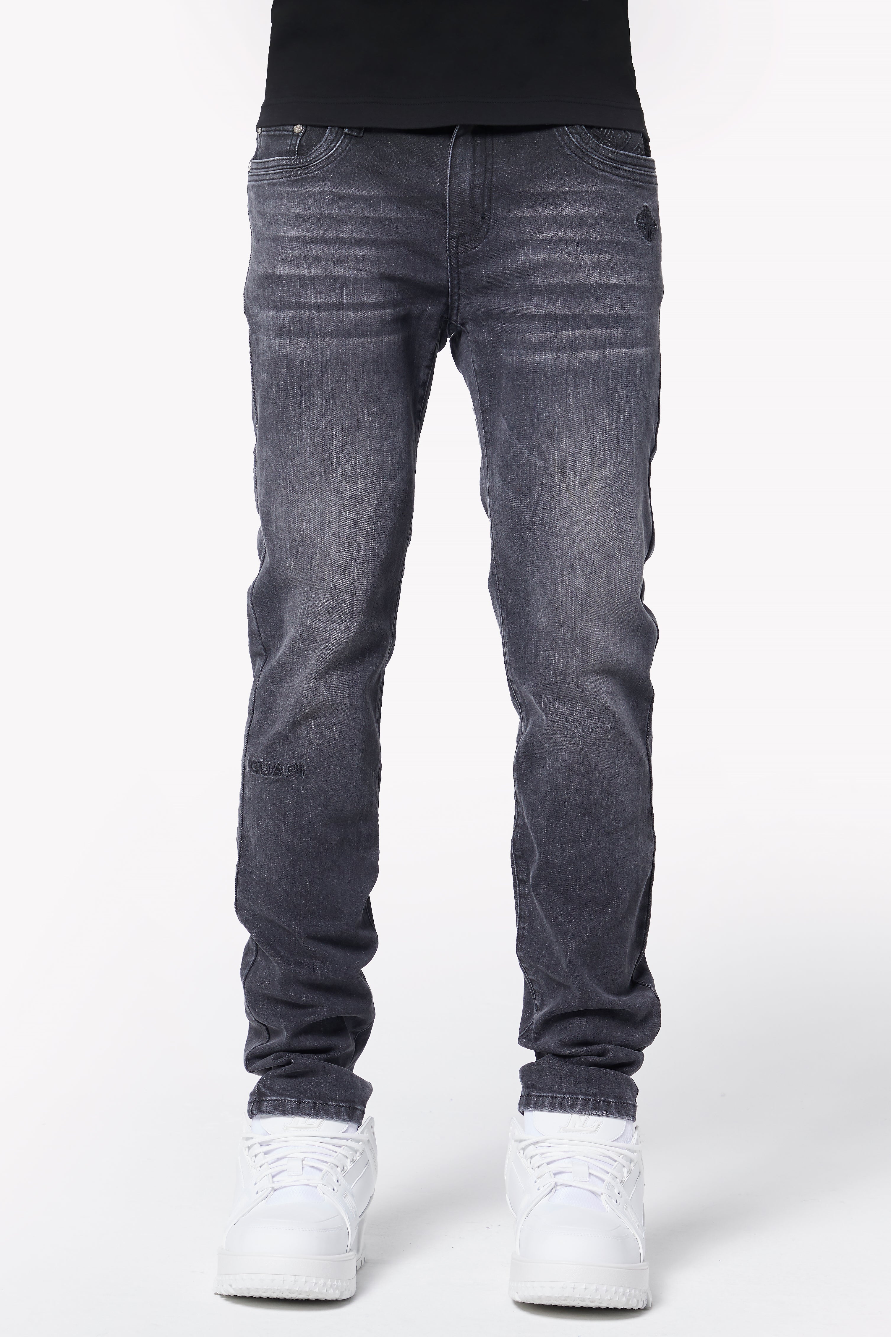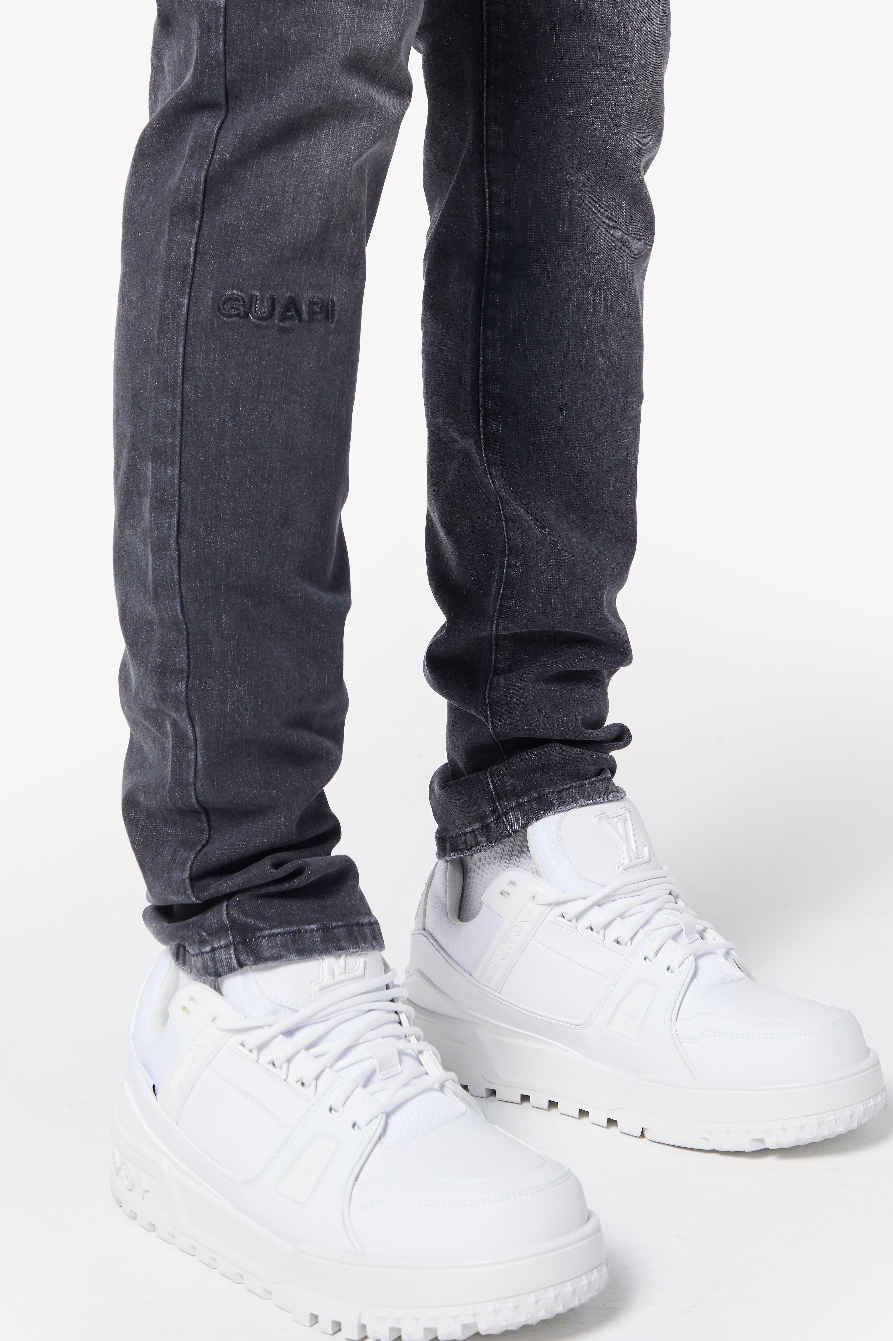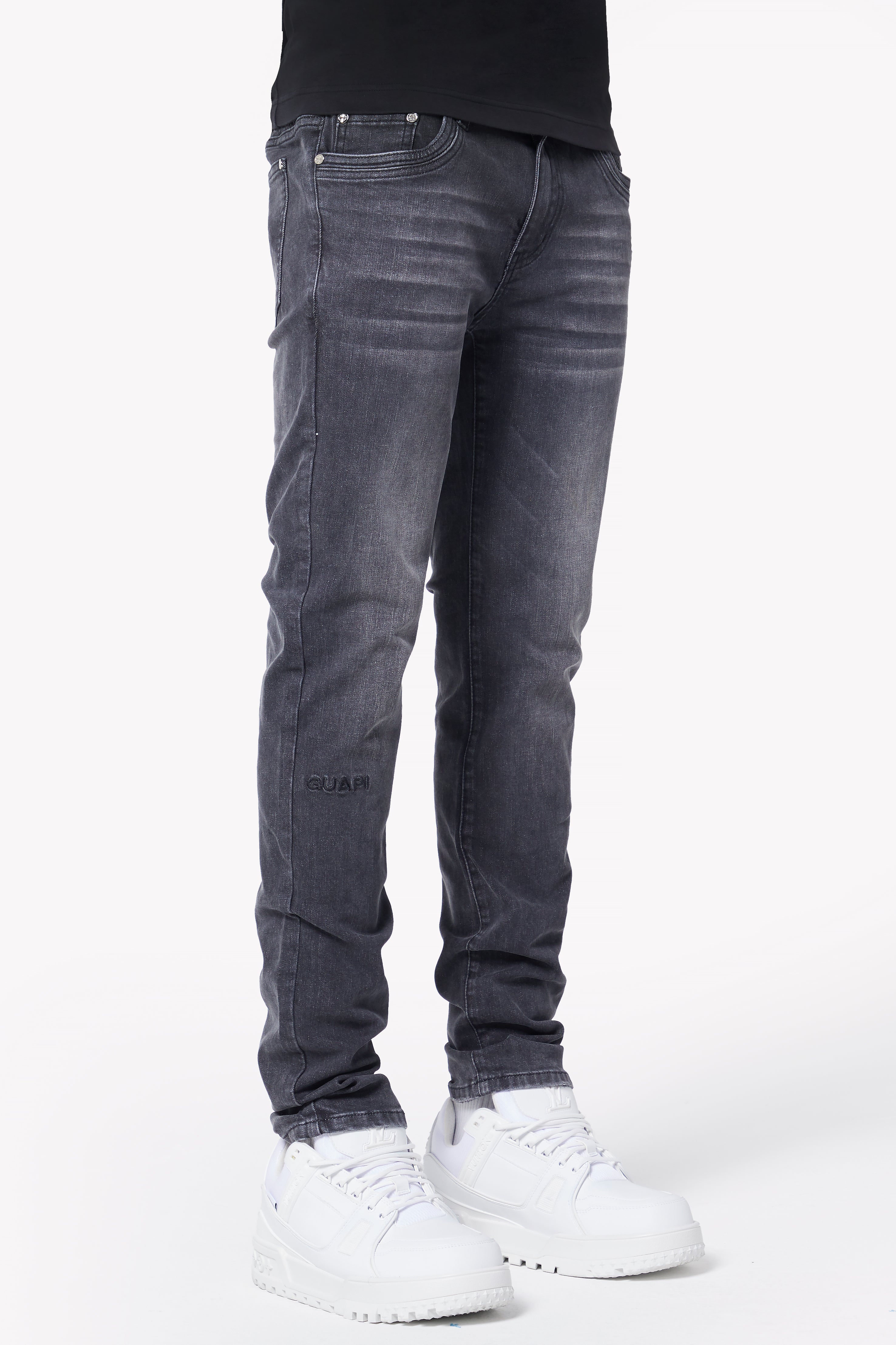 Thoughtful branding details, such as the GUAPI logo embroidered on the lower right leg, an icon embroidered near the front right pocket, and an embossed icon on the back pocket, add a subtle yet stylish edge to this classic piece. Designed with durability and all-day comfort in mind, this denim is perfect for effortless styling on any occasion.