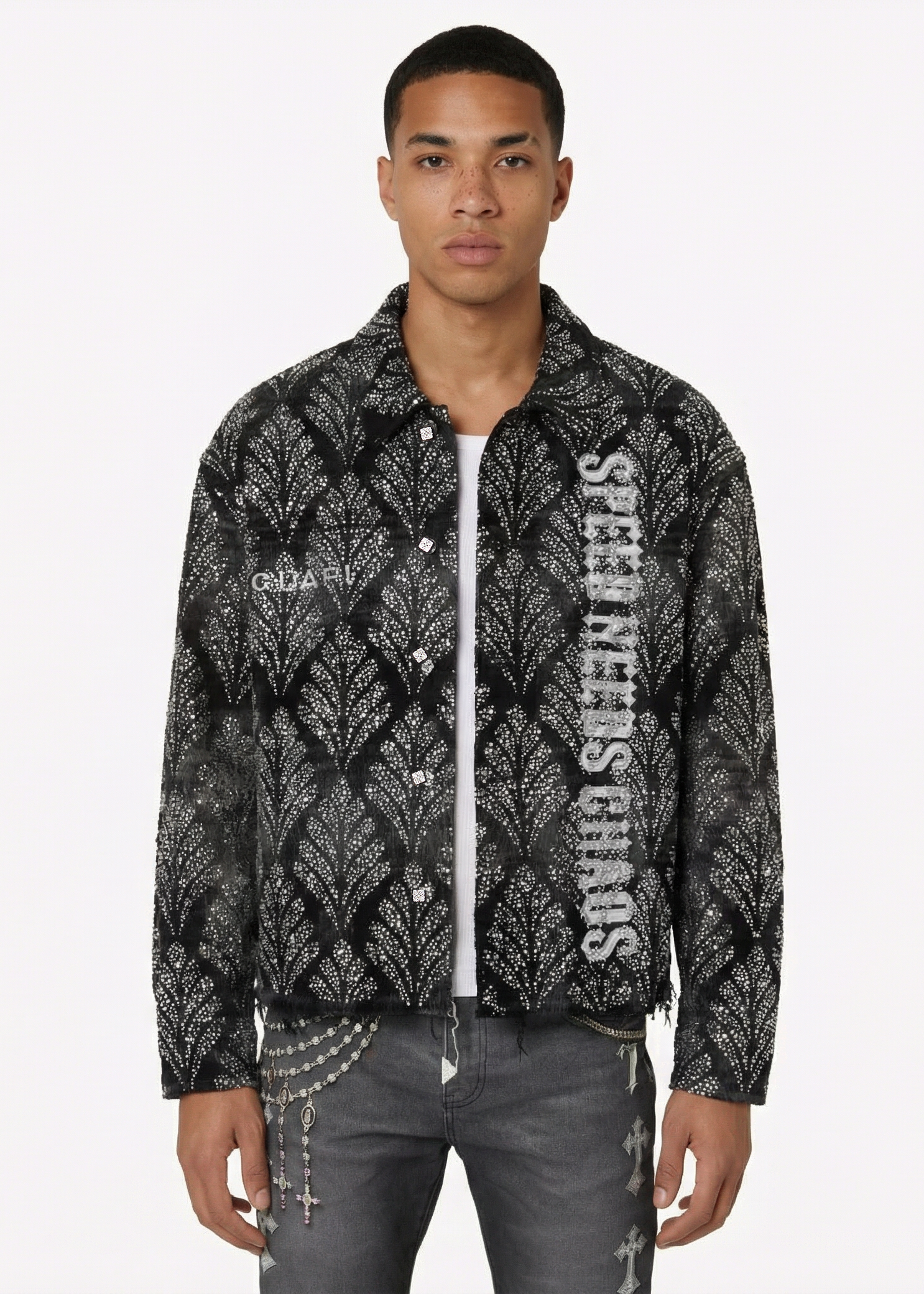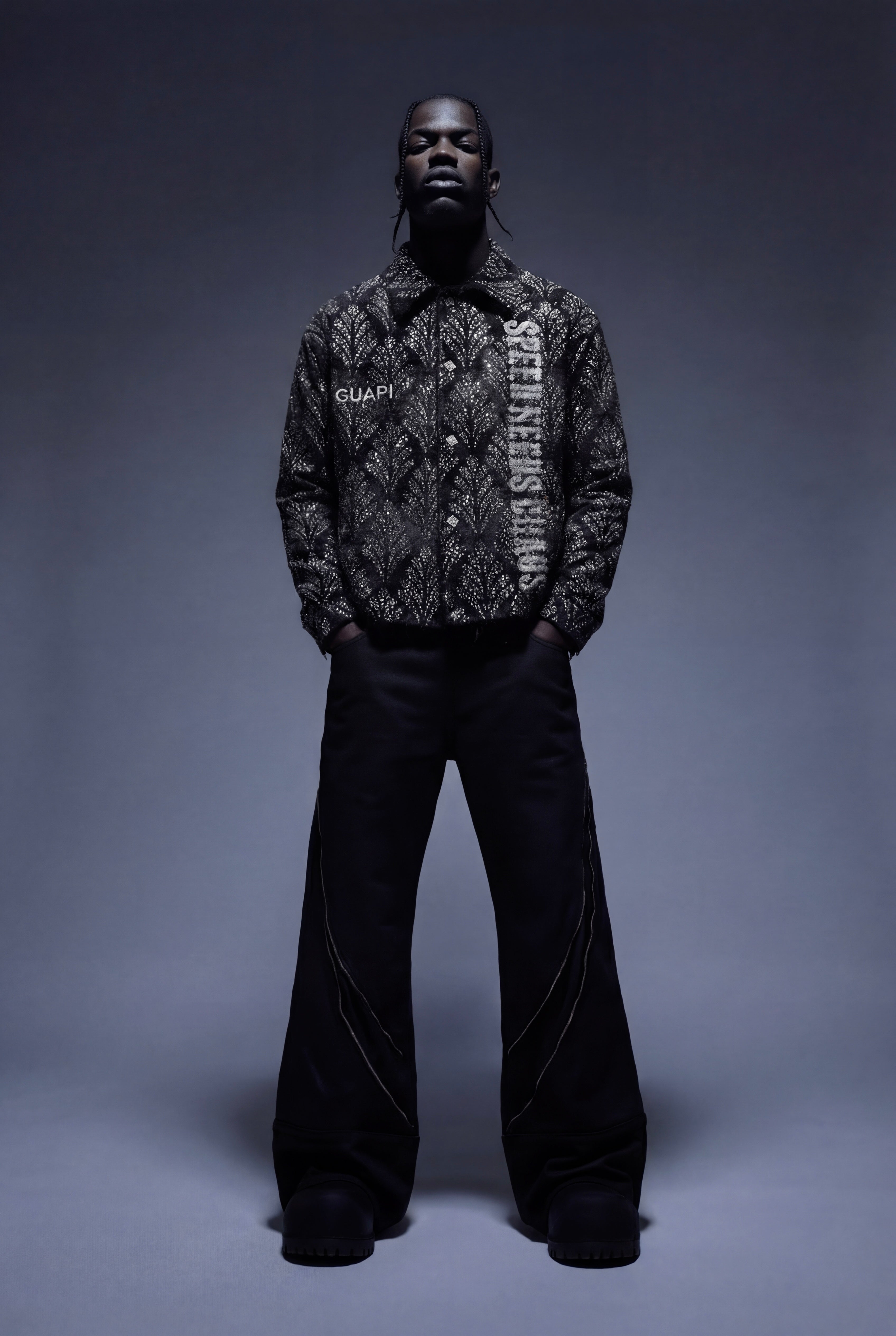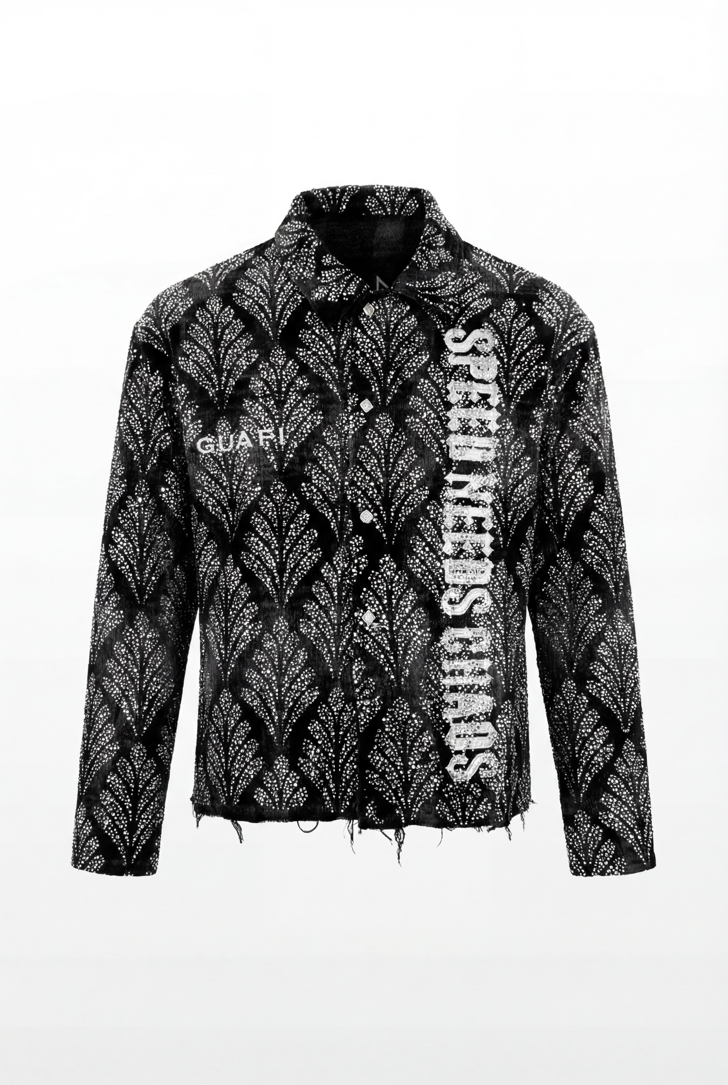 On the front, a bold vertical graphic reads “SPEED NEEDS CHAOS”, cutting through the pattern with raw attitude, while a contrasting GUAPI mark sits on the chest. The back is dominated by a large, cross-shaped emblem, rendered in textured light ink over the embellished surface, giving the piece an almost armor-like presence.